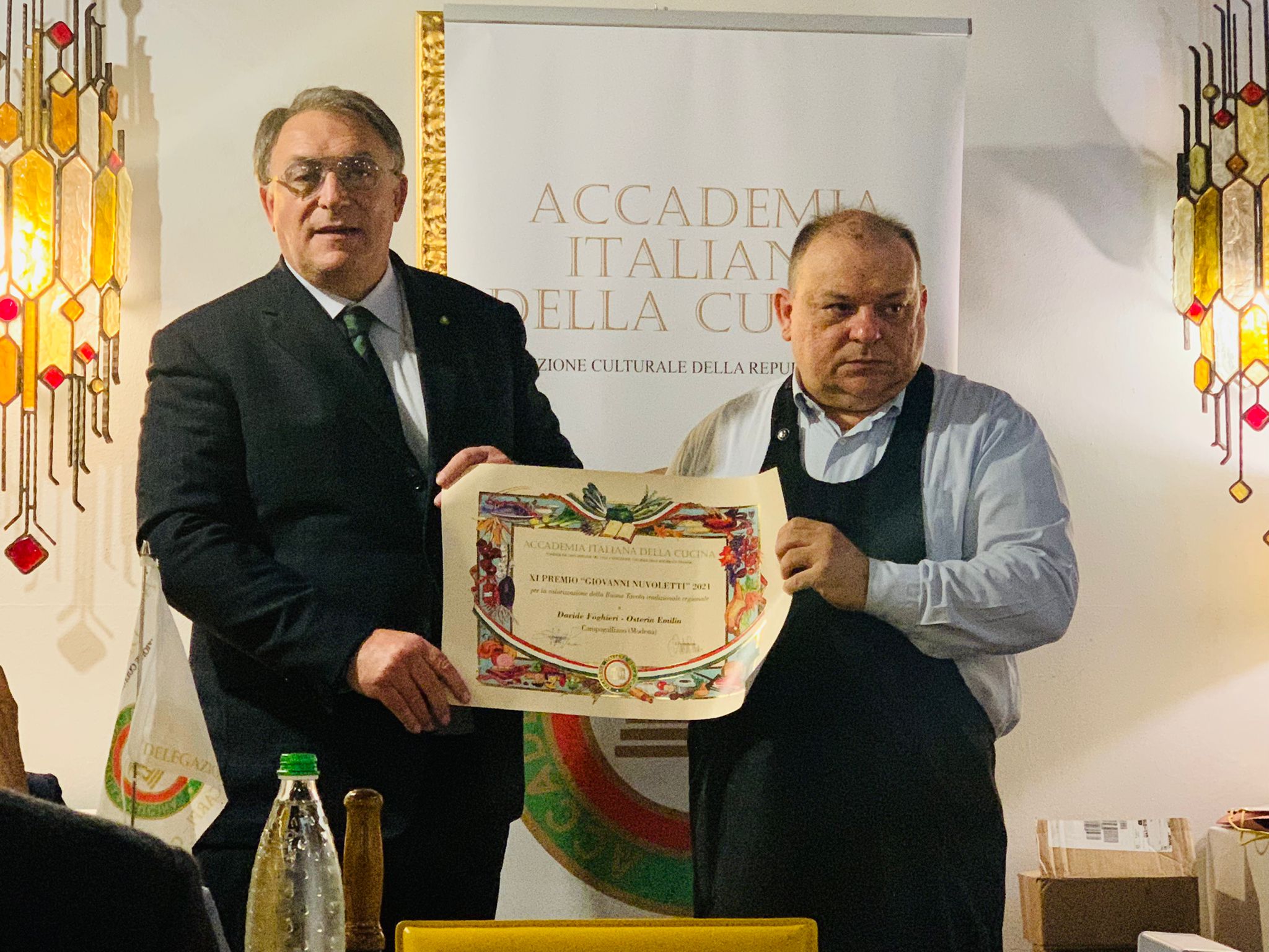 Nel corso della Cena Ecumenica la Delegazione di Carpi-Correggio ha consegnato a Davide Forghieri, patron dell'Osteria Emilia di Campogalliano, il premio "Giovanni Nuvoletti" che annualmente viene attribuito al ristoratore che abbia contribuito in modo significativo alla conoscenza e alla valorizzazione della buona tavola tradizionale regionale. Nel consegnare la pregevole opera grafica, Pier Paolo Veroni, Delegato di Carpi-Correggio e Coordinatore delle Delegazioni dell'Emilia, ha sottolineato l'innovazione portata in cucina dal ristoratore di Campogalliano che riesce a reinterpretare piatti tradizionali con sempre nuove accattivanti variazioni (in foto 1, la premiazione). Durante la serata, gli attori del Gruppo Teatrale Mandriolo di Correggio hanno interpretato alcuni brani del volume edito dall'Accademia "Storia della cucina italiana a fumetti" ed è stato inoltre presentato dal Direttore CST Emilia, Elisabetta Barbolini, il recentissimo volume della Biblioteca di Cultura Gastronomica "Il bosco e il sottobosco. Castagne, funghi, tartufi, frutti di bosco nella cucina della tradizione regionale". In questa speciale occasione sono state consegnate anche le insegne associative al nuovo Accademico Antonio Barone.