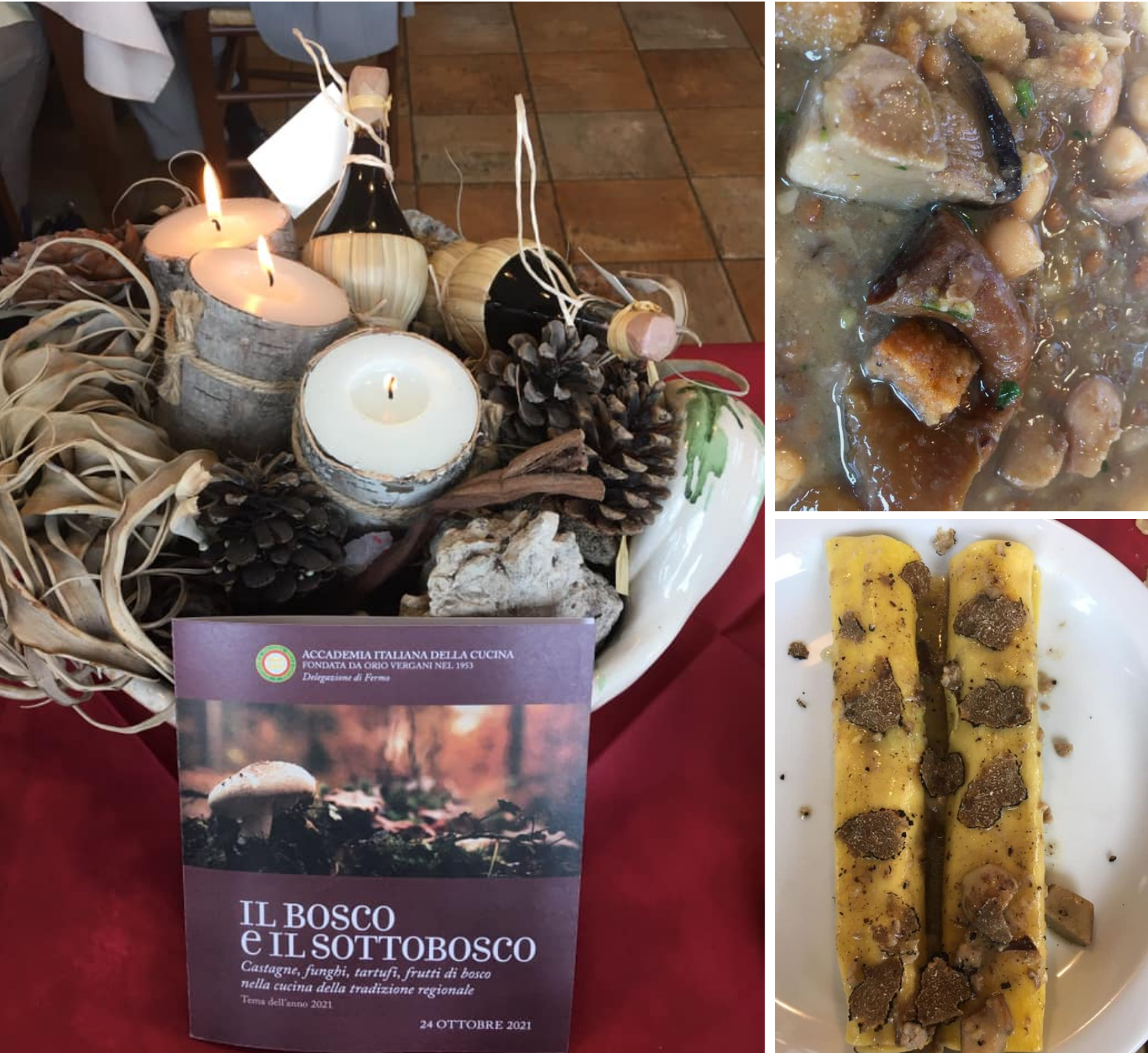 La Delegazione di Fermo, per celebrare il tema dell’anno, ha tenuto un evento ad Amandola, all’interno del Parco Nazionale dei Monti Sibillini e con il patrocinio del Comune stesso. Il Simposiarca per l’occasione è stato Lando Siliquini che ha preceduto il convivio con il convegno ”Passeggiando nei boschi delle magnifiche terre di centro”. Dopo l’introduzione del vice sindaco Pochini, sono seguiti gli interventi del glottologo prof. Augusto Ancillotti e del farmacologo prof. Maurizio Massi. Armando Nanni di Amatrice, Presidente dell’associazione Le Magnifiche Terre di Centro, ha lanciato la proposta di un museo diffuso della Dieta Mediterranea da realizzare nei due parchi, Sibillini e della Laga. Ugo Bellesi, Delegato di Macerata, ha dissertato sull’utilizzo dei funghi nella gastronomia marchigiana, mentre il prof. Tommaso Lucchetti ha tracciato la storia dell’utilizzo del tartufo nella regione. Giovanna Pieroni, cuoca del ristorante La Gorbe e L’Ua, ha deliziato poi i convenuti con un ricco menu della più stretta tradizione della cucina dei Sibillini: uova strapazzate e polentina al tartufo bianco, zuppa di S. Martino, le fregnacce amandolesi con salsiccia funghi e tartufo nero, ravioli di ricotta e cicoria selvatica ai funghi prugnoli, stinco di vitello al tartufo nero e porcini arrosto. Torte di mela rosa e crostate di fichi, more e noci, vino cotto, castagne in chiusura.