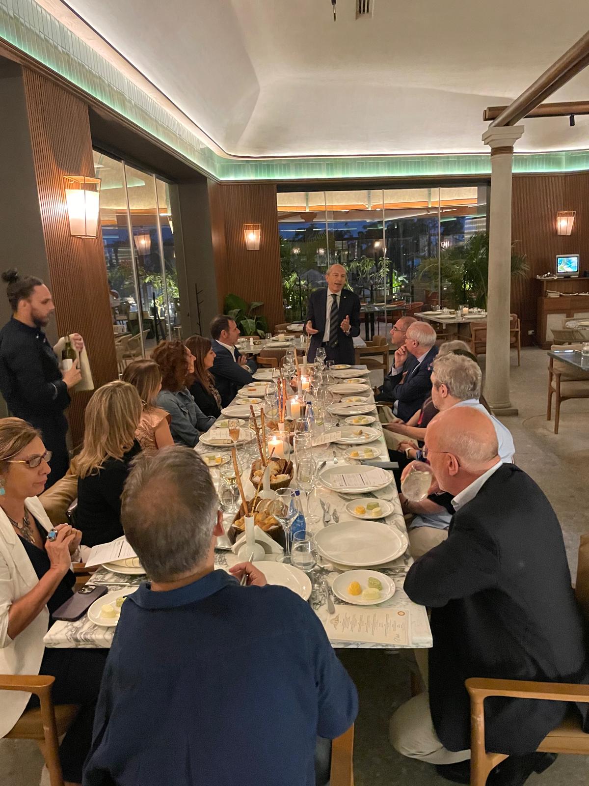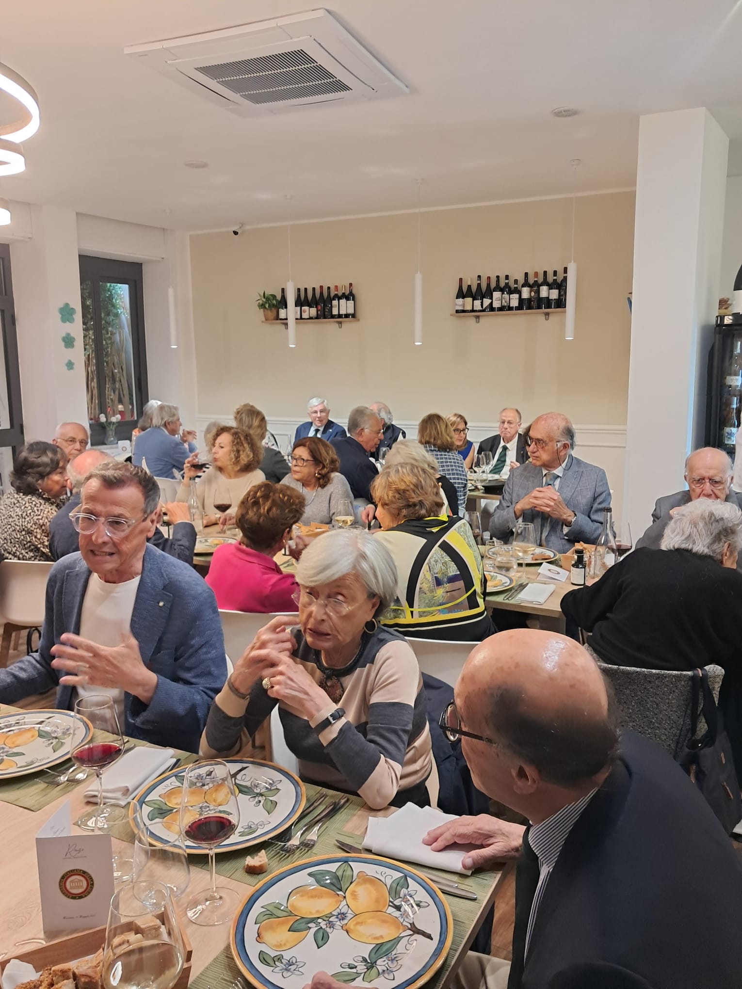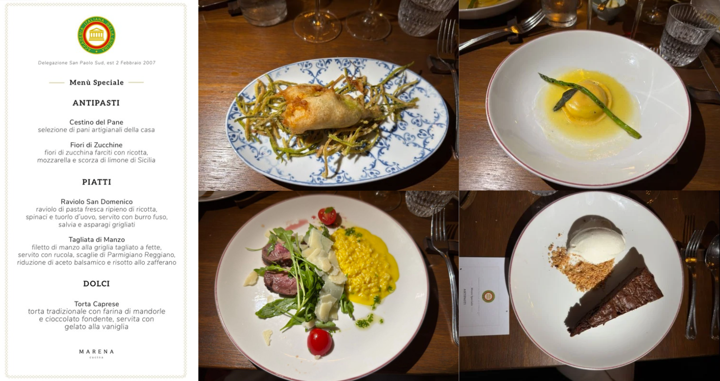 La cena conviviale con 20 partecipanti al ristorante Marena Cucina si è rivelata un’esperienza straordinaria. Si è svolta in un elegante salotto privato al secondo piano del ristorante, un ambiente raffinato e accogliente. Nel menu, una selezione di piatti deliziosi: fiori di zucchine, il Raviolo San Domenico servito con burro fuso, salvia e asparagi grigliati, una tenerissima tagliata di manzo alla griglia con rucola, scaglie di parmigiano reggiano e riduzione di aceto balsamico, oltre a un profumato risotto allo zafferano. In chiusura, una deliziosa torta caprese accompagnata da gelato alla vaniglia. Anche la selezione dei vini ha saputo esaltare ogni portata. Ad arricchire la serata, l’Accademica Renata Fantini Delmanto ha condiviso le interessanti storie legate ai piatti serviti, rendendo l’esperienza ancora più memorabile.