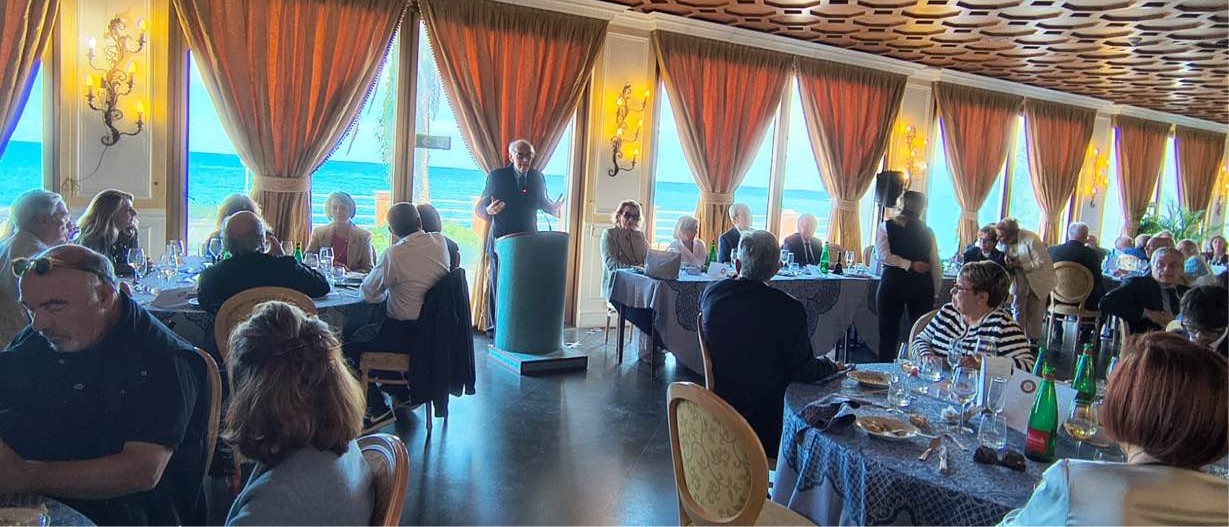 Per la riunione conviviale del mese di maggio, la “Maggiolata” di ispirazione carducciana, è stata scelta una location di grande suggestione: il Ristorante “Borgo Antico”, realizzato in un’antica struttura e situato nel borgo storico di Grottammare Alta, da cui si gode un panorama mozzafiato. La scelta è ricaduta su questa sede non solo per la bellezza del luogo, ma soprattutto per la nota maestria dello chef Lamberto Langiotti, che realizza i suoi piatti affidandosi esclusivamente alla tradizione del territorio, conquistando così l’apprezzamento unanime dei partecipanti. Tra i piatti più apprezzati, si segnalano i paccheri - pasta sofisticata e genuina prodotta da un pastificio locale - con guanciale croccante, asparagi, carciofi e piselli, e, ancor più, il maialino cucinato a fuoco lento per ben 12 ore. Ottimo anche il vino, fornito da una piccola cantina operante a pochi chilometri dal ristorante, che ha incontrato il favore generale. Il titolare, presente alla serata, ha illustrato le qualità organolettiche dei propri vini, esprimendo soddisfazione per aver ottenuto riconoscimenti sia per i vini rossi sia per i bianchi. Per il menu, preparato con la collaborazione del valido simposiarca Giancarlo Coccia, il Delegato Vittorio Ricci ha consegnato allo chef Lamberto il piatto commemorativo in simil argento dell’Accademia, con grande soddisfazione del premiato.