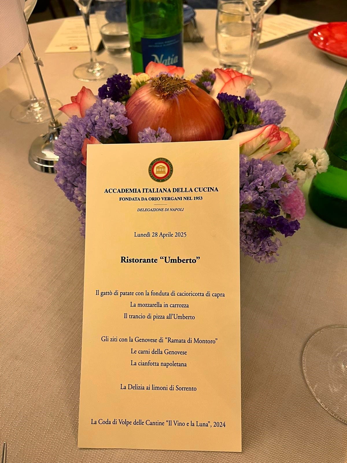 La “Genovese è meglio 'e Pelè” è stato l’argomento della riunione conviviale di aprile della Delegazione Napoli. Il sugo dorato a base di carne e di cipolle della tradizione napoletana è stato magistralmente preparato dal ristorante “Umberto” che ha centrato il tema sin dalla scelta di una composizione floreale sormontata da una “Ramata di Montoro” quale centrotavola. Dalla possibile provenienza ginevrina (in francese Ginevra è Genève) a quella secondo cui a chiamarsi Genovesi sarebbe il monzù partenopeo che l’ha inventata, a far chiarezza sulle origini controverse di questo piatto napoletano dal nome ingannatore è stato l’Accademico Gianmaria Brunese. L’unica certezza? La modalità di preparazione della carne che non va mai rosolata per consentire il rilascio degli umori nel sugo. Decisamente non ai margini anche gli altri piatti presentati nella rassicurante sala con alle pareti quadri surrealisti evocativi della città di Napoli. A spiccare, il gattò di patate, piatto più che tradizionale casalingo, di cui si è apprezzata la presenza nel menù.