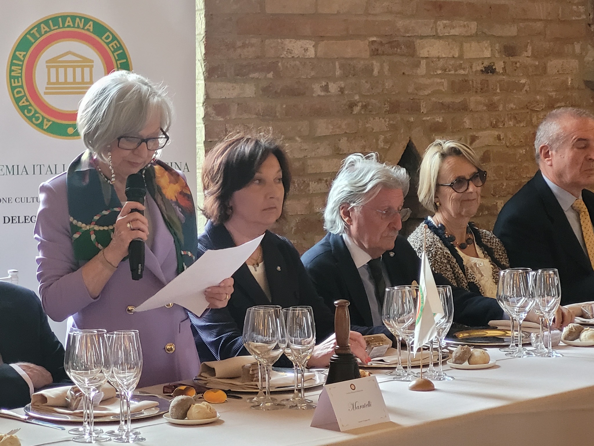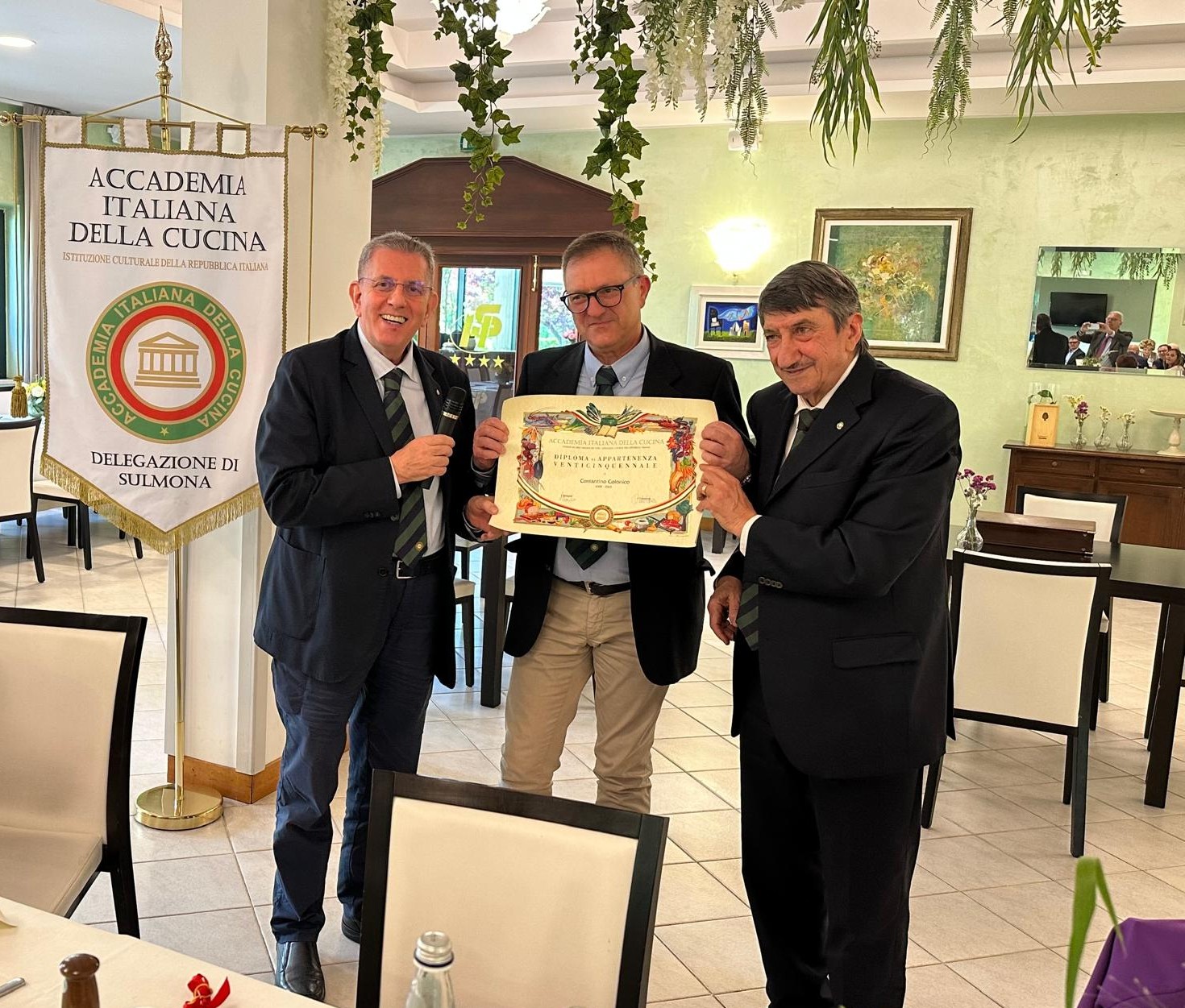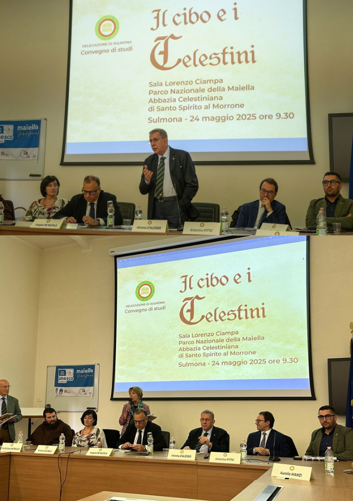 La Delegazione di Sulmona ha tenuto un interessante convegno dal titolo “Il cibo e i Celestini”. La manifestazione si è tenuta nella splendida Abbazia Celestiniana di Santo Spirito al Morrone. L'evento ha rappresentato un approfondimento tra storia, cultura monastica, tradizioni alimentari e ruolo dei conventi nel tramandare saperi legati all'alimentazione, alla salute ed alla sostenibilità. Alla fine dei lavori si è tenuta una riunione conviviale a tema presso il ristorante dell’Hotel Santacroce Meeting. La Simposiarca Rosa Giammarco, unitamente ai cuochi Antonella e Domenico, ha scelto un menù a base di erbe raccolte negli stessi luoghi narrati dal convegno e che, probabilmente, costituivano il cibo dei monaci Celestini. In questa importante occasione, il Vice Presidente Vicario Mimmo D’Alessio ha consegnato all’Accademico Costantino Colonico il distintivo e l’attestato per i 25 anni di appartenenza accademica.