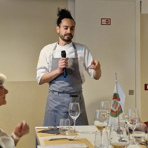 La quarta conviviale del 2025 si è tenuta presso il ristorante L’Orto in Cucina, gestito dalla Cooperativa Sociale Gerico, il cui obiettivo è restituire dignità attraverso il lavoro a giovani in situazioni di svantaggio o a persone da reinserire nella società. A capo di questo ampio e significativo progetto c’è Giovanni Ruggieri, nato a Betlemme, che ha lasciato le cucine dei ristoranti stellati per abbracciare questo progetto che è anche un progetto di una vita diversa, dedicata sì alla cucina, ma anche al bene di chi dalla vita non ha avuto quello che per tutti noi è considerato “normale”. Oltre al ristorante, Ruggieri ha realizzato un orto di 7.000 mq e un laboratorio per la produzione e vendita di pasta fresca, pasta ripiena, pane e focacce, tutti prodotti con lievito madre. Piatti ben eseguiti, dai sapori netti, con accostamenti indovinati e presentazioni eleganti, quasi in contrasto con l’ambiente e la mise en place essenziali. Lo champagne ha accompagnato bene ogni portata stemperando il sapore ferroso degli asparagi. Durante la serata, il cuoco ha illustrato con passione e curiosità la preparazione di ciascun piatto. Elisabetta Cocito ha arricchito la serata parlando della storia antica degli asparagi e del riso Razza 77, recentemente riscoperto. A conclusione della conviviale, il cuoco ha condiviso alcune delle sue esperienze professionali, tra cui le collaborazioni con la rivista La Cucina Italiana, con Davide Oldani e, più recentemente, con Alessandro Borghese.