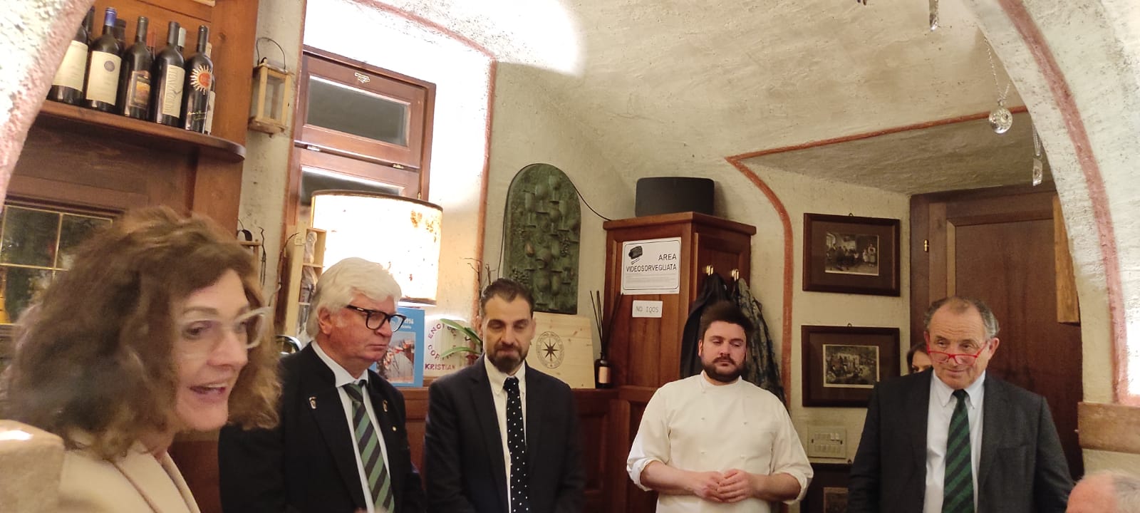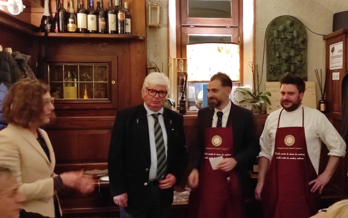 Gli Accademici e gli ospiti sono stati accolti presso l’Antica Trattoria Ugolini dai nuovi gestori, “Quelli di Bacco”. Da decenni la Trattoria si distingue per i suoi piatti tipici legati alla tradizione sammarinese, ma anche romagnola e marchigiana: pasta fatta in casa ogni mattina, ricette stagionali – dal baccalà ai condimenti con porcini o tartufo – e dolci sempre freschi, preparati con cura. In questo contesto storico, i prodotti del territorio seguono il naturale ciclo delle stagioni, facilitando la ricerca della qualità. “Quelli di Bacco” hanno offerto agli Accademici un’esperienza gastronomica completa e immersiva, cercando un equilibrio tra classicità e creatività, con l’intento di promuovere, valorizzare e rinnovare la cultura culinaria italo-sammarinese. La serata è iniziata con la cerimonia di consegna delle insegne dell’Accademia ai nuovi Accademici Carlotta Amadori, Riccardo Tentoni e Oscar Fabbri. Il gradimento è stato buono: apprezzato il tocco innovativo dello chef, in particolare nel risotto con granceola, funghi e provolone piccante e nella mousse di mandarino con crema inglese e sfoglia al cioccolato. Il servizio di sala, pur corretto, non ha riscosso particolare entusiasmo. Ottimo, infine, il clima amichevole e garbatamente cordiale che ha accompagnato la serata, rendendo il convivio particolarmente piacevole.