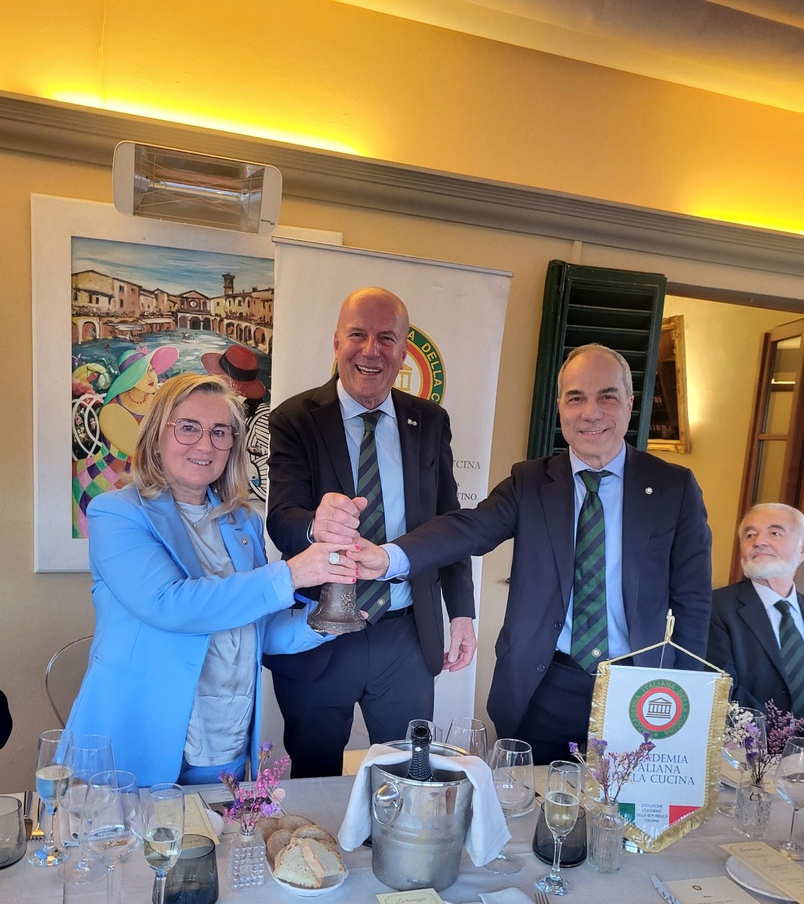La cerimonia del “passaggio della campana” si è tenuta alla presenza di Roberto Vasarri, Coordinatore Territoriale Toscana Est e Delegato del Valdarno Aretino, e degli Accademici del Valdarno Fiorentino. L'evento si è svolto presso il ristorante La Terrazza OliOsteria di Greve in Chianti. Sandro Fusari, Delegato uscente, ha ringraziato Roberto Vasarri per la sua presenza, ha introdotto il Simposiarca Andrea Barocchi e ha presentato Roberta Ceppatelli come nuova Delegata. L'ambiente esclusivo e raffinato, con vista sui tetti degli storici palazzi, sul tramonto unico e sulla statua di Giovanni da Verrazzano, che a Greve ebbe i natali, ha contribuito all'atmosfera gioiosa della serata. Il Simposiarca Andrea Barocchi, in accordo con lo chef, ha proposto un menù di pesce con abbinamenti non scontati e un'esperienza di gusto con nuovi equilibri. La serata si è conclusa con i complimenti del Simposiarca e di tutti gli Accademici allo chef Stefano Bertini e alla sua brigata per l'ottima cena. Allo chef è stato donato il piatto commemorativo dei 70 anni dell'Accademia.