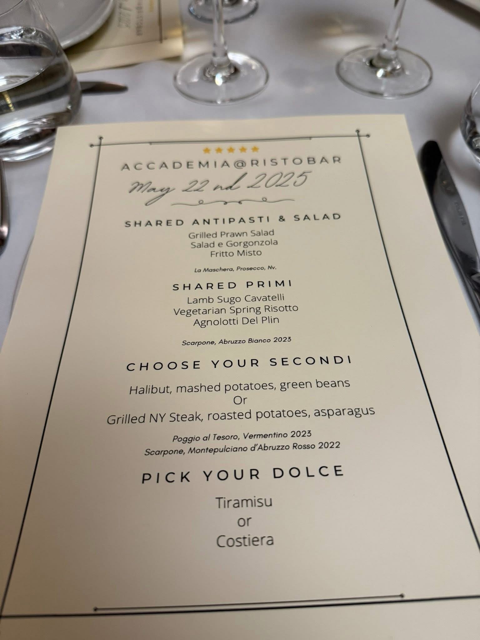 Cena di altissimo livello della Delegazione di San Francisco presso il Ristobar di Gary Rulli, nel cuore di San Francisco. Piatti curati, sapori autentici e materie prime eccellenti hanno reso omaggio alla tradizione italiana. Notevoli il fritto misto e i cavatelli al sugo d’agnello, seguiti da secondi impeccabili. I vini, selezionati con grande attenzione, hanno valorizzato ogni portata, con menzione speciale per il Montepulciano d’Abruzzo. Dolce finale con un tiramisù delicato e ben bilanciato. Ambiente elegante ma accogliente, perfetto per una serata all’insegna della convivialità italiana.