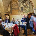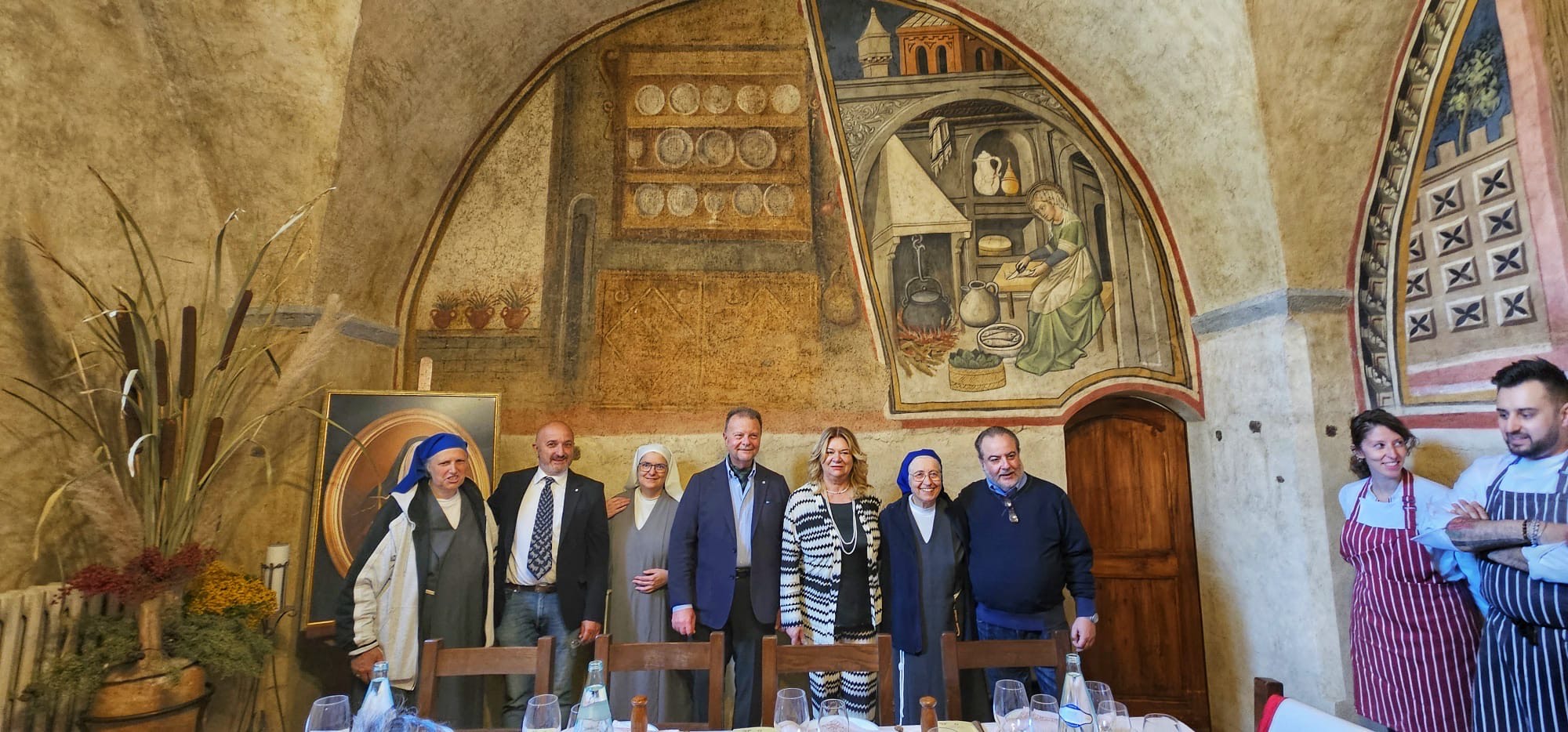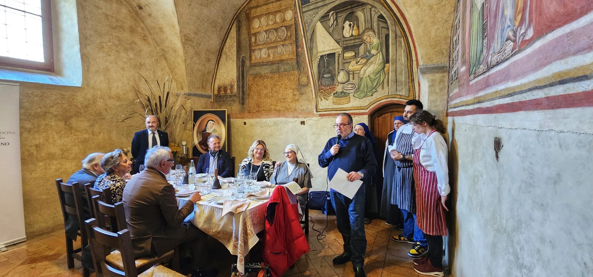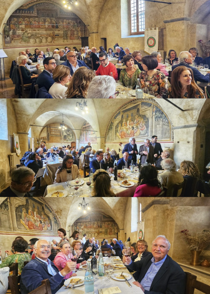 Nella suggestiva cornice del refettorio del monastero di Sant’Anna a Foligno si è tenuta una raffinata riunione conviviale congiunta tra le Delegazioni di Foligno e Perugia. Prima del pranzo, i numerosi partecipanti hanno potuto ammirare il prezioso patrimonio artistico del monastero, guidati con passione e competenza da Suor Lorella, tra affreschi, architetture e memorie spirituali di grande valore. Il pranzo, allestito con sobria eleganza dalla Norcineria Massatani 1913, si è svolto nello splendido refettorio affrescato con scene di banchetti evangelici, e ha proposto un menu ispirato alla tradizione pasquale umbra. Tra i piatti, sapori autentici del territorio e della festa, con dolci tipici come la ciaramicola e la rocciata, espressione rispettivamente delle tradizioni di Perugia e di Foligno. In abbinamento, vini selezionati in armonia con le portate. I contributi del Simposiarca Luca Radi, affiancato da Daniele Falchi, membro del C.S.T. Umbria, hanno arricchito l’evento con preziose note culturali e gastronomiche. Il simposio si è svolto in un clima di autentica convivialità e condivisione, nel segno della valorizzazione della cultura alimentare umbra.