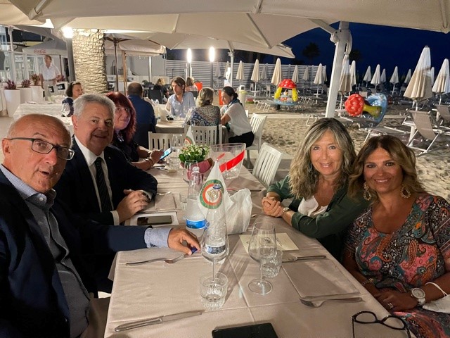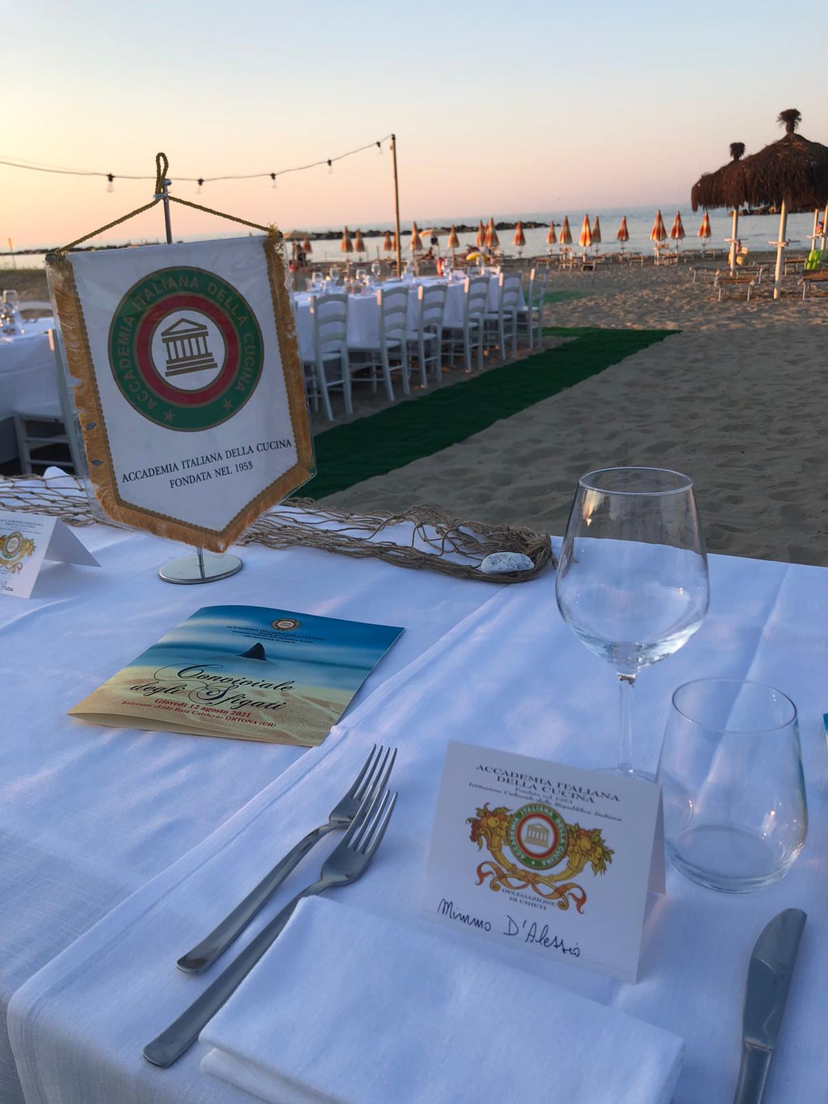 Come da tradizione pluridecennale, la Delegazione di Chieti in corrispondenza delle ferie d'agosto celebra la "Conviviale degli sfigati di Ferragosto", che quest'anno, in ossequio all'alternanza mare/monti divenuta abituale nelle ultime edizioni, si è svolta letteralmente "con i piedi nella sabbia", nel ristorante Baia Cattleya al Lido di Ortona. La riunione conviviale è stata preceduta dalla tradizionale visita al santuario di San Pantaleone a Miglianico, per il rito della "ribollatura", ripreso dopo lo stop della pandemia. In un contesto di grande informalità, l'evento conviviale, diretto magistralmente dalla Simposiarca Gabriella Orlando, ha presentato un menu di pesce fresco e locale, rallegrato da musica popolare e inframezzato dalle relazioni del direttore del Centro Studi Territoriale Abruzzo, Maurizio Adezio, e dal Consultore Antonello Antonelli. Foto 1. Il tavolo imperiale allestito in spiaggia. Foto 2. la Simposiarca Consultrice Gabriella Orlando. Foto 3. Il Delegato Nicola D'Auria e la brigata di cucina. Foto 4. Il primo piatto degustato.