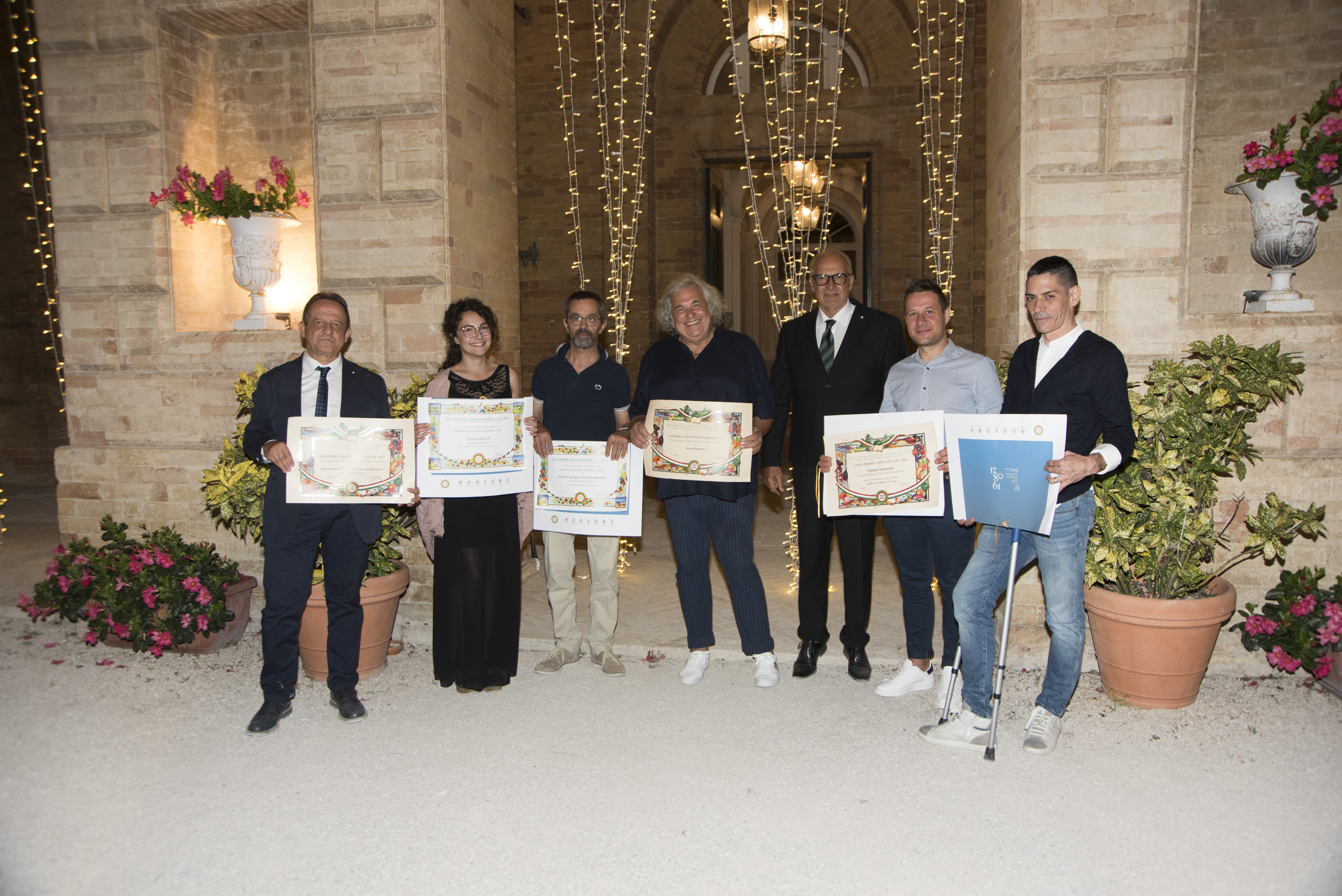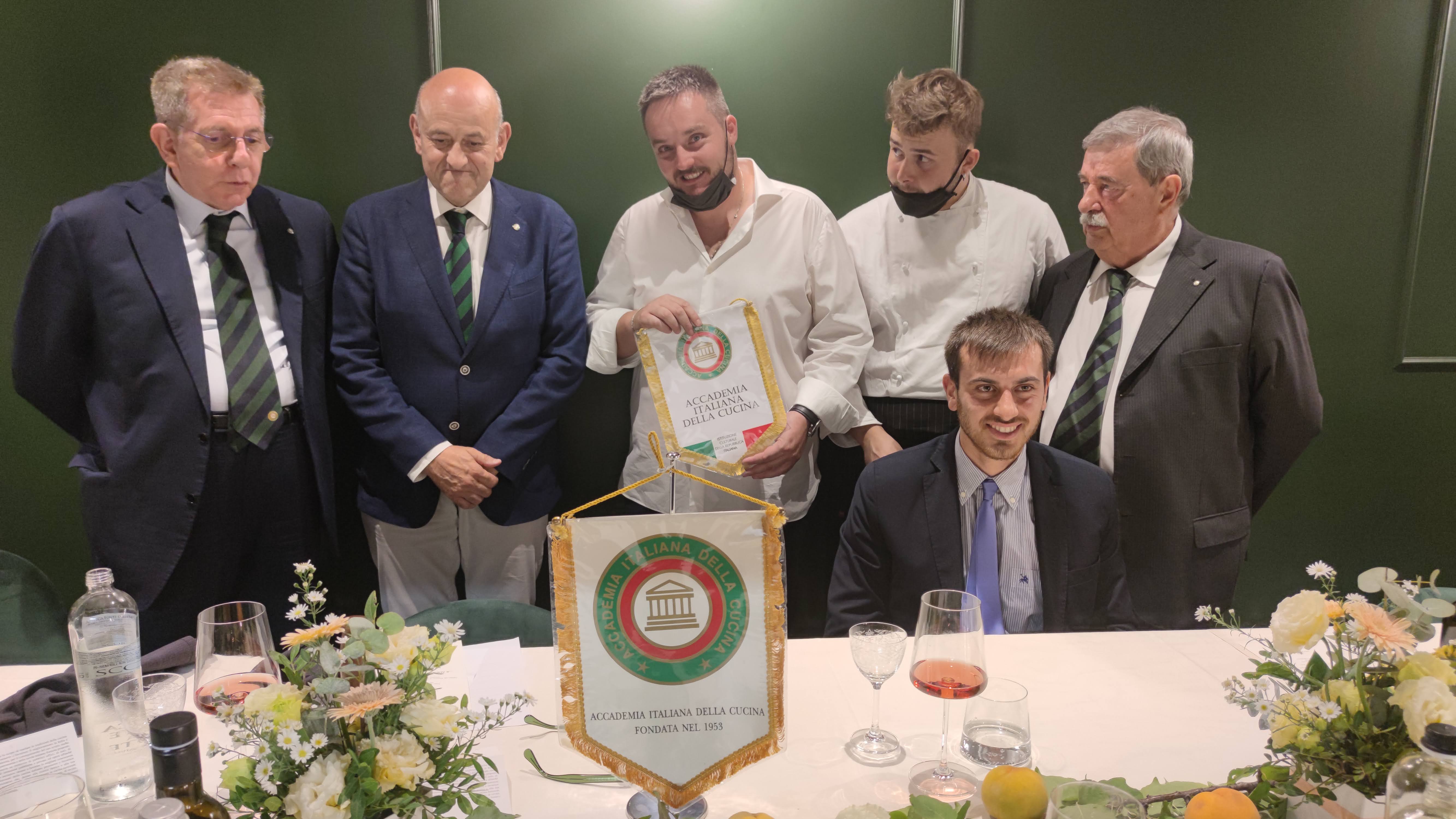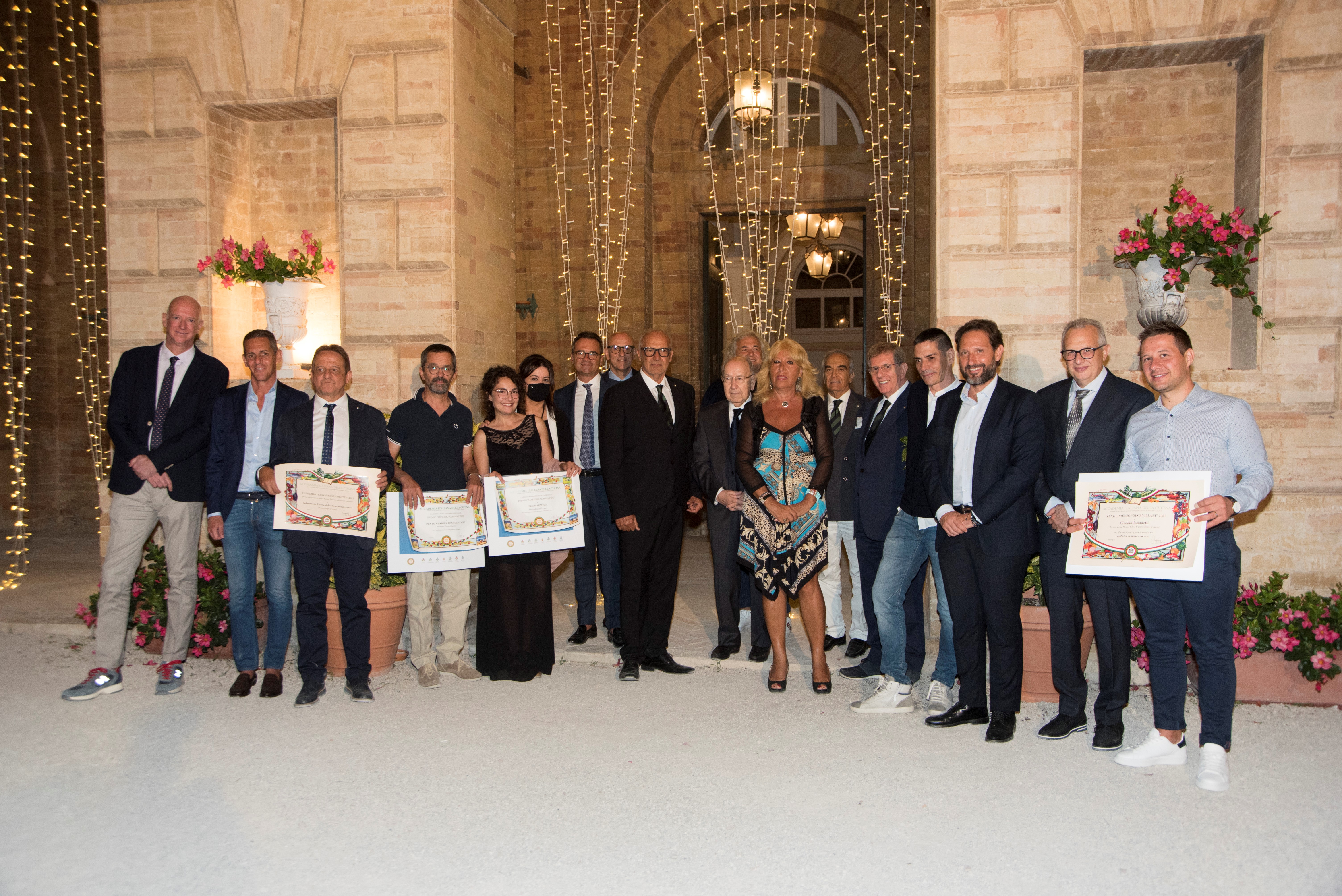 Si è tenuta la cerimonia per la consegna dei prestigiosi premi dell’Accademia proposti negli ultimi due anni dalla Delegazione di Fermo, alla presenza di autorità locali e accademiche e di importanti ospiti. La premiazione, svoltasi presso Villa Bonaparte a Porto san Giorgio, ha visto la partecipazione di S.E. il Prefetto di Fermo V. Filippi e del già Prefetto S.E. E. Zarrilli, del vice Prefetto F. Martino, dei sindaci N. Loira (Porto San Giorgio), P. Calcinaro (Fermo), I. Bascioni (sindaco di Belmonte e Presidente della Marca Fermana), G. Cannella (Campofilone), A. Terrenzi (Sant’Elpidio a Mare) e di S. Rafaiani, consigliere delegato dal Comune di Amandola. Per l’Accademia erano presenti il Vice Presidente vicario M. D’Alessio, il CT Marche S. Marani, il CT Abruzzo N. D’Auria, il Delegato di Ascoli Piceno V. Ricci e il Delegato di Macerata U. Bellesi. Sono stati premiati: Premio Villani (per la spalletta con osso), azienda Tenuta della Marca di Campofilone; Premio Alberini, azienda Le Spiazzette di Amandola per la coltivazione e la lavorazione in composte e marmellate della mela rosa dei Sibillini e l’azienda Fontegranne di Belmonte Piceno per la produzione di formaggi di latte caprino e vaccino dei propri allevamenti; Premio Nuvoletti, Aurelio Damiani di Fermo, cuoco; Laboratorio Piceno per la Dieta Mediterranea di Montegiorgio. Il Diploma di Buona Cucina è stato assegnato al ristorante “Non ti scordar di me” di Sant’Elpidio a Mare di Samuele Boldrini. Dopo la premiazione si è consumata la riunione conviviale predisposta da Giampiero Giammarini del ristorante “I Piceni” di Ortezzano con un menu ispirato alle più tipiche preparazioni del territorio e con l’impiego dei prodotti premiati. L’Associazione Italiana Sommelier ha curato il servizio dei vini selezionati dal suo presidente Marche Stefano Isidori in accompagnamento ai piatti seviti. L'evento è stato magistralmente orchestrato dalle Simposiarche Anna Maria Ciciretti e Clarissa Marzialetti con la collaborazione delle cerimoniere Maura Raccichini e Nadia Zacchi.