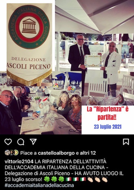 Gli Accademici e postulanti della Delegazione di Ascoli Piceno, con i loro ospiti, hanno partecipato numerosi all’“Incontro conviviale della ripartenza”, che ha avuto luogo presso lo chalet “Americo”, uno dei più noti di San Benedetto del Tronto. I partecipanti sono stati gratificati da ottimi e prelibati piatti a base di pesce dell’Adriatico, magistralmente preparati da un altrettanto noto chef, Sergio Zarrolli, che hanno ottenuto l’apprezzamento unanime ed entusiastico da tutti gli intervenuti.