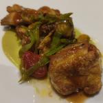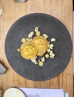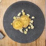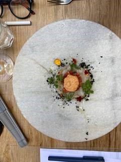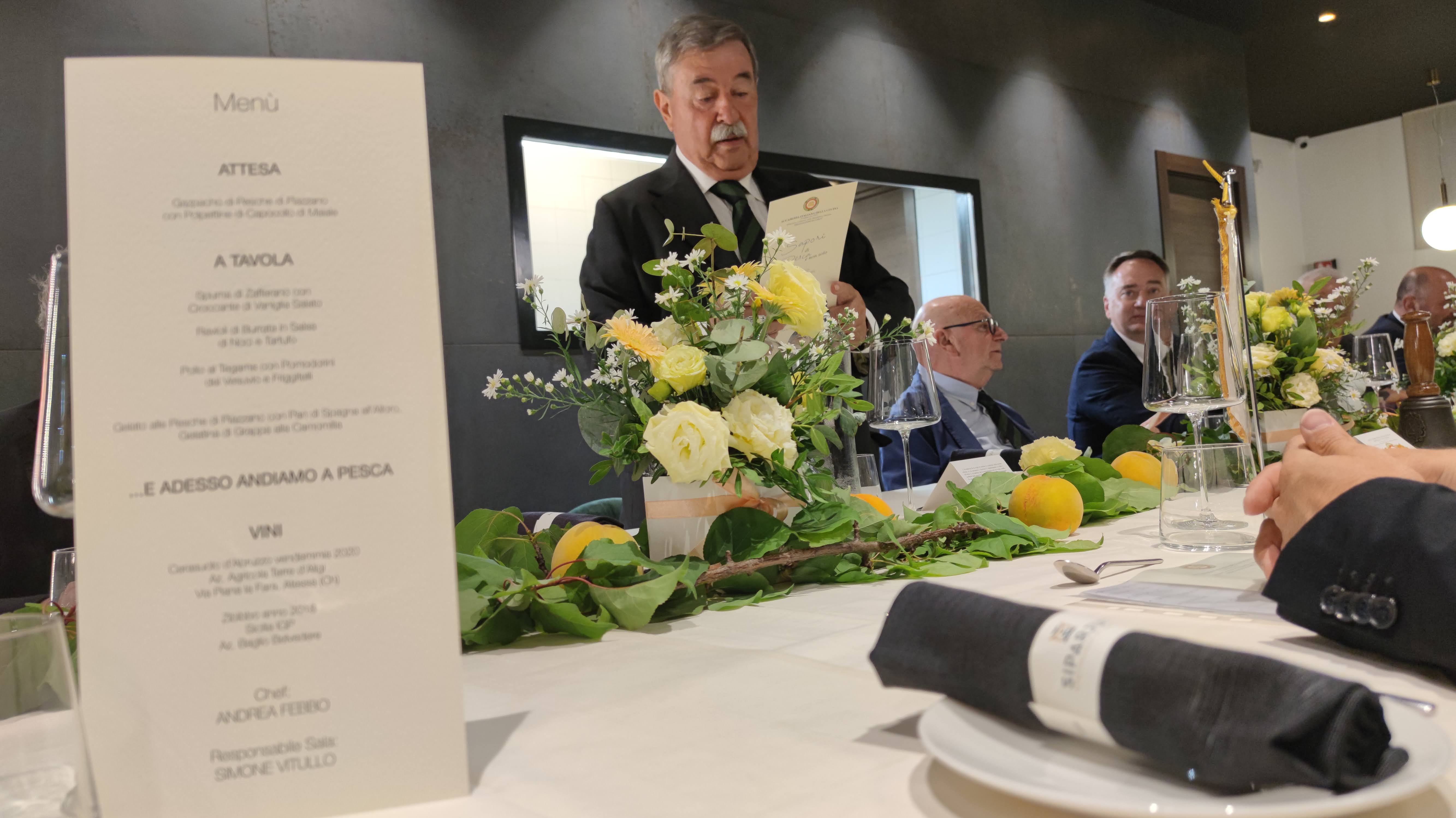La Delegazione di Chieti prosegue la sua scoperta dei giovani chef del territorio, dedicando la seconda riunione conviviale, dopo la riapertura dei locali, ad un ristorante che ha appena un anno di storia e il cui proprietario, la brigata di cucina e di sala, sono tutti under 40. La serata, grazie al Simposiarca Nunziato Mancini (foto 1) che ha selezionato il ristorante "Siparjum" di Atessa (CH), ha avuto come tema centrale la pesca, frutto tipico della stagione che ha grande diffusione nell'area della Val di Sangro, come ha sottolineato il dotto e giovane relatore della serata, Domenico D'Auria (foto 2). Nella sua esposizione il relatore ha tracciato la storia dell'arrivo in Europa e in Italia di un frutto universalmente apprezzato, che ha molti usi nella cucina regionale, non ultimo - a chiusura del convivio - quello di essere "tuffato" in un catino di Montepulciano d'Abruzzo per far sposare due sapori straordinari. Foto 3. Un piatto del menu. Foto 4. la brigata di cucina al termine della riunione conviviale.