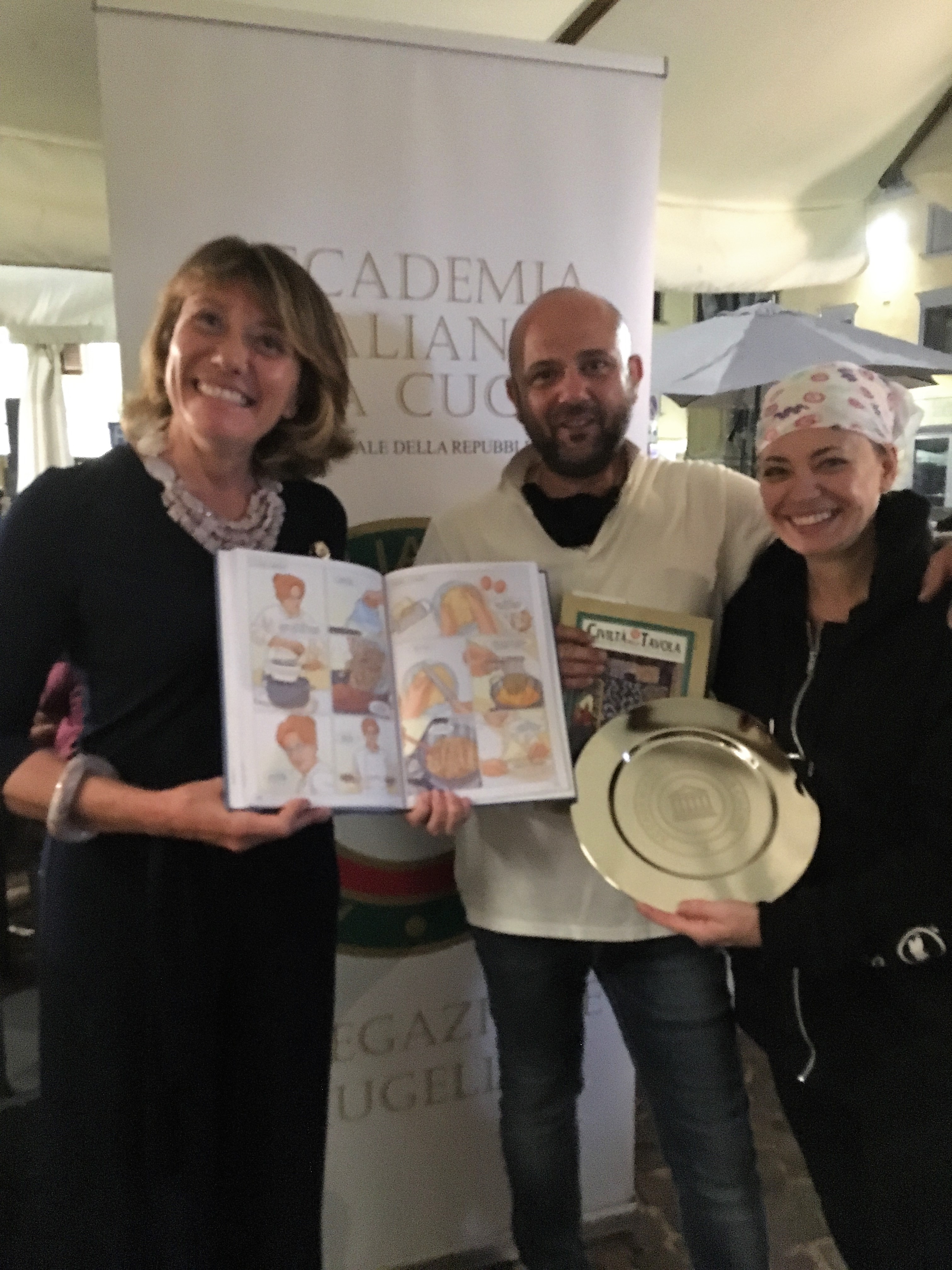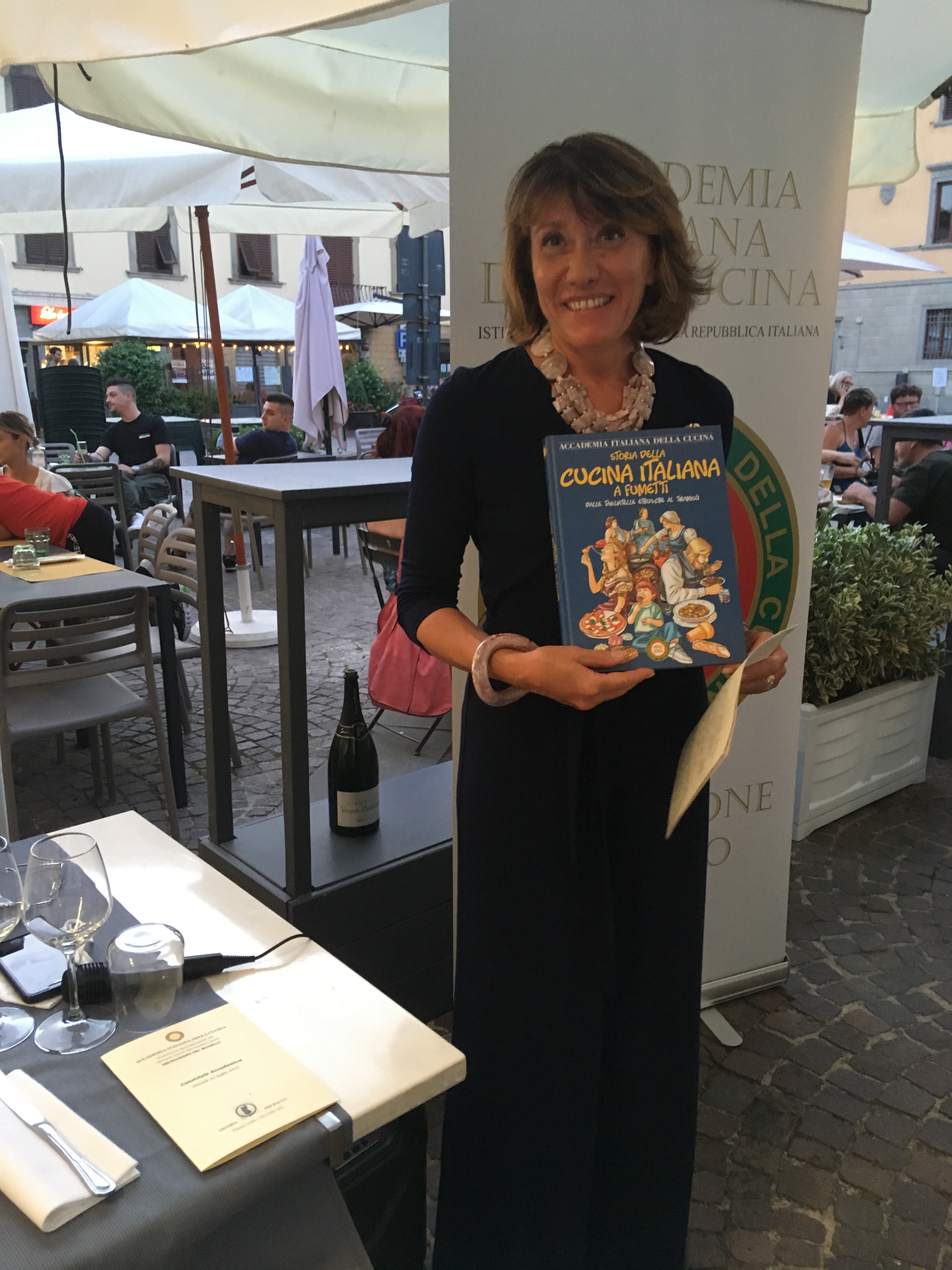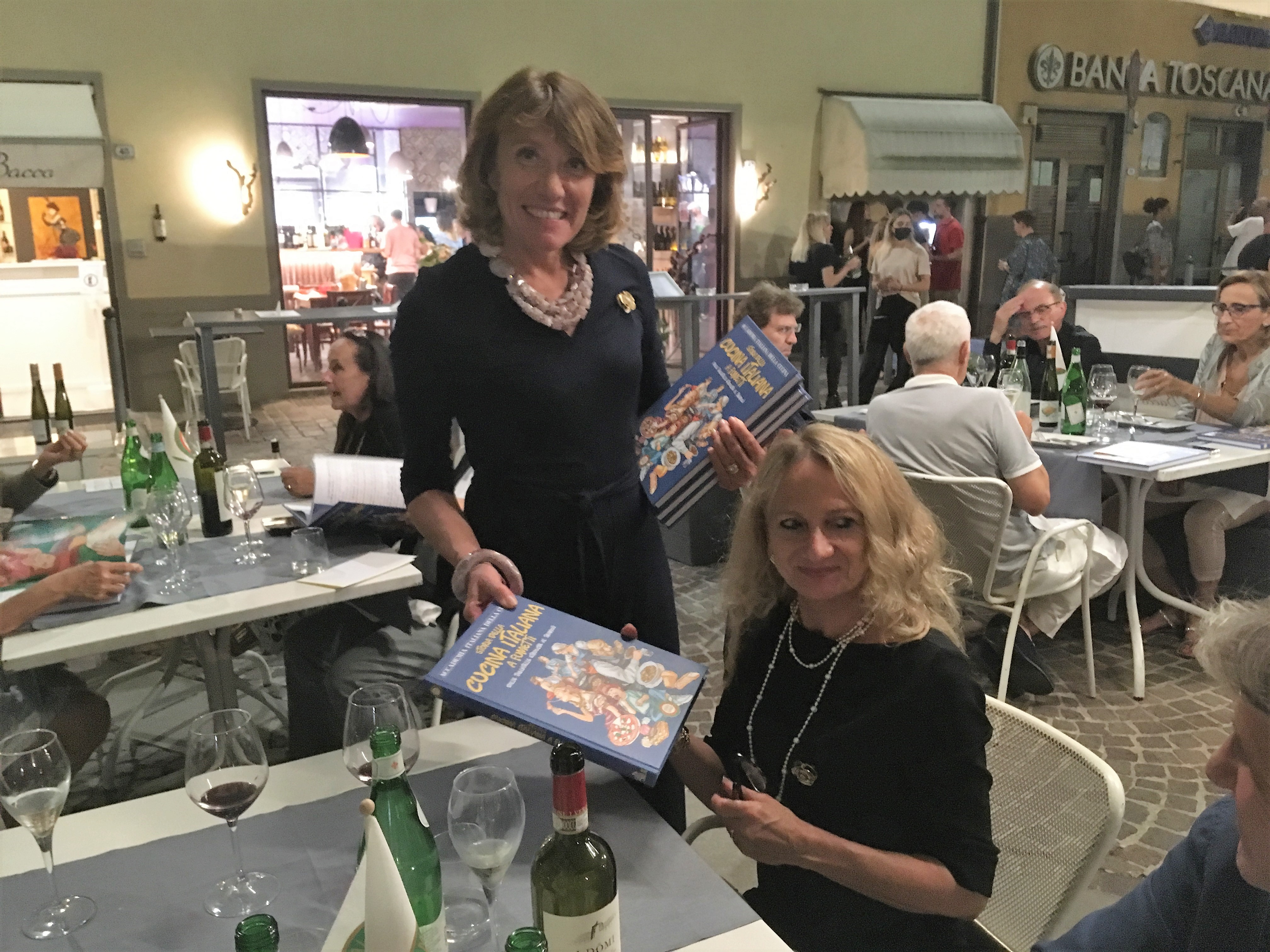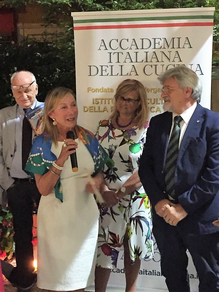 La Delegazione del Mugello si è ritrovata presso il ristorante O’ Per Bacco a Vicchio (FI) per la riunione conviviale d’estate (foto 1). La serata si è aperta con la presentazione da parte della Delegata Monica Sforzini del volume “Storia della cucina italiana a fumetti”, opera unica nel suo genere (foto 2), che è stata poi distribuita ai numerosi Accademici presenti (foto 3, in primo piano l’Accademica Anna Maria Milani). Elevato l’apprezzamento del menu, in particolare dei passatelli, un piatto sempre presente nella carta del locale, che per l’occasione sono stati serviti asciutti al nero di seppia con pomodorini e zucchine. E con la lettura della ricetta tradizionale a fumetti dei "passatelli in brodo" (pag. 183) e la consegna del piatto dell’Accademia a Elisabetta Fusi e a Mirko Dello Iacono, rispettivamente chef e patron (foto 4), si è conclusa una bellissima serata.
