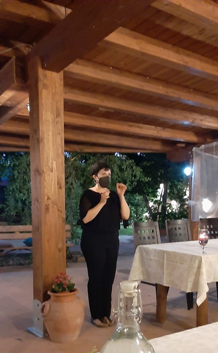 La Delegazione di Sulmona si è ritrovata al ristorante "Le favole di Gaia" a Pratola Peligna (AQ) per la riunione conviviale sul tema "Amicizia e cultura". Ospite il prof. Francesco Sabatini, Presidente Onorario dell' Accademia della Crusca (in foto 1 a destra in piedi, con il Delegato Giovanni Maria D'Amario durante il saluto rivolto ad Accademici e ospiti). Foto 2. La titolare del ristorante Annalisa Mastrogiuseppe illustra il menu pensato per il convivio della Delegazione.