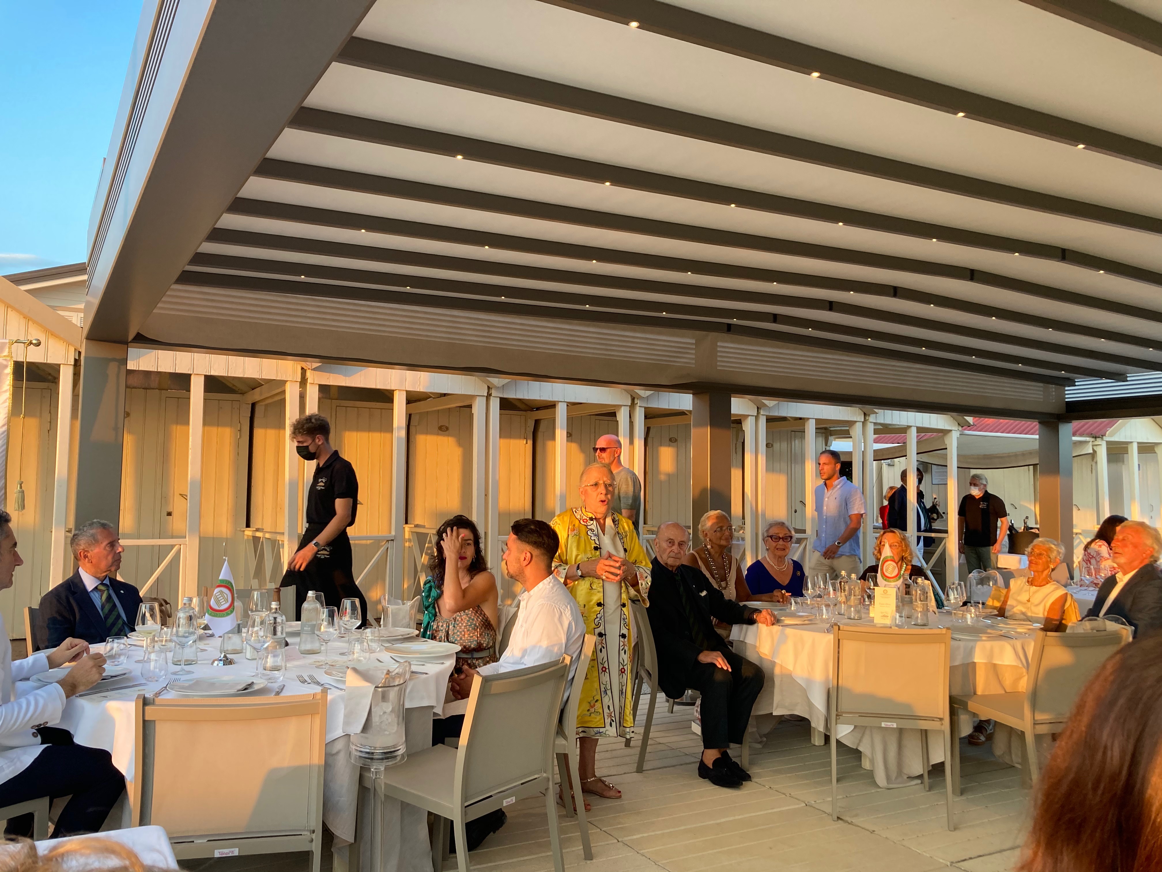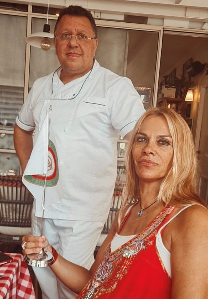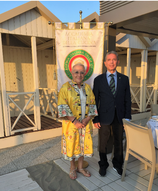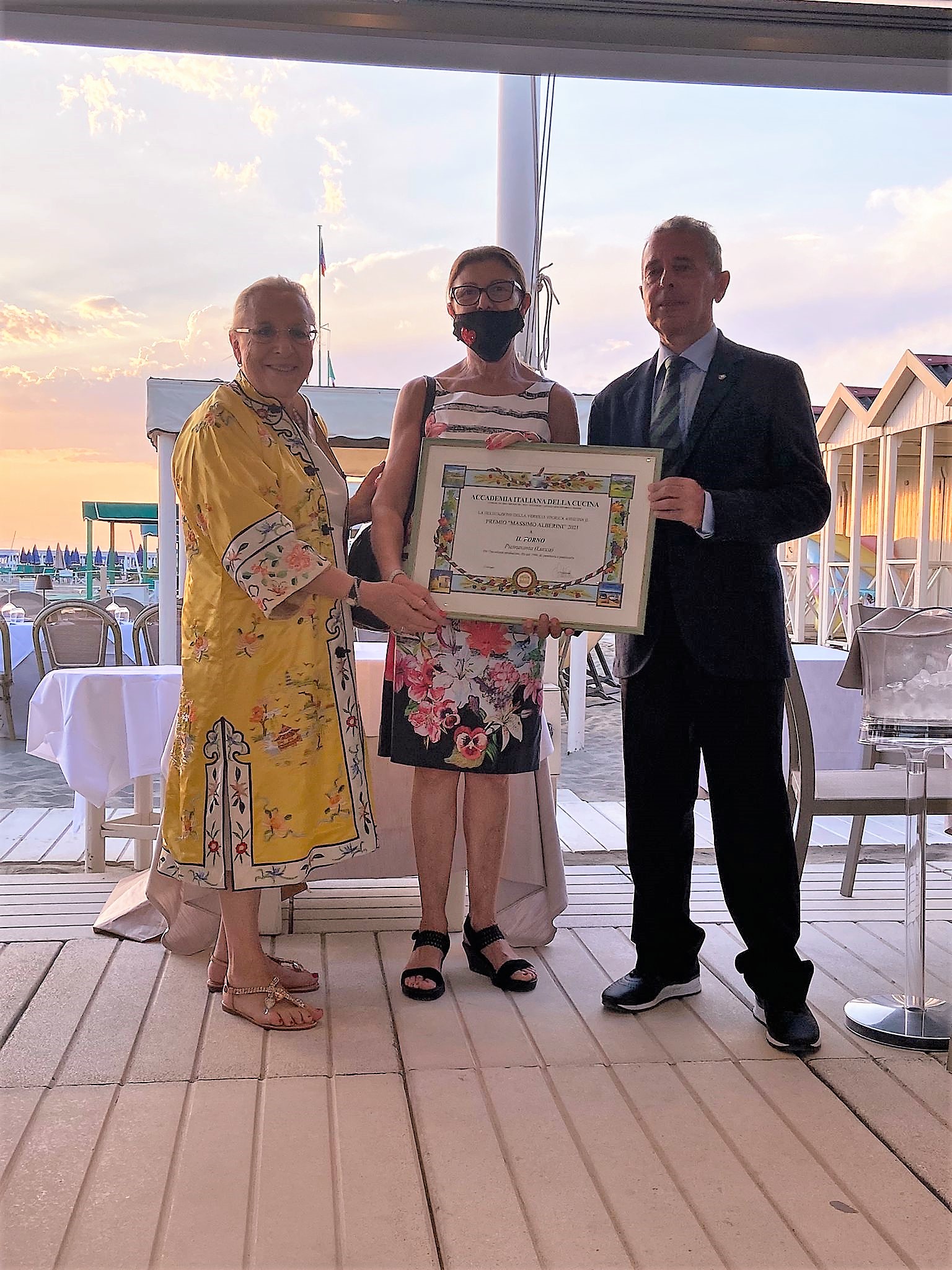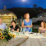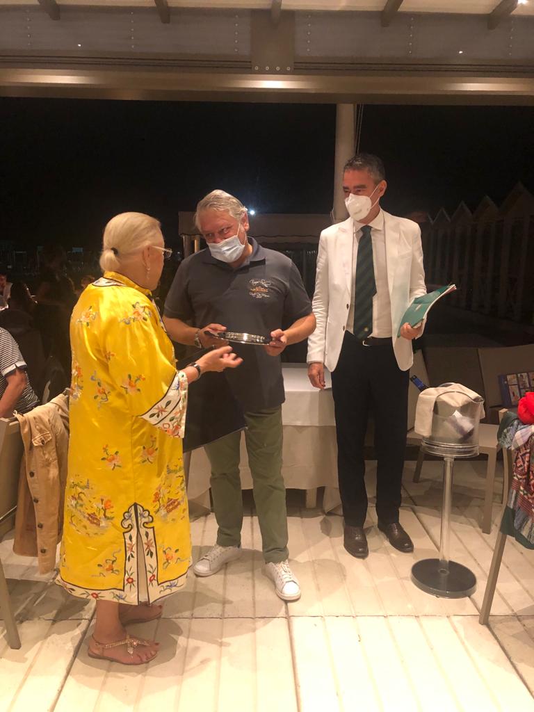 Nell’affollata Forte dei Marmi di fine luglio, un vero privilegio cenare sulla spiaggia in uno dei bagni storici: il Bagno Silvio. La Delegazione della Versilia Storica, guidata da Anna Ricci, è stata subito accolta da uno staff sorridente e preparato che si è confermato positivo durante tutta la serata. Una riunione conviviale ricca di presenze e avvenimenti: ospite della serata, il Vice Presidente dell’Accademia Maurizio Fazzari (in foto 1 con la Delegata), alla cui presenza è avvenuta la consegna del premio Massimo Alberini ad Antonella Giannelli, titolare della panetteria “il Forno” di Pietrasanta che da anni prepara buonissime torte tradizionali del territorio (in foto 2, la consegna del premio). In merito alla cena, l’antipasto si è fatto un po’ attendere ma il ricco carosello di vassoi, dalla frittura al crudo di pesce, alla vaporata e al crostino di arselle, è stato molto apprezzato dai convenuti. Ottimo il secondo piatto: un'ombrina in guazzetto arricchito dal gusto deciso del cappero. A conclusione della serata, la Delegata e il Segretario Bruno Toni hanno consegnato il piatto dell’Accademia a Gianluca Frediani, attuale titolare del “Bagno Silvio”, i cui nonni nel 1919 avviarono l’attività balneare (foto 4).