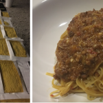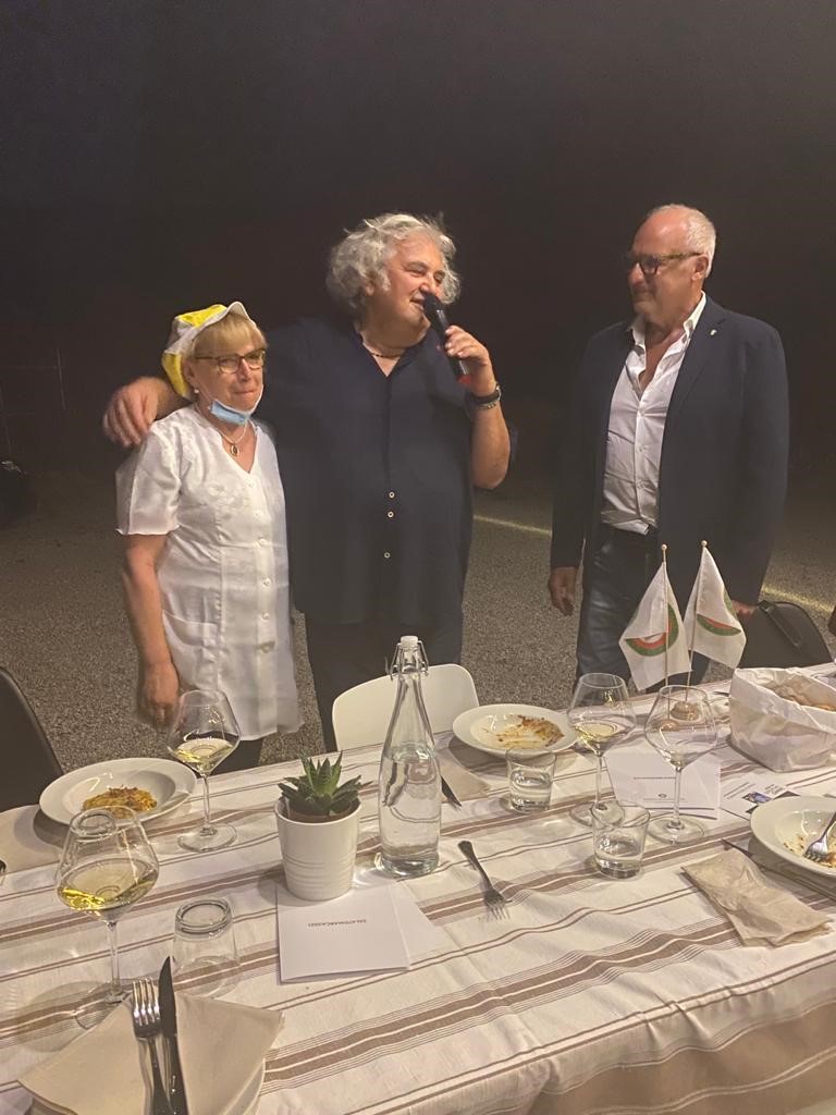 Partecipatissima riunione conviviale (foto 1) per la curiosità verso un evento che ha riunito tre eccellenze di Campofilone: la Tenuta della Marca con la sua filiera corta nella produzione di salumi, fra cui la “spalletta” (Premio Villani 2021); Sabina Marilungo, ultima a tirare ancora a mano la “pannella” da cui ricavare maccheroncini di inimitabile finezza; Aurelio Damiani (Premio Nuvoletti 2020), maestro della cucina fermana che ha scelto Campofilone per la sua attività (in foto 2 il Delegato Fabio Torresi, Sabina Marilungo e Aurelio Damiani). Il convivio è cominciato al tramonto, con olive tenere ascolane ripiene e fritte, una tavolozza dei salumi della Tenuta e poi, a completare il panorama dei prodotti di punta dell’azienda, l’assolo della “spalletta” con melone (foto 3). Dopo il saluto del Sindaco di Campofilone, Gabriele Cannella, è seguita l’esibizione di Sabina Marilungo che in pochi minuti in show cooking, ha confezionato con ineguagliabile maestria e naturalezza i maccheroncini di impareggiabile finezza necessari per saziare la gola degli oltre cinquanta convenuti (foto 4). Abbondantemente irrorati da un ragù della tradizione fermana, sapido e profumato dalla varietà delle carni e delle spezie, tirato per oltre quattro ore in cottura per una magistrale interpretazione di Aurelio (foto 4), i maccheroncini hanno deliziato e solleticato il palato dei commensali al punto da necessitarne ulteriori cotture e servizi ai tavoli. Apprezzati anche il prosciutto arrosto della Tenuta in salsa al vino rosso con contorno di verdure al forno e la torta gelato di cioccolato e pistacchio della pasticcieria Dorina. Ottimi i vini dell’azienda Dianetti e su tutti il Vigna Giulia.