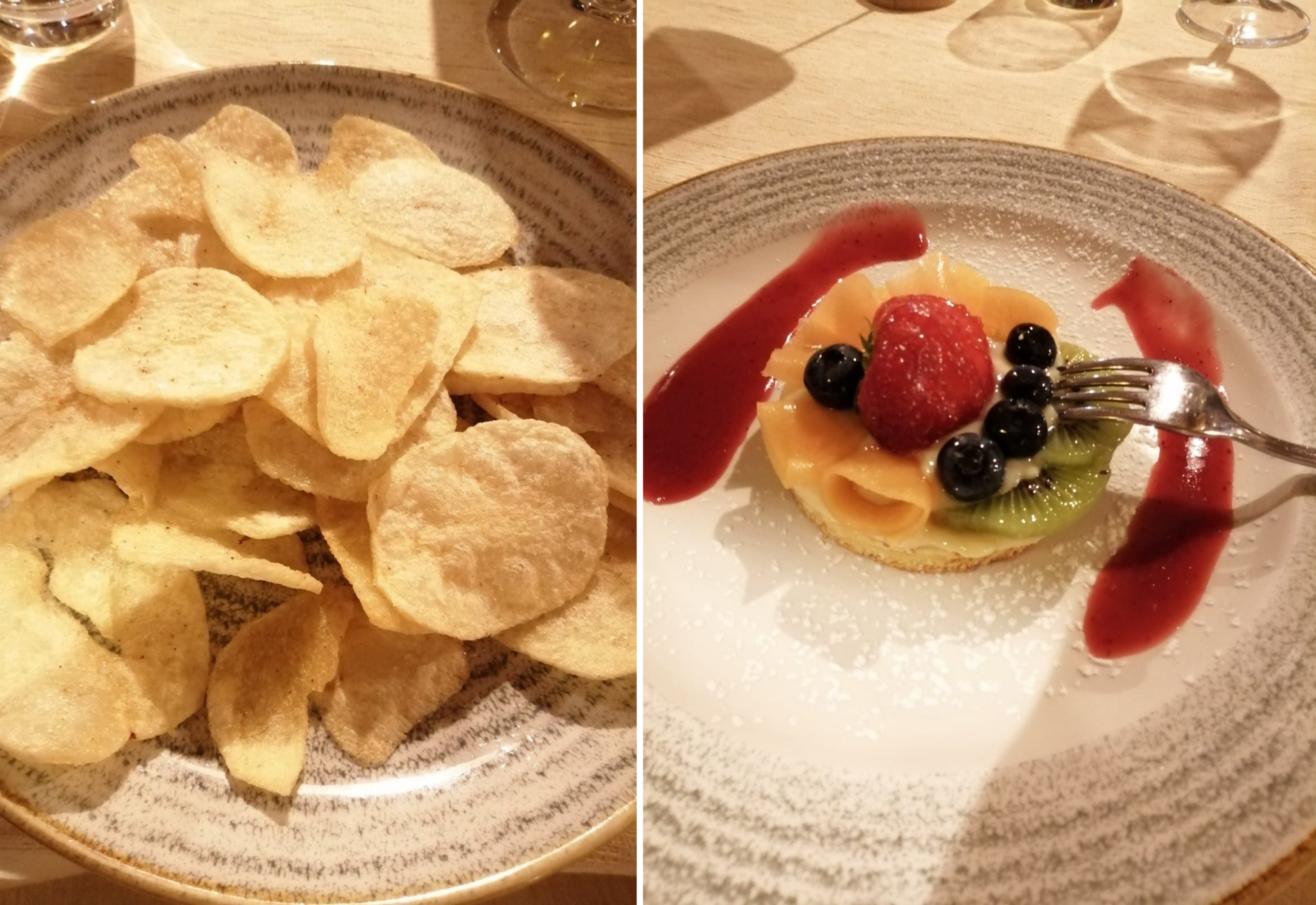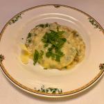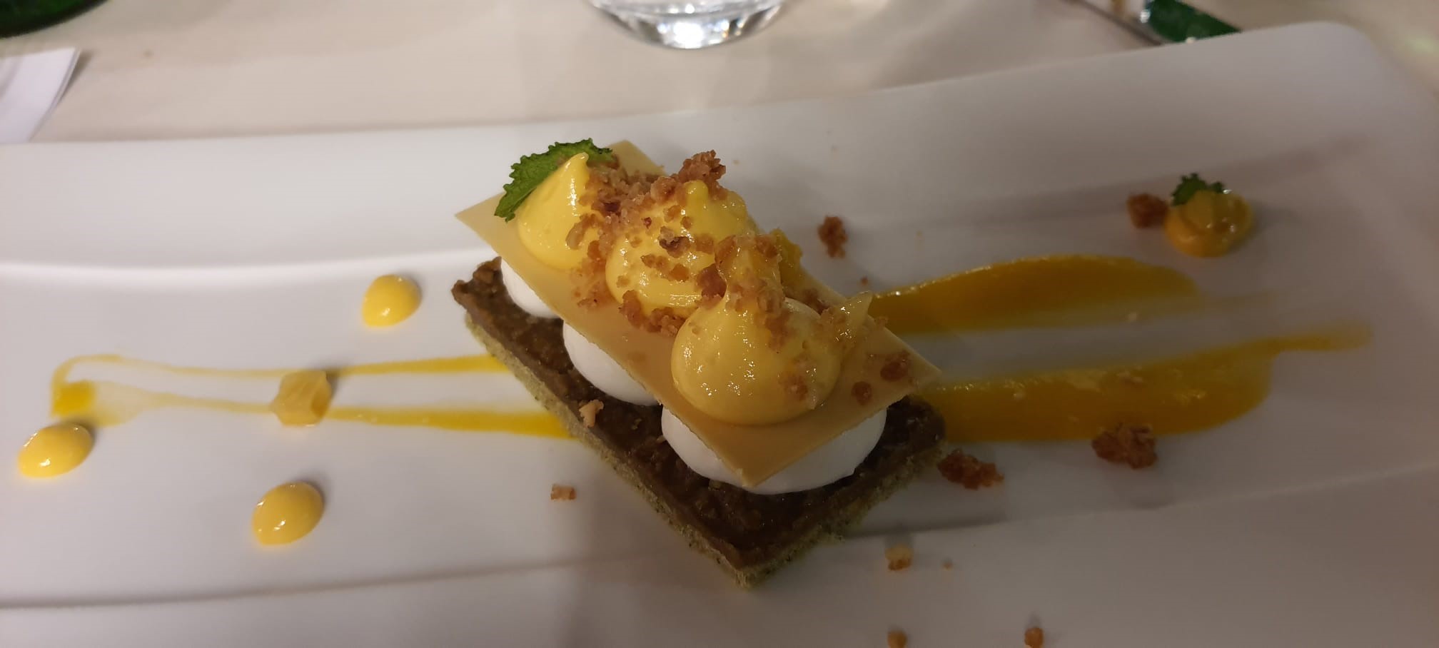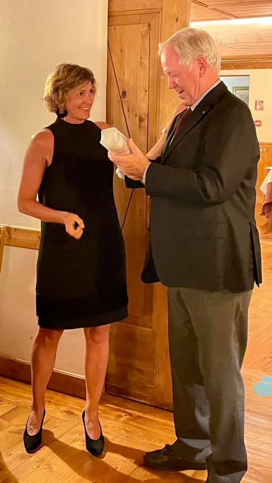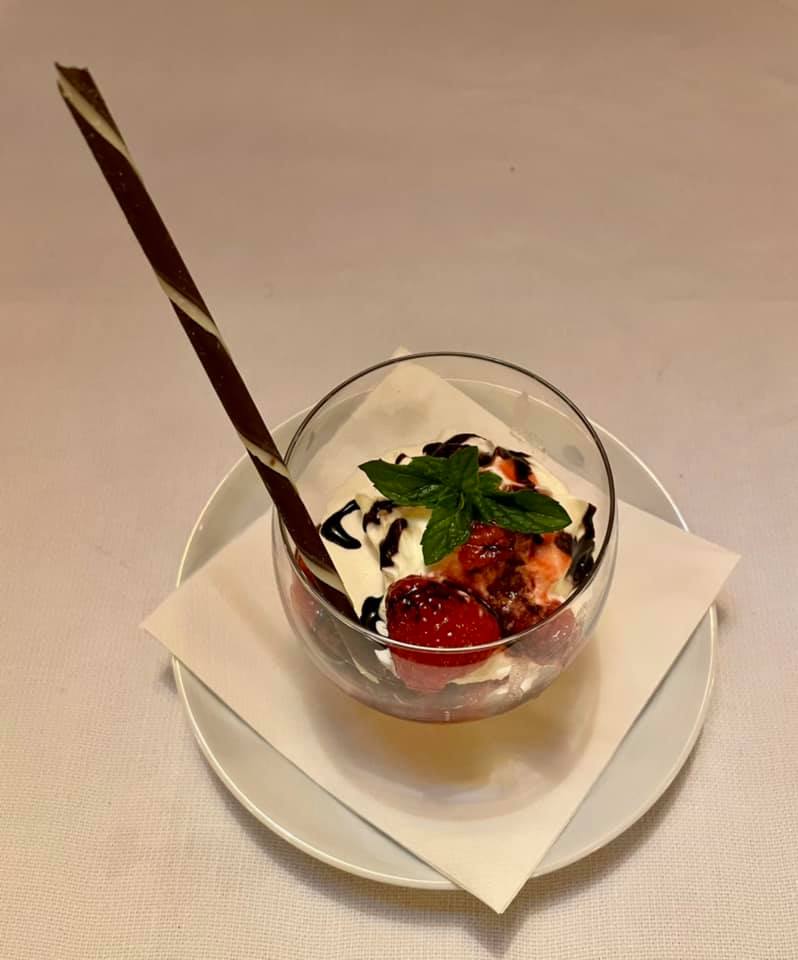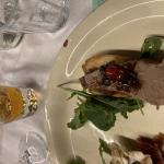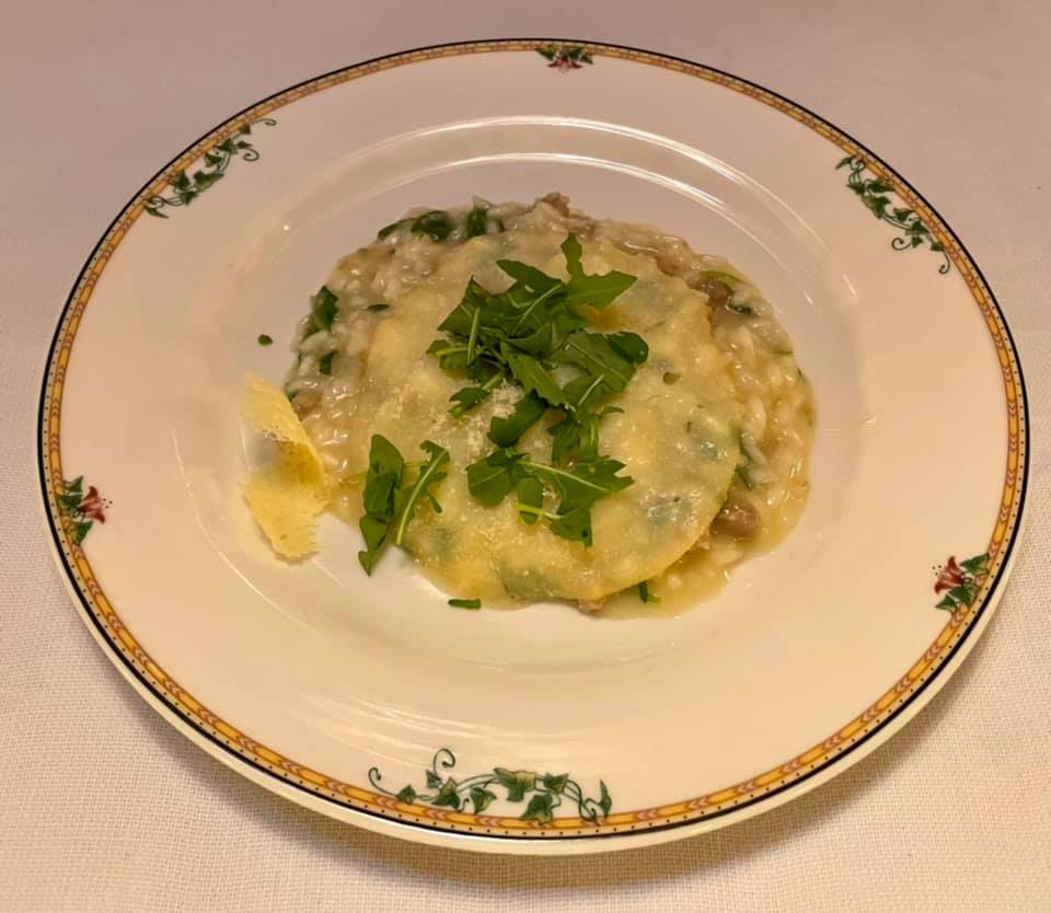 La Delegazione di Cortina d’Ampezzo si è ritrovata al ristorante “Stella Polare” presso l’hotel Bellevue di Cortina per la riunione conviviale intitolata “Parole d’acqua suono di vino”, organizzata dai Simposiarchi Roberta Alverà e Maurizio Pozzan e dedicata ad un argomento spesso trascurato e sottovalutato: le acque minerali. Graditissimo relatore è stato il dott. Gilberto Zaina che ha trattato il tema “Acqua minerale. Fattori che ne tracciano l’alta qualità: il territorio di provenienza di un’acqua minerale come fattore caratterizzante le peculiarità della composizione minerale e della purezza” (in foto 1. Al centro la Delegata Monica De Mattia, alla sua destra il relatore dott. Gilberto Zaina e gentile signora, alla sua sinistra i Simposiarchi Maurizio Pozzan e Roberta Alverà). Alla serata hanno partecipato anche Accademici di diverse Delegazioni e numerosi ospiti, che hanno gustato un menu raffinato, che rientra nelle proposte del ristorante, e gustato una scelta di vini particolarmente apprezzati. La Delegata Monica De Mattia ha inoltre consegnato il diploma dei 25 anni di appartenenza all'Accademico Rolando Pellegrino (foto 2). Foto 3. Perle di risaia alla rucoletta selvatica con pastin bellunese e scamorza affumicata. Foto 4. Millefoglie di meringa con lamponi sciroppati, cioccolato fondente e panna.