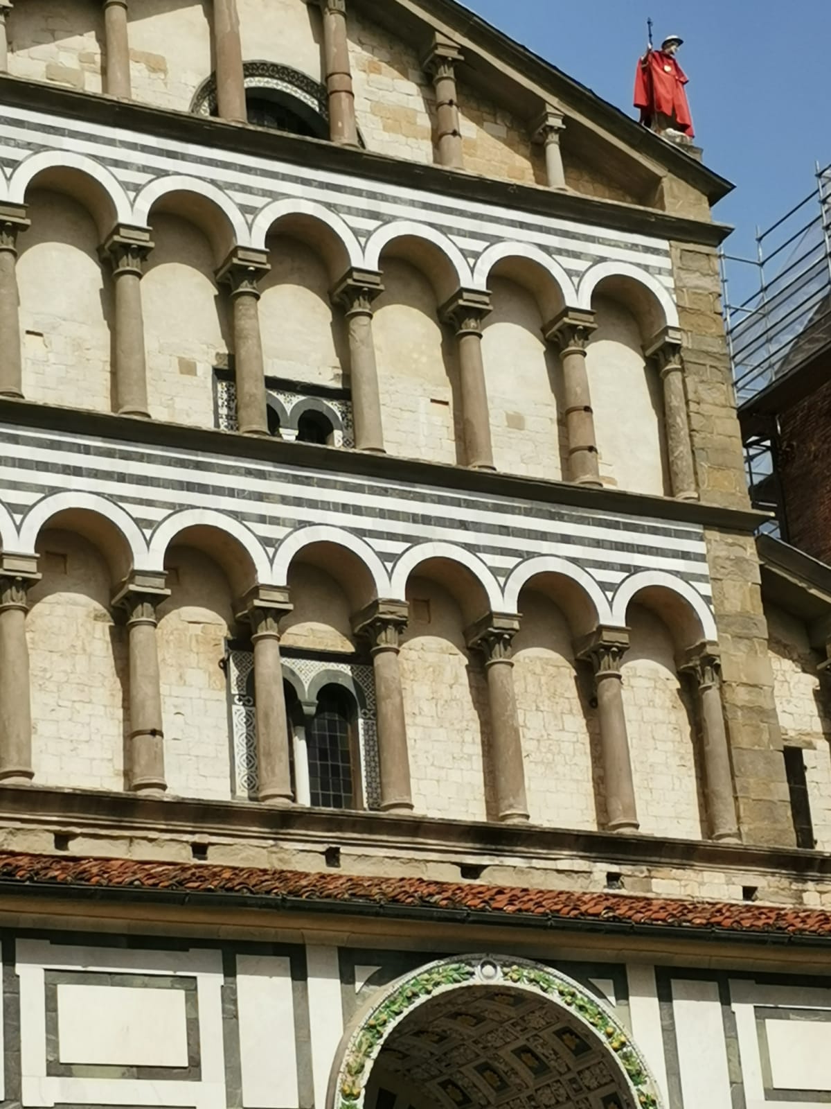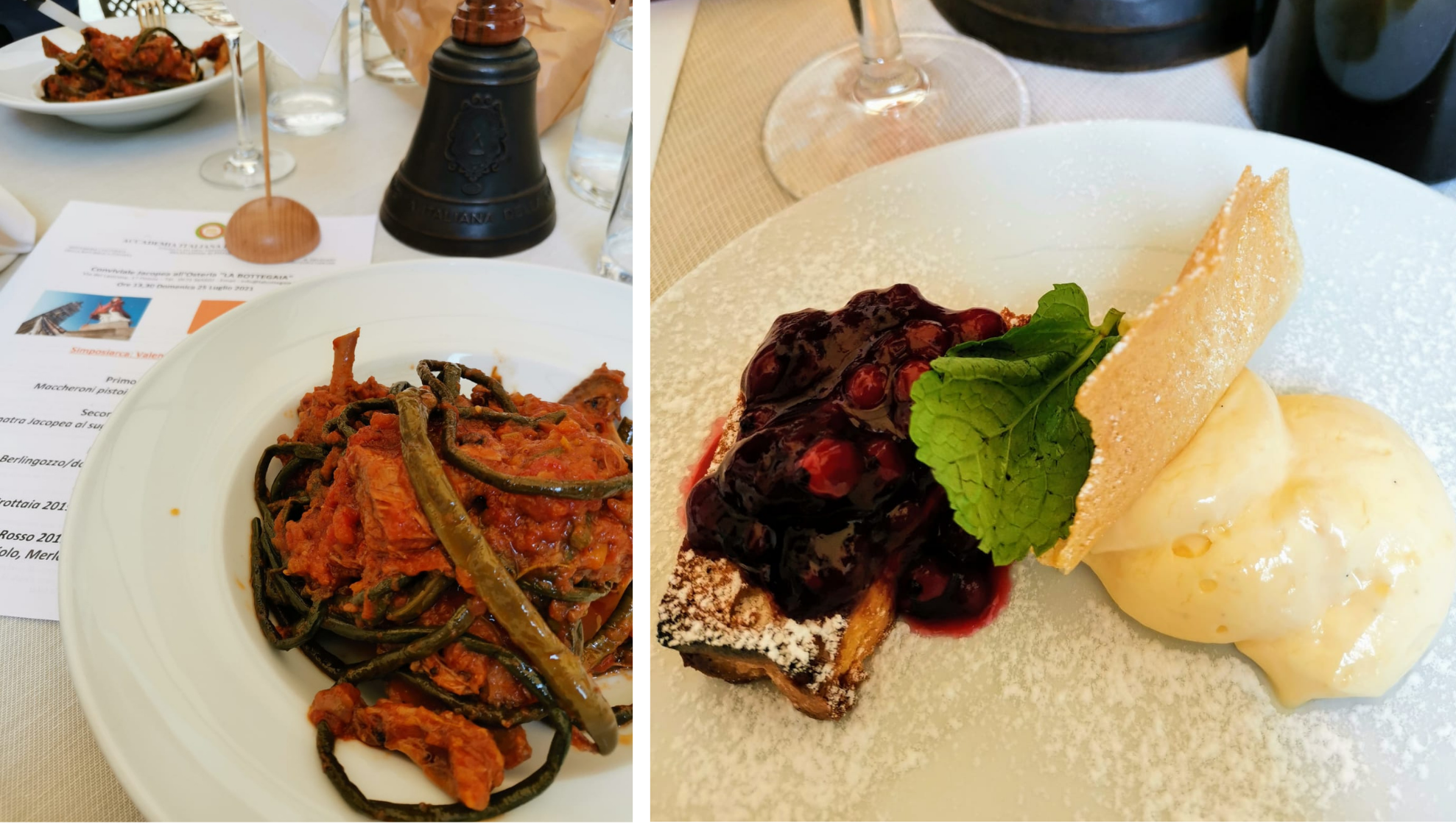 Nel giorno in cui, su tutte le tavole della provincia pistoiese, viene preparato il tradizione piatto "Maccheroni sull’anatra muta” in onore del santo patrono San Jacopo, la Delegazione di Pistoia si è ritrovata all'osteria La BotteGaia, per gustare questa preparazione tipica locale. Il pranzo si è tenuto all'aperto (foto 1), in pieno centro storico, con vista sul Battistero con il Santo (vestito per l’occasione con la sua mantellina rossa) che da un pinnacolo del Duomo ha osservato i convenuti compiaciuto di questa ritualità gastronomica (foto 2). Foto 3. Maccheroni sull'anatra muta. Foto 4. Coscio di anatra al sugo con fagiolini "serpenti" di S.Anna; berlingozzo tostato con frutti sottobosco dell'Abetone e crema di brigidino.