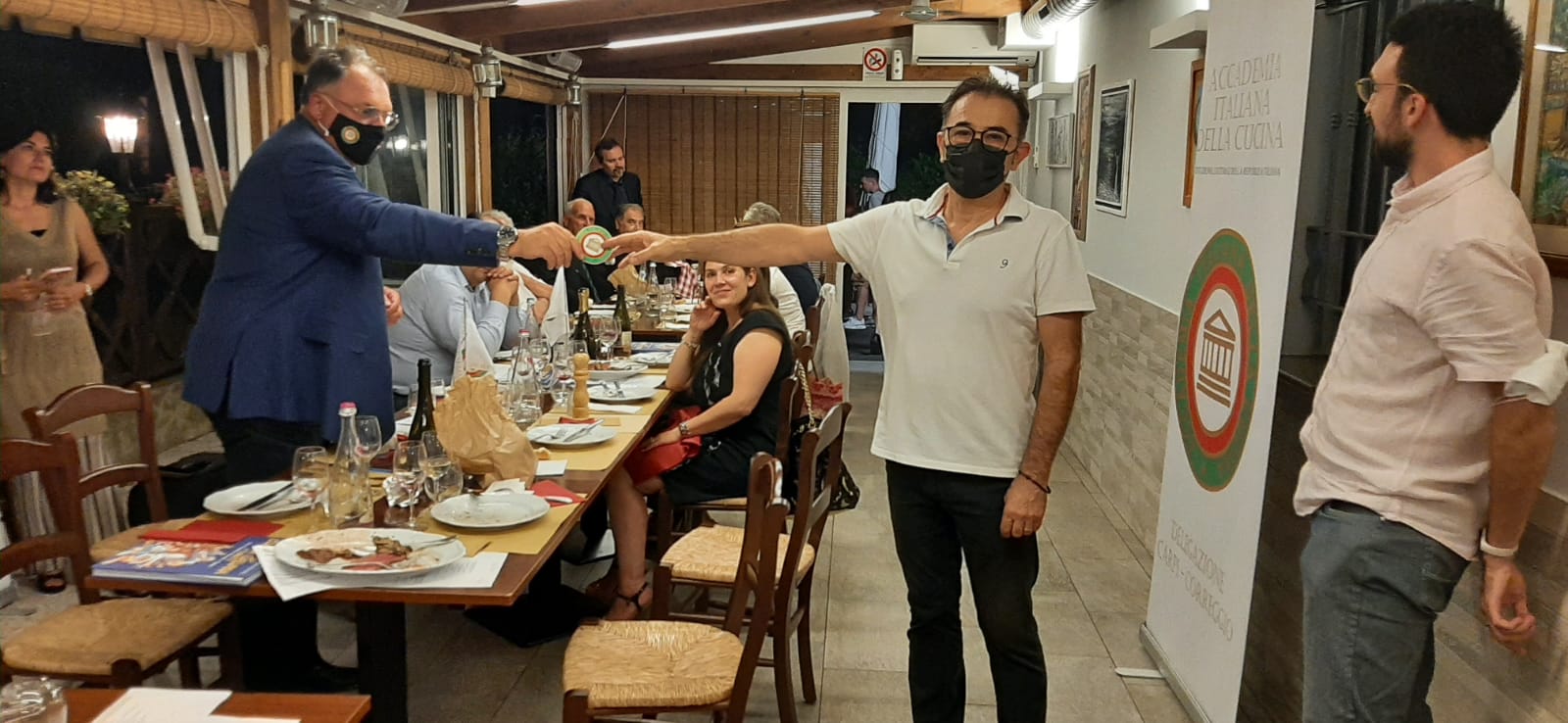 La Delegazione del Valdarno Fiorentino, dopo dieci mesi durante i quali sono stati mantenuti comunque solidi legami tra gli Accademici attraverso vari incontri online, si è ritrovata in una riunione conviviale in presenza presso il ristorante Il Canniccio, nel cuore del Reggello. Da tutti molto apprezzato il menu proposto, con gustosi piatti tradizionali toscani, dai crostini misti agli sformatini di funghi e verdure, dalle ottime tagliatelle all'anatra dal ragù molto profumato all'agnello scottadito con le patate fritte "alla vecchia maniera". Al termine della piacevole serata il Delegato Sandro Fusari ha consegnato al ristoratore Sig. Daniele Bigazzi alcuni volumi dell'Accademia Italiana della Cucina. Foto 1. Il Delegato Sandro Fusari con il Vice Delegato Giovanni Gerini e il Tesoriere Francesco Corsico. Foto 2-4. Il menu proposto.