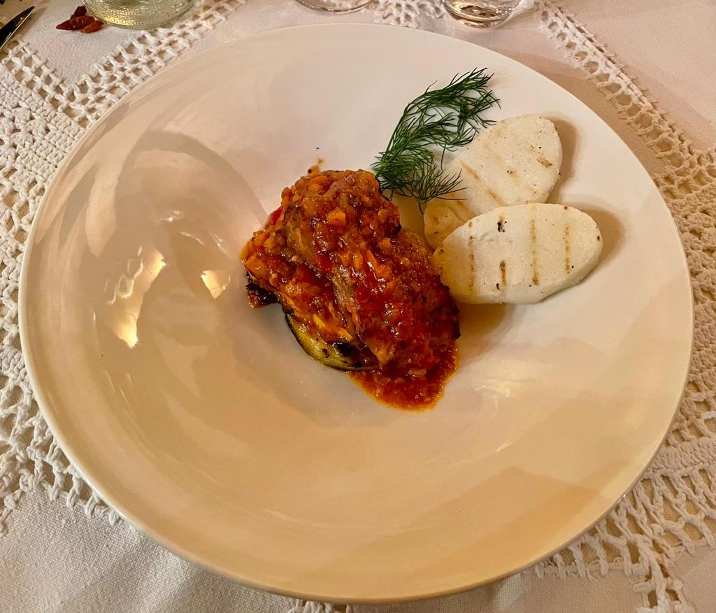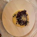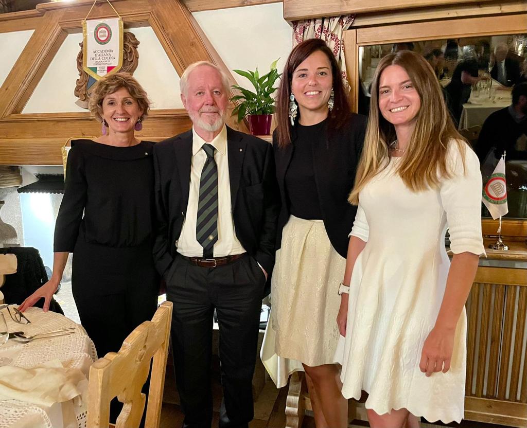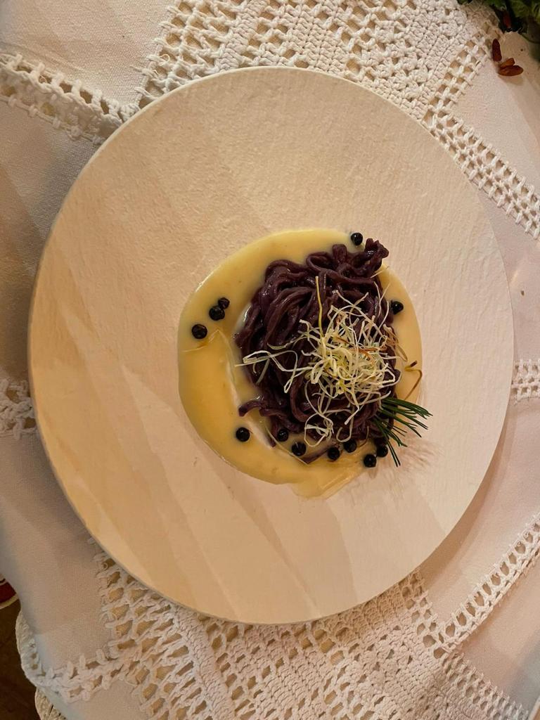 La Delegazione di Cortina d’Ampezzo si è riunita presso il ristorante “El Camineto” per celebrare i settecento anni della morte del Sommo Poeta nel corso della riunione conviviale intitolata “In viaggio con Dante. Puro e disposto a salire alle stelle”. Un percorso gastronomico che ha trovato nella Divina Commedia riferimenti letterari brillantemente narrati dal prof. Francesco Piero Franchi, Accademico onorario della Delegazione di Belluno-Feltre-Cadore, ospite della serata. Il menu, insolito e particolarmente gradito dai numerosi presenti, è stato costruito per l’occasione dalle Simposiarche Gaia Di Gallo e Katia Tafner, che si sono basate sui versi poetici e sugli aneddoti della vita di Dante. Ecco allora in tavola, tra gli altri piatti, il saporito uovo fritto e il bisato (anguilla) in umido, che Dante cita nel XXIV canto del Purgatorio: la Delegata Monica De Mattia ha sottolineato come il menu seguisse nei sapori l’itinerario di Dante tra Inferno, Purgatorio e Paradiso. Foto 1. La Delegata Monica De Mattia, Francesco Piero Franchi e le Simposiarche Gaia Di Gallo e Katia Tafner. Foto 2. Tagliolini al mirtillo nero su crema di patata profumata al pino mugo e porro fritto. Foto 3. Bisato in umido con polenta bianca arrostita e crostini all’aglio. Foto 4. Tortino al cioccolato cuore morbido, semifreddo al cioccolato bianco, aria al lime e salsa al caramello salato.