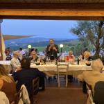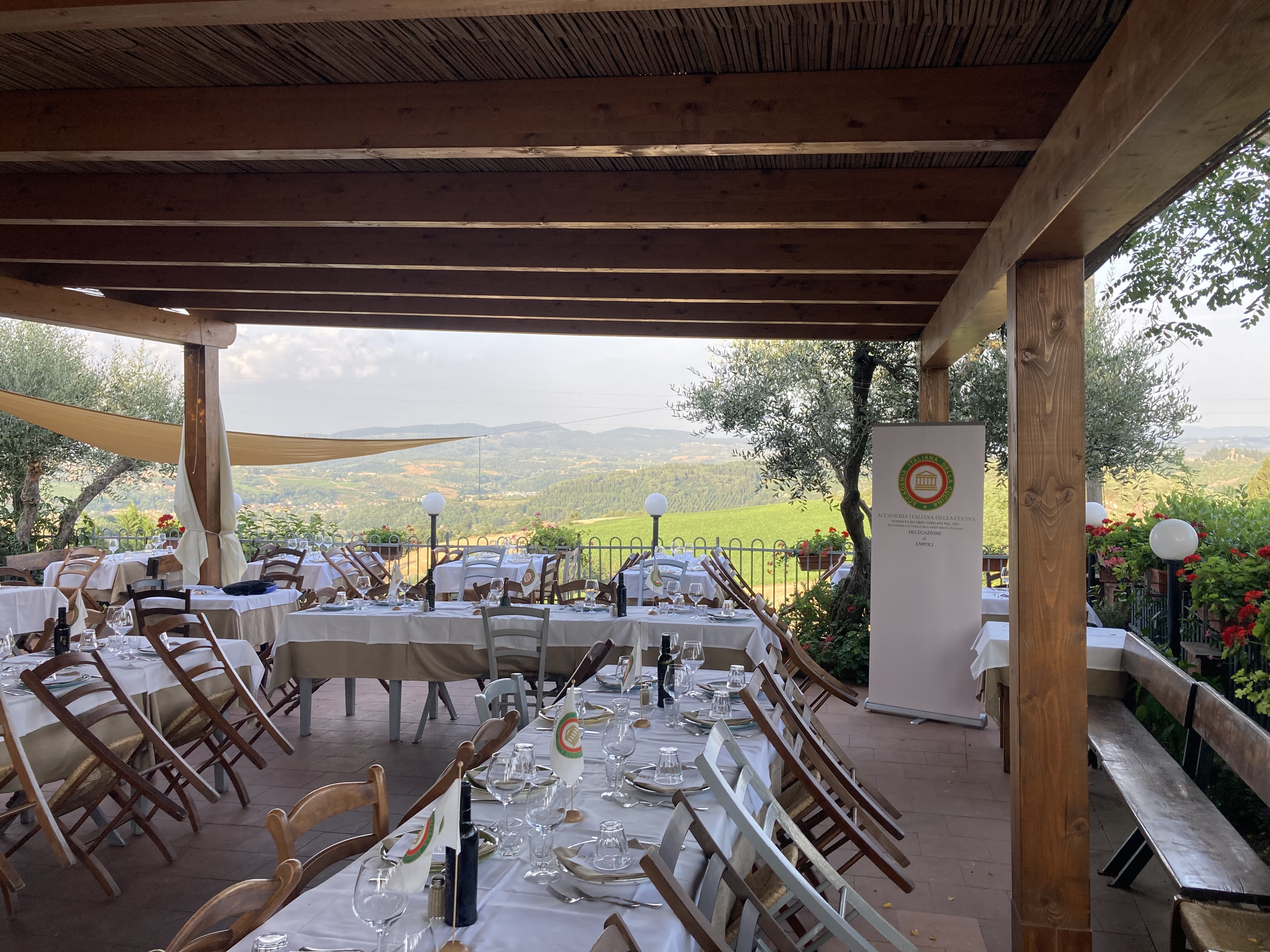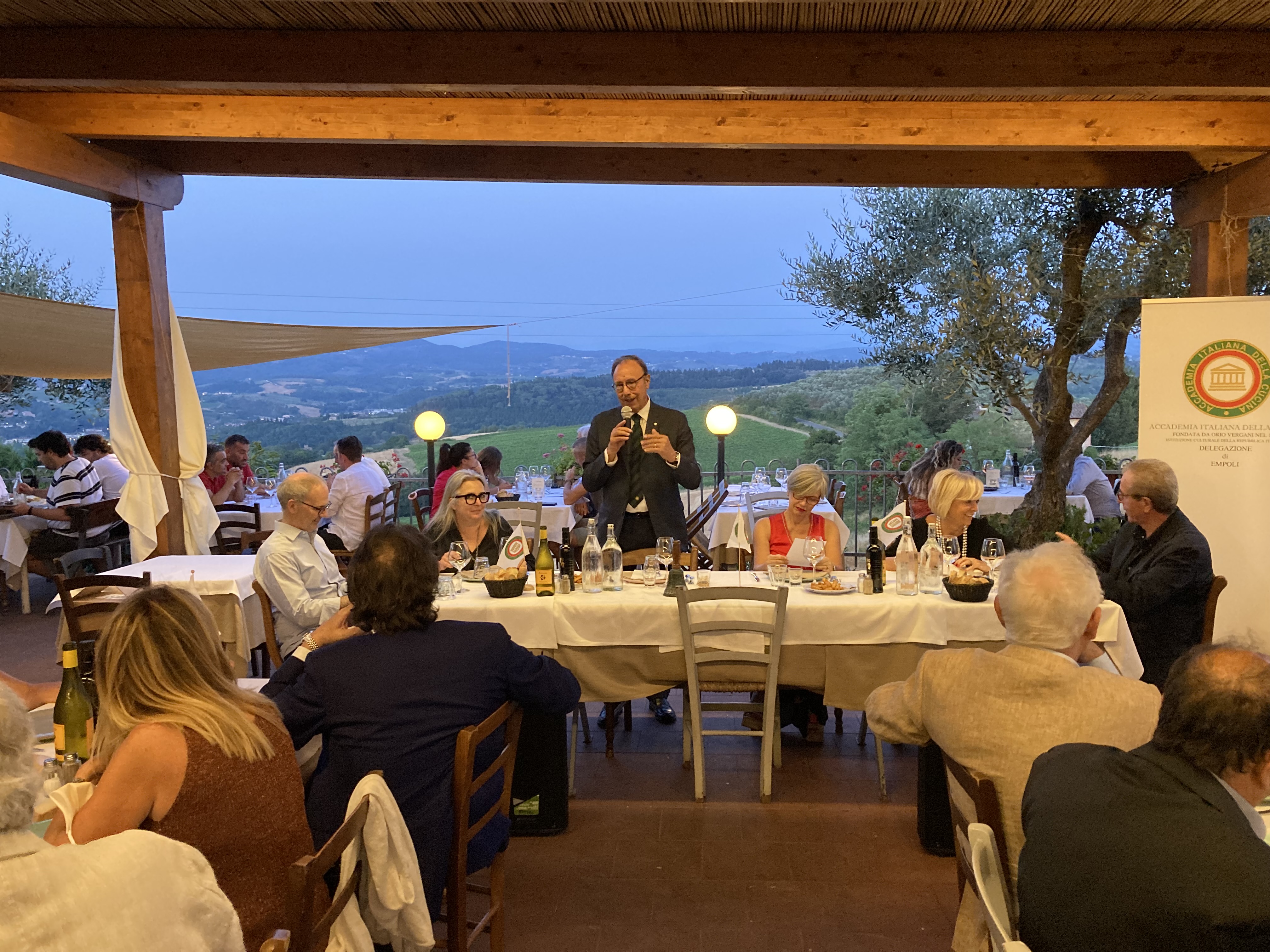 Piacevole ritorno, al fresco estivo della terrazza affacciata sulle colline circostanti, all’Osteria La Lanterna di Pulica (frazione di Montelupo Fiorentino), visitata altre volte in inverno all’interno del locale. Con la complicità di un tramonto rosso fuoco, sono stati serviti gli stuzzichini accompagnati da un fresco vino rosé e, mentre i saluti si alternavano con le conversazioni di rito, i commensali hanno preso posto per iniziare a gustare un ricco menu, fedele al tema, così ricco che pochi avrebbero scommesso fosse adeguato ad una calda serata estiva. E invece, i piatti si sono succeduti nell’approvazione generale e i convenuti hanno potuto apprezzare con curiosità e soddisfazione i vari antipasti proposti: le crespelline di farina di castagna, una superba terrina al vin santo, i fiori di zucca ripieni e un delicato carpaccio di podolica marinato con porcini. Non inferiori per originalità e gusto i tortelli maremmani con stracotto di daino al Chianti e il risotto al colombaccio. I secondi piatti hanno avuto meno successo soltanto perché arrivati dopo le altre numerose proposte ma tutti hanno assaggiato e approvato il rollè di coniglio al tartufo e il cinghiale in dolce forte proposto in una insolita veste al ribes. Ha chiuso una cheesecake fredda ai fichi caramellati che non ha deluso le aspettative. Un’ottima serata per un degno commiato prima della pausa estiva.