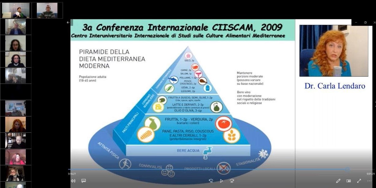 Per la V Settimana le Delegazioni di Sofia e Fermo hanno organizzato il convegno "Dieta Mediterranea: strumento di difesa contro la possibilità di ammalarsi", inizialmente previsto in presenza a Sofia ma poi, per la situazione sanitaria, si è tenuto su piattaforma digitale. Non casuale il coinvolgimento della Delegazione di Fermo nel cui territorio ricade la cittadina di Montegiorgio, la coorte più studiata da Angel Keys nel Seven Countries Study, lo studio che ha portato alla definizione di Dieta Mediterranea. Dopo i saluti della Delegata di Sofia Penka Nesheva sono seguiti quelli del Segretario Generale Roberto Ariani, dell'Ambasciatore S.E. Stefano Baldi, del sindaco di Montegiorgio dott. Michele Ortenzi e del Coordinatore Marche Sandro Marani. Penka Nesheva ha moderato il convegno che ha registrato 91 collegamenti tra cui Delegati e Accademici, con interventi del dott. Lando Siliquini, presidente del Laboratorio Piceno per la Dieta Mediterranea, autore del libro” Dieta Mediterranea il tempio della Sibilla”, del Delegato di Fermo Fabio Torresi, dal maestro Mario Liberati, autore del volume "La Dieta Mediterranea a Montegiorgio" seguiti dalla dott.ssa Antonia Parvanova, medico, esperto e ricercatore nel campo della gestione della salute. La relazione conclusiva è stata della dott.ssa Carla Lendaro, medico psiconeuroimmunologo che ha scientificamente dimostrato i molteplici benefici dalla pratica della Dieta Mediterranea. L'evento si è concluso con la video presenza dello chef Sami Flavio che ha illustrato come la base della sua creatività tragga origine e ispirazione da prodotti italiani legati alla Dieta Mediterranea e che, in luogo della cena di gala prevista, ha fatto scorrere le foto dei piatti che ne avrebbero costituito il menu accrescendo nei convenuti la voglia di vera convivialità, fondamento sia per la Dieta Mediterranea che per l'Accademia.