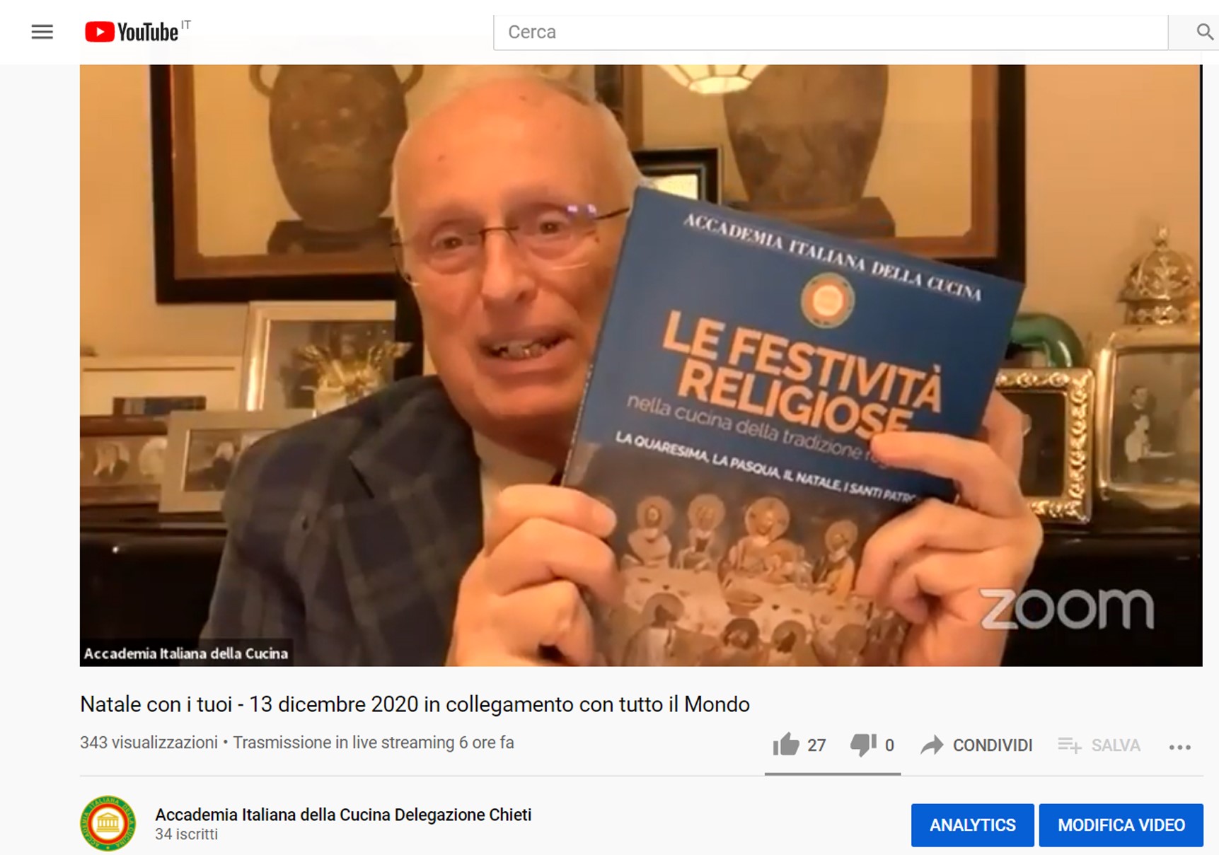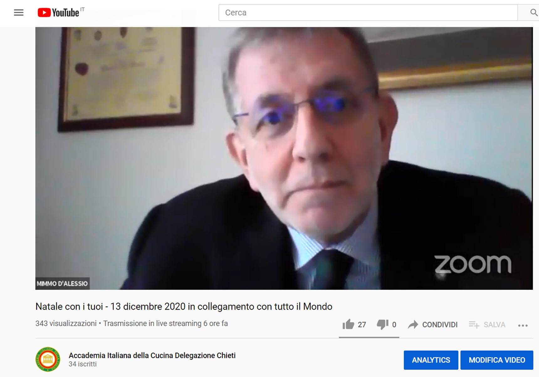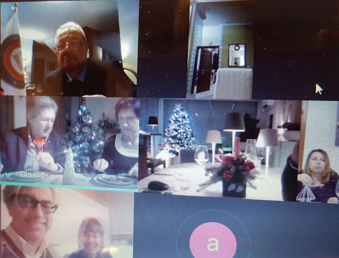 "Un grande abbraccio con la famiglia accademica per riunire i due emisferi e raccontare questo Natale dal punto di vista gastronomico": così il Delegato di Chieti, Nicola D'Auria, ha presentato "Natale con i tuoi", un incontro on-line (sulle piattaforme Zoom, YouTube e Facebook) sulle tradizioni natalizie a tavola, in cui sono intervenuti in diretta il Legato per lo Stato Città del Vaticano, i Delegati di San Francisco, New York, Rio de Janeiro, Lisbona, Sofia, Singapore, Brisbane, lo chef abruzzese Peppino Tinari e il presidente del Gruppo Virtuale Cuochi Italiani, Mario Caramella, in collegamento dalla Corea del Sud. Coordinati dal Vice Presidente Vicario Mimmo D'Alessio, e con il saluto del Segretario Generale Roberto Ariani, nelle due ore di incontro, gli intervenuti hanno delineato un quadro generale della cucina italiana delle feste in tutto il mondo, segnando anche idee e prospettive per il dopo-Covid. Un approfondimento culturale concluso con i bicchieri in alto per l'augurio di Buon Natale e di un più felice 2021. Foto 1. Delegati, Accademici e ospiti collegati sulla piattaforma. Foto 2. Il Segretario Generale Roberto Ariani. Foto 4. Il Delegato Onorario e Vice Presidente Vicario Mimmo D'Alessio conduttore dell'incontro. Foto 4. Mario Caramella in diretta da Jeju in Corea.