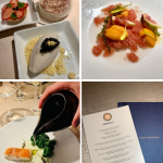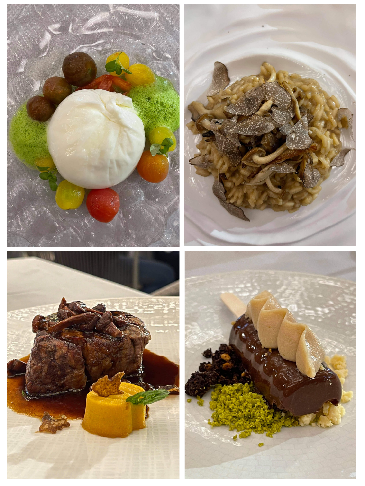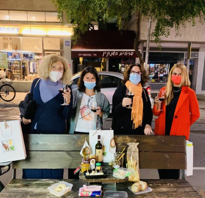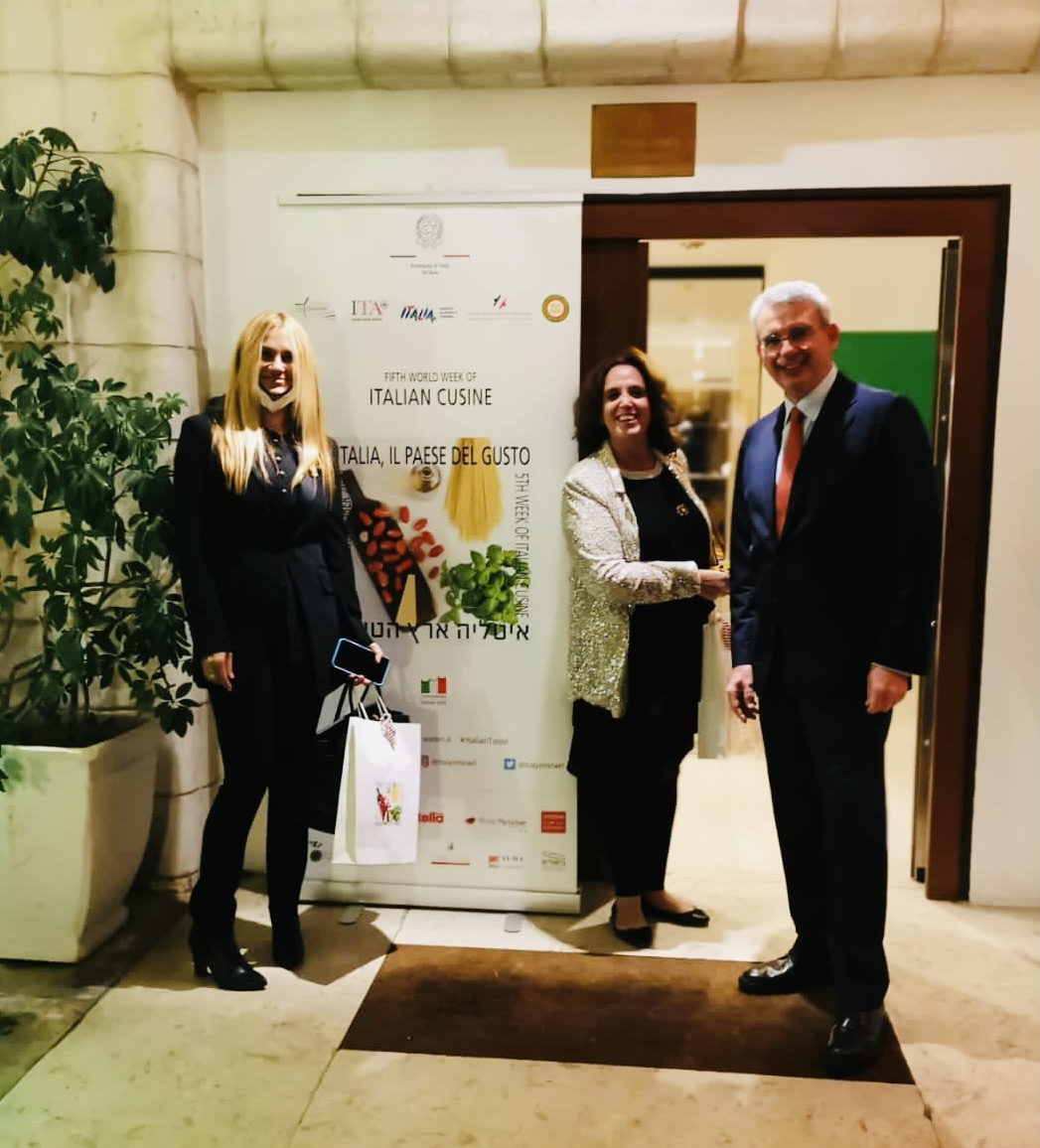 La Delegazione di Tel Aviv, tra i numerosi eventi on line realizzati in collaborazione con l'Ambasciata d'Italia, Camera di Commercio, Enit e Istituti di Cultura di Tel Aviv e Haifa, ha organizzato anche due iniziative in presenza: la cena di apertura preparata dallo chef Michele Bozzetto nella residenza dell'Ambasciatore d'Italia S.E. Gianluigi Benedetti e un aperitivo accademico a base di formaggi e pecorini italiani nella famosa via Shenkin di Tel Aviv. In foto 1 da sinistra. La Delegata Cinzia Klein, la Vice Delegata Sabrina Fadlun e S.E. l'Ambasciatore Gianluigi Benedetti. Foto 2. La Delegata con lo chef Michele Bozzetto. Foto 3. Aperitivo. Da sinistra: dott.ssa Claudia Fellus, la giornalista della Stampa Fabiana Magrì, Sabrina Fadlun e Cinzia Klein. Foto 4. I piatti preparati dallo chef Michele Bozzetto (ravioli burro e salvia; parmigiana di melanzane; uovo in camicia e crema di topinambur; controfiletto al rosmarino con purè di patate e broccoli e funghi trifolati; bignè alla crema al profumo d'arancia con cioccolato fondente).