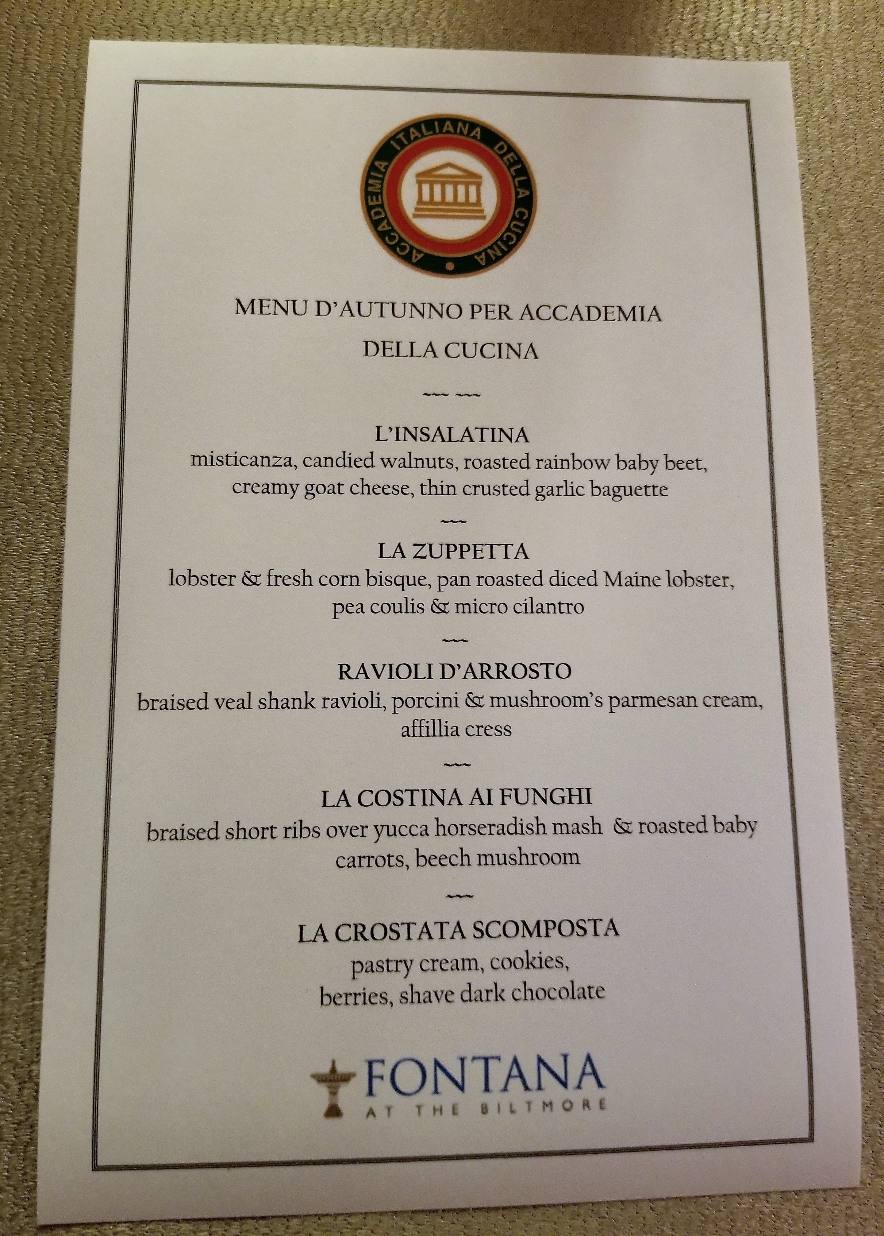 La Delegazione di Miami si è ritrovata per un altro appuntamento, questa volta presso il ristorante "Fontana" dell'hotel Biltmore di Coral Gables. L'albergo, costruito nel 1926, è stato dichiarato monumento storico nazionale americano e continua a mantenere inalterato il suo fascino. La sala che ha ospitato gli Accademici, impreziosita da specchi e boiseries, ha offerto ai convenuti una cornice elegante. Lo chef Giuseppe Galassi e la manager Raquel Alaniz hanno dato il benvenuto ai presenti ed illustrato il tema della cena dedicata ai sapori d'autunno.