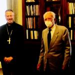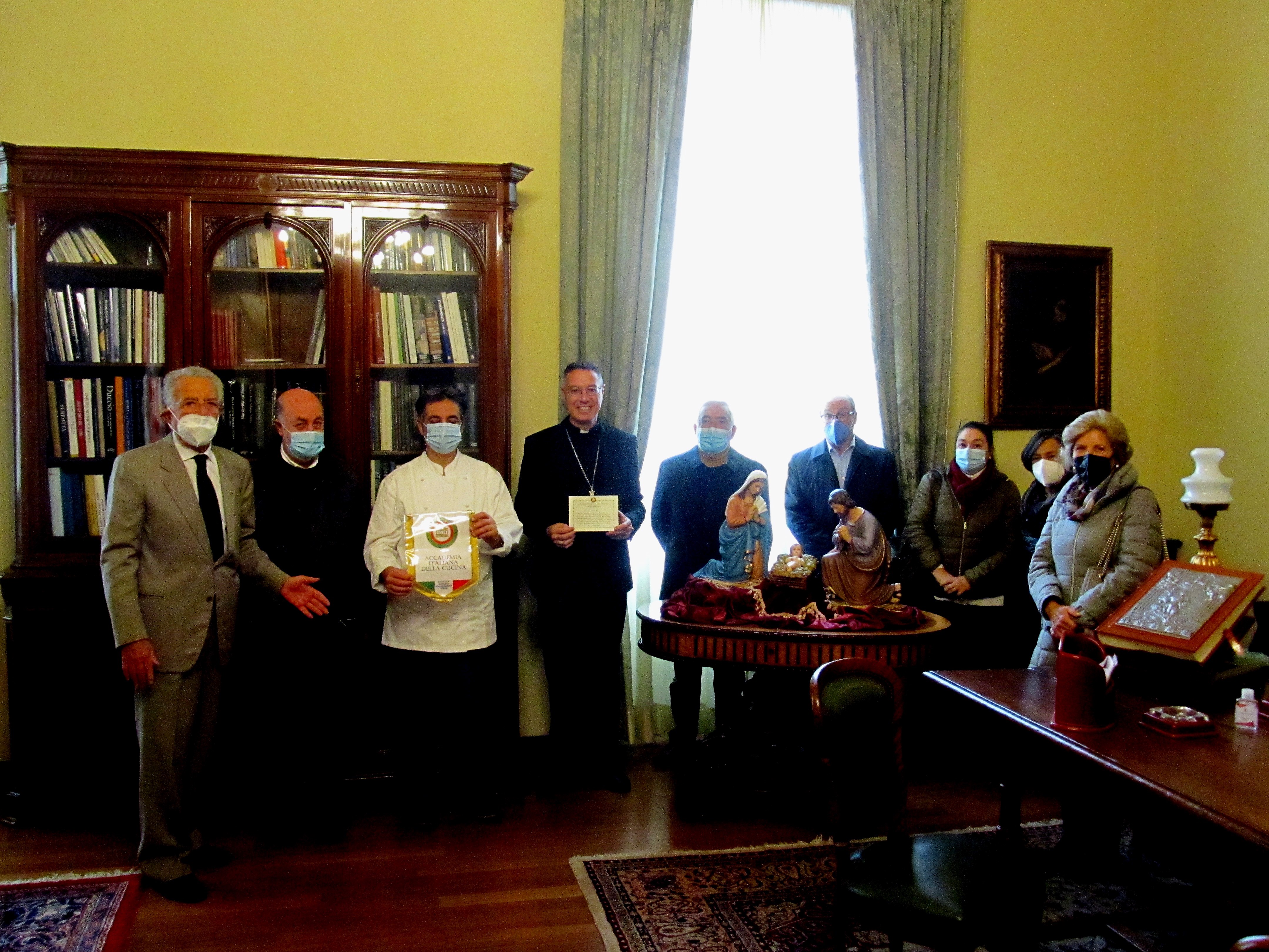 Una rappresentanza della Delegazione di Messina è stata ricevuta dal Vescovo ausiliare di Messina S.E. Mons. Di Pietro (in foto 1 con il Delegato Francesco Trimarchi) per formalizzare un'iniziativa benefica della Delegazione a sostegno delle persone meno fortunate. La Delegazione, infatti, condividerà idealmente il Pranzo di Natale con oltre 50 ospiti delle Case di Accoglienza dirette da don Franco Pati (Casa Veronica che ospita ragazze madri con i loro piccoli, lattanti, bambini e adolescenti; la Casa Santa Maria della Strada che accoglie bambini e adulti senza tetto; la casa del quartiere "Provinciale" assiste sbandati dipendenti dall’abuso alcoolico). Il pranzo sarà affidato a Pippo Viani, chef patron di "Al Gattopardo", esercizio già incluso nella Guida alle Buone Tavole della Tradizione e riconvertito esclusivamente all’asporto dall’inizio dell’emergenza Covid. In foto 2, il momento della consegna allo chef del guidoncino dell’Accademia e dei biglietti augurali per gli ospiti delle Case di Accoglienza. Da sinistra: il Delegato Trimarchi, don Franco Pati, Pippo Viani, S.E. Mons. Di Pietro, l'Accademico Luigi Ciraolo, il Segretario-Tesoriere Giovanni Rossi, la signora Katia Viani, Marina Ragusa consorte del Consultore Salvatore Ragusa e la Vice Delegata Patrizia Rizzo Marullo.