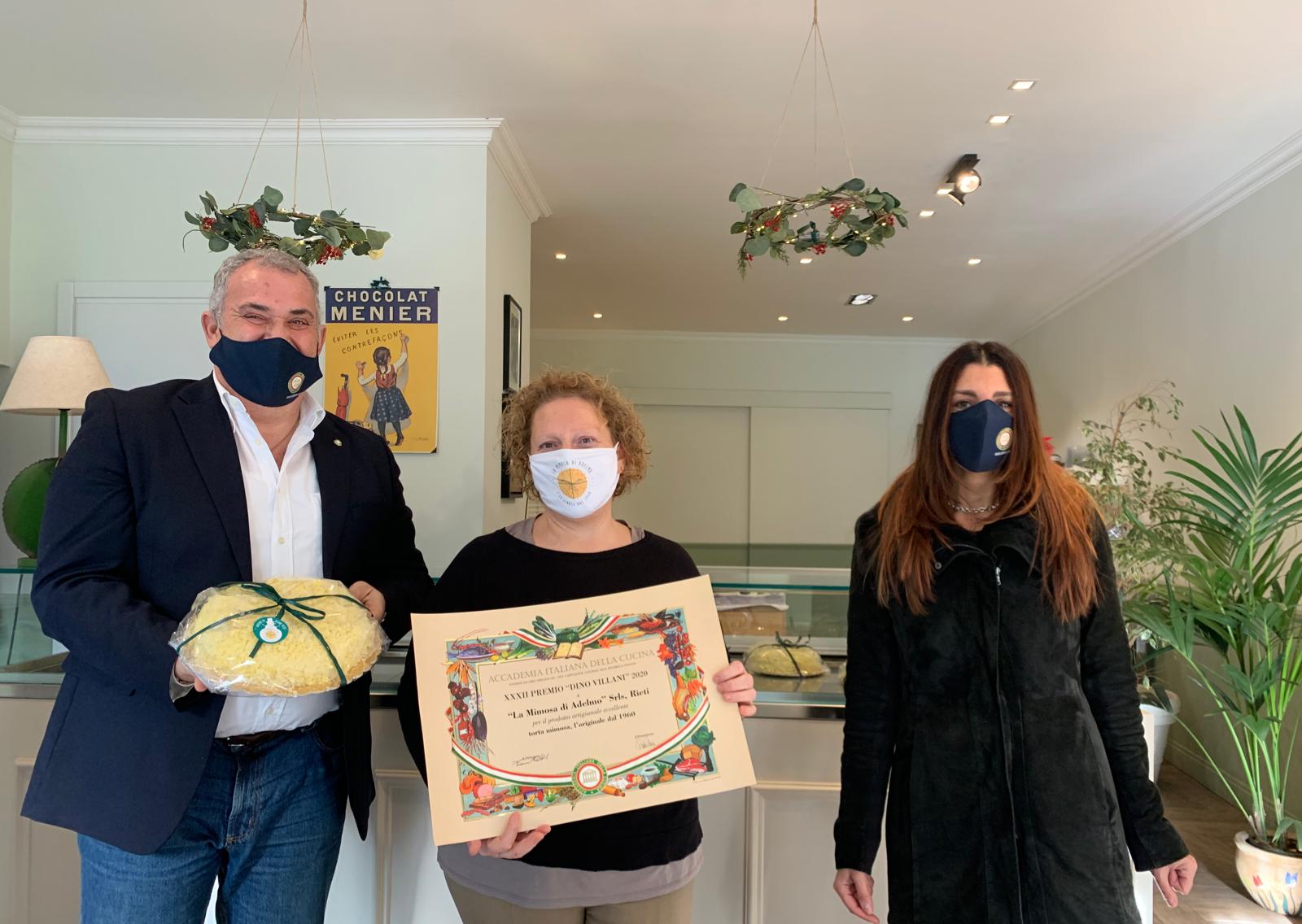 Il Delegato di Rieti dell’Accademia Italiana della Cucina ha consegnato il prestigioso premio Dino Villani alla Soc. Coop. Agricola Mucilla 2004 per la “Genziana Re Genzio” ed alla Mimosa di Adelmo Srls per la “Torta Mimosa, l’originale dal 1960”. Purtroppo, a causa della attuale situazione epidemica, non si potuto procedere ad una cerimonia di consegna e gli attestati sono stati consegnati separatamente dal Delegato Francesco Maria Palomba e dal Consultore-Segretario Maria Luisa Trilli presso le sedi delle società, dove i premi sono stati ricevuti da Enea Mancosu e Maria Paola Renzi, titolari delle due realtà imprenditoriali (foto 1 e 2). Il premio Dino Villani consiste in una pregevole opera grafica, è dedicato alla memoria di uno dei fondatori e a lungo Vice Presidente dell’Accademia. È riservato ai produttori che si distinguono nella lavorazione artigianale di un “prodotto alimentare” di rilevante e specifica qualità organolettica, lavorato con ingredienti nazionali tracciabili, di prima qualità e con una ben identificata tipicità locale.
