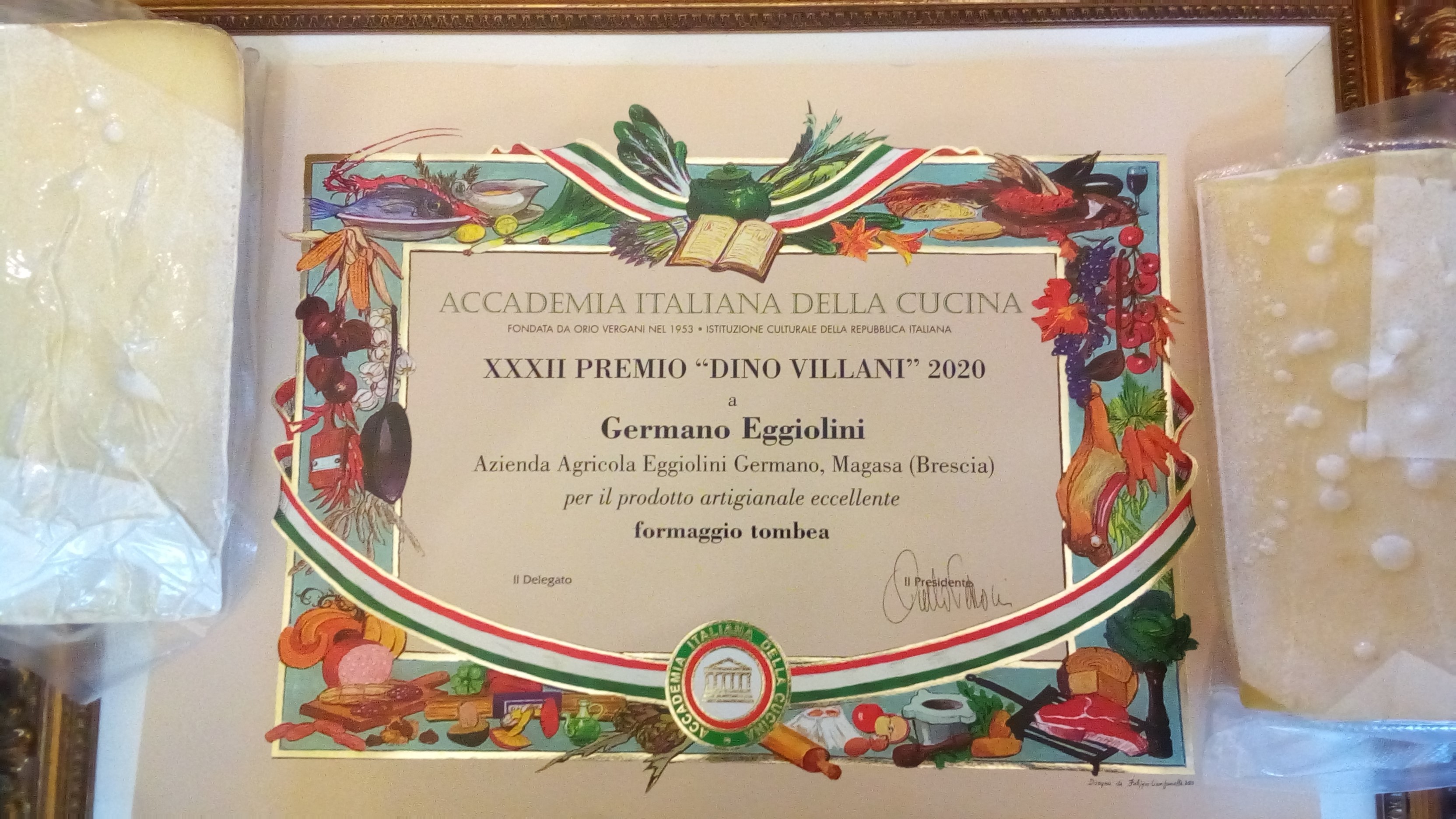 La Delegazione di Brescia si è ritrovata presso il ristorante "La Sosta di Nozza" a Vestone (BS) per la consegna del Premio "Dino Villani" al produttore del formaggio Tombea, Germano Eggiolini, e per gli auguri di Natale. Per la preparazione dei piatti gli chef si sono sbizarriti con l'utilizzo del prodotto premiato. Foto 1. Il Delegato Giuseppe Masserdotti e Germano Eggiolini. Foto 2. Accademici a tavola. Foto 3. La prestigiosa opera grafica per il premiato.