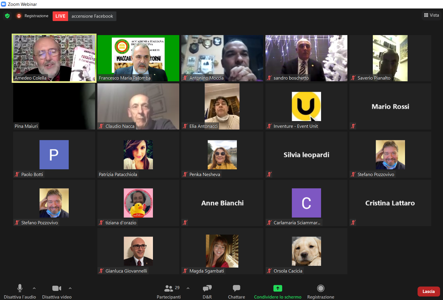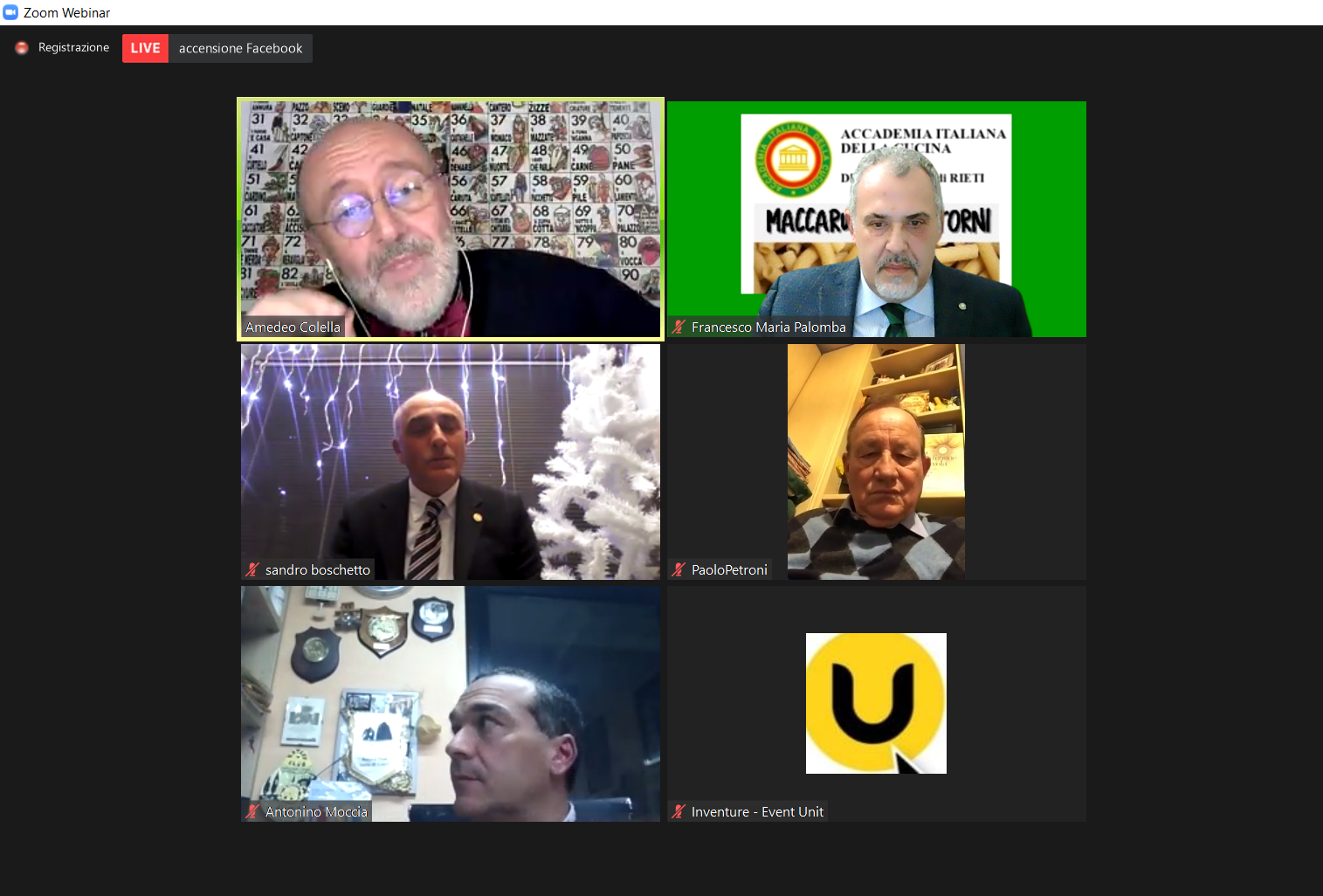 La Delegazione di Rieti, non potendosi riunire di persona, ha organizzato il 4 dicembre scorso, un interessante webinar dal titolo “Maccarune & dintorni”. Il convegno, al quale ha partecipato il Presidente Paolo Petroni portando i saluti dell’Accademia, si è svolto in interclub con i Rotary Club Rieti e Isola di Capri. Relatore è stato lo storico ed umorista napoletano Amedeo Colella, il quale, con umorismo e sagacia, unito ad una buona dose da cultura, ha parlato della storia della pasta, della sua evoluzione, dai greci ai giorni nostri, con aneddoti e “paraustielli”. Il Delegato di Rieti Francesco Maria Palomba ha svolto le funzioni di moderatore dell’evento, nel corso del quale il dott. Sandro Boschetto, gastroenterologo, ha parlato della pasta dal punti di vista salutistico e nutrizionale. Sulla pagina Facebook della Delegazione, il video integrale dell'incontro.