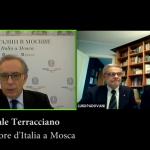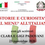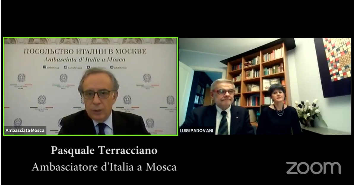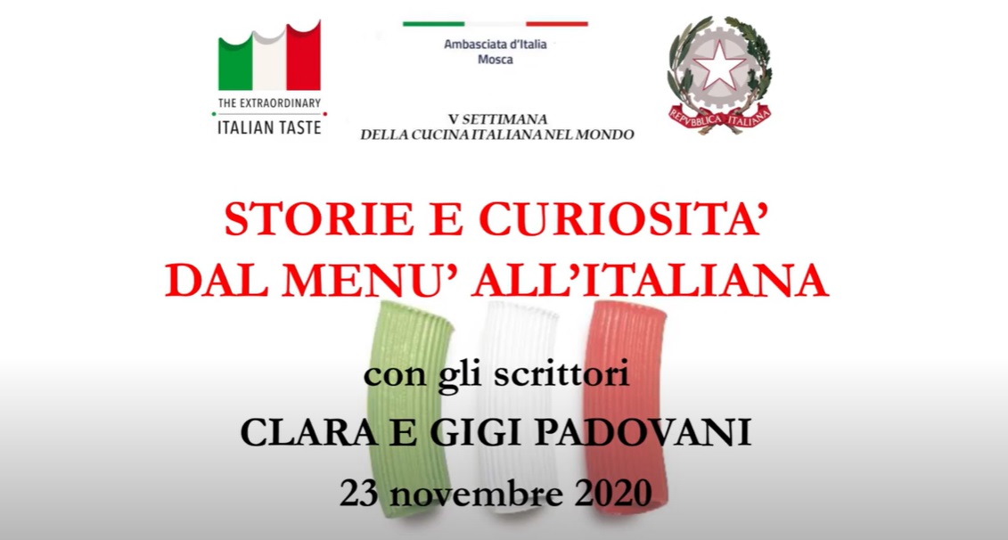 In occasione della V Settimana della Cucina Italiana nel mondo, il 23 novembre si è tenuto il webinar promosso dall'Ambasciata d'Italia a Mosca dal titolo "Storie e curiosità dal menu all’italiana" con protagonisti Clara e Gigi Padovani - Accademico onorario di Torino Lingotto e Membro del Centro Studi "Franco Marenghi" - autori di numerosi libri ed esperti di cultura agro-alimentare. Durante la conferenza on line che è possibile rivedere su YouTube, i due scrittori hanno ripercorso la storia di alcuni piatti italiani molto famosi all'estero, seguendo un menu tradizionale all'italiana: gli antipasti, con l'insalata russa e il carpaccio; i primi piatti, con la pizza e gli spaghetti; i secondi, con il baccalà e il pollo alla Marengo; i dessert con il babà, la zuppa inglese e il tiramisù; a concludere la piccola pasticceria, ovvero i gianduiotti. L'evento di apertura della Settimana è stato introdotto da S.E. Ambasciatore Pasquale Terracciano (in foto 2 con i relatori).