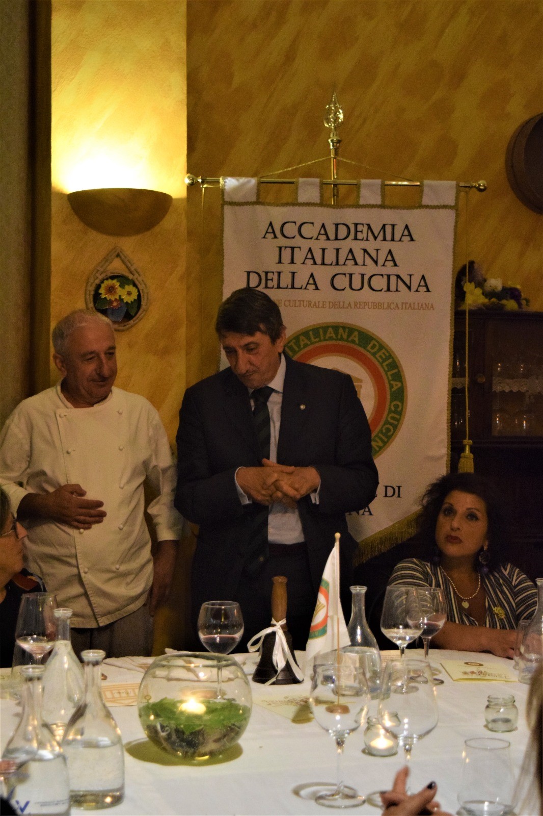 Fattoria di Petriolo, Osteria di Golpaja, nomi antichi e morbide colline, coltivate da sempre con attenzione e passione: è qui che la Delegazione di Empoli ha deciso di organizzare l’appuntamento di settembre. In questo contesto incantato i numerosi Accademici convenuti, insieme ai molti ospiti, hanno visto avvicendarsi le svariate pietanze del ricco menù proposto, insieme ad un servizio davvero impeccabile e puntuale mentre il maitre sommelier Lorenzo Caponi forniva spiegazioni sapienti sui vari vini serviti. I piatti proposti non hanno deluso le aspettative dei convenuti, che così hanno potuto apprezzare l’ uovo pochè fritto, i paccheri al ragù di cinta, la frittura mista di pollo, coniglio e verdure e per finire zuppa inglese, tipico dolce della tavola toscana. Il fritto come tema dell’anno accademico da sempre protagonista della cucina contadina toscana, rivisitato dallo chef Pinciaroli secondo diverse modalità tecniche di cottura da lui illustrate alla fine della serata. Soddisfazione generale per l’ambiente, per l’organizzazione meticolosa opera del Simposiarca Giovanni Donnini e per la qualità dei piatti serviti, è stata infine espressa, a conclusione della serata, dal Coordinatore territoriale Roberto Doretti, convenuto per l’occasione insieme ad una significativa rappresentanza della Delegazione di Montecatini e alla Delegata del Mugello Monica Sforzini.