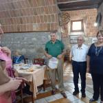 La frescura collinare dell'Agriturismo Cà Monti sulle pendici di Montemorosino di Fontanelice ha giovato non poco alla riuscita della conviviale agostana. La cura nella preparazione dei piatti con i prodotti allevati e coltivati nell'omonina azienda agricola ha soddisfatto appieno gli Accademici che hanno apprezzato i sapori, la bontà e la gradevoliezza del cibo, dalla zuppa fredda di verdure agli strichetti e tortellacci, da un arrosto al latte di carne di mora romagnola ad un gelato allo zenzero. Plauso finale per questa ultracentenaria attività condotta dalla famiglia Monti con la consegna del piatto dell'Accademia. Foto 1. Una tavolata di Accademici. Foto 2. Consegna del piatto. Foto 3. Gelato allo zenzero con biscottini del forno a legna.