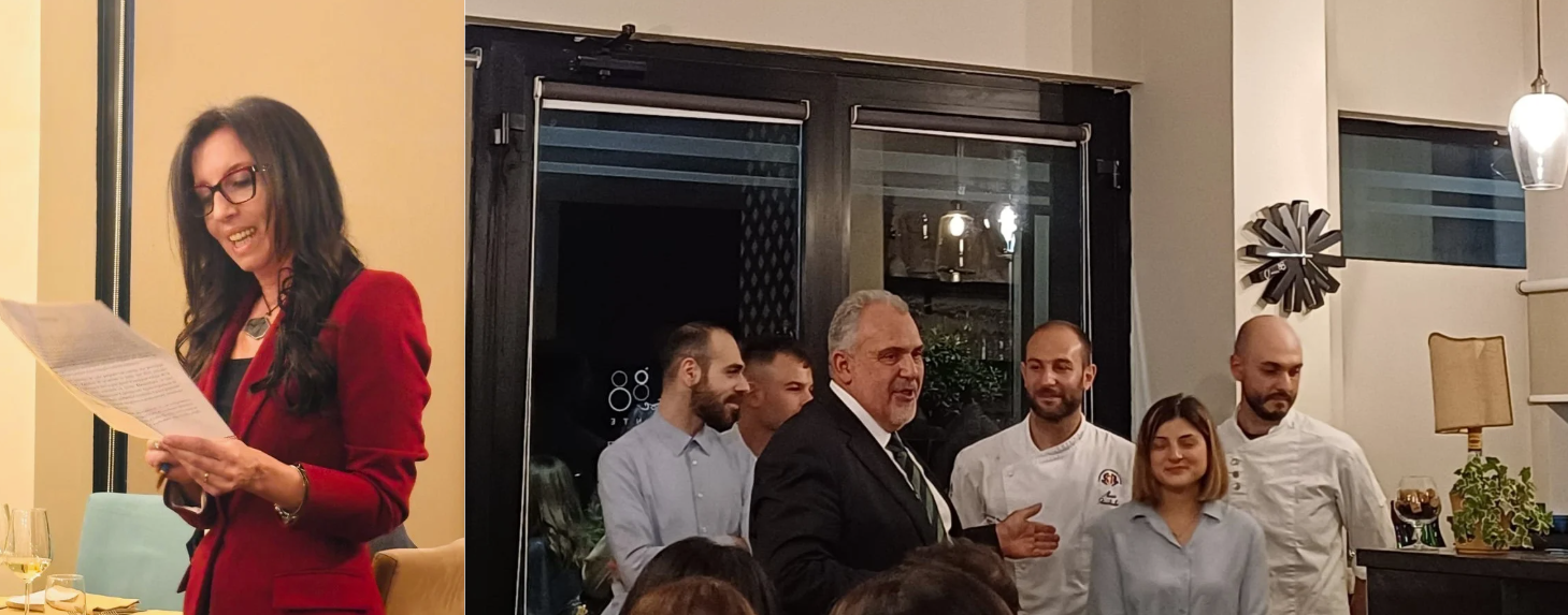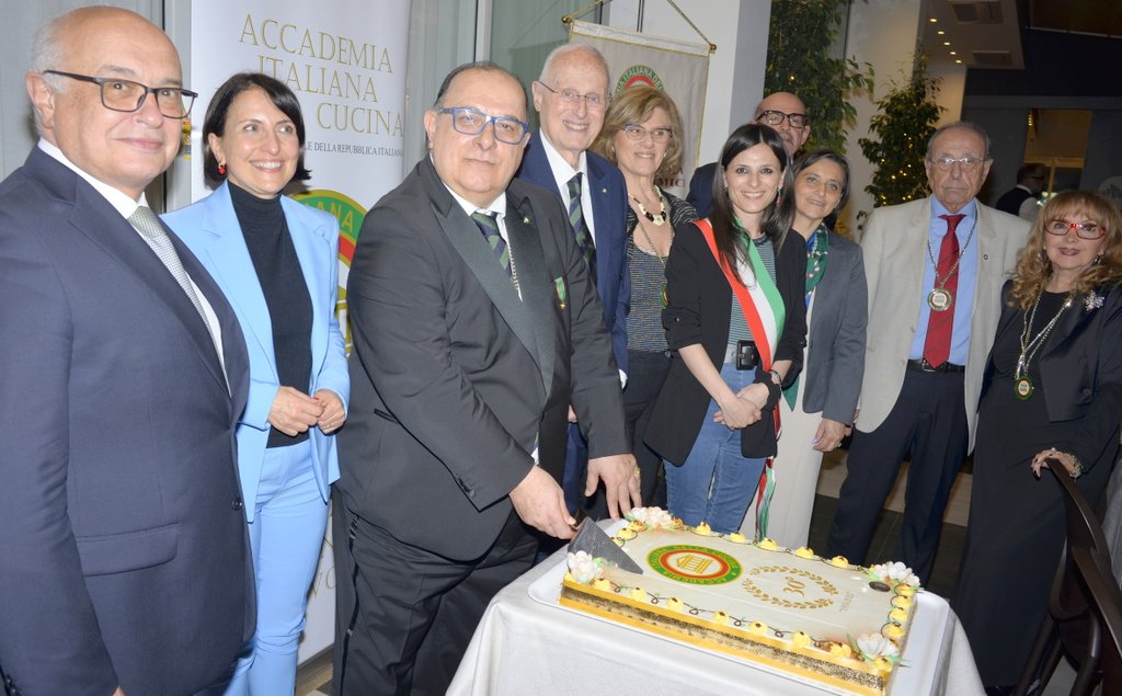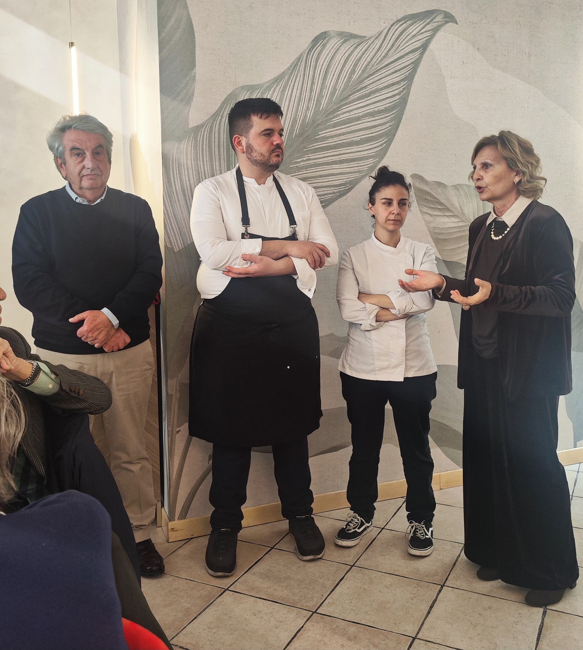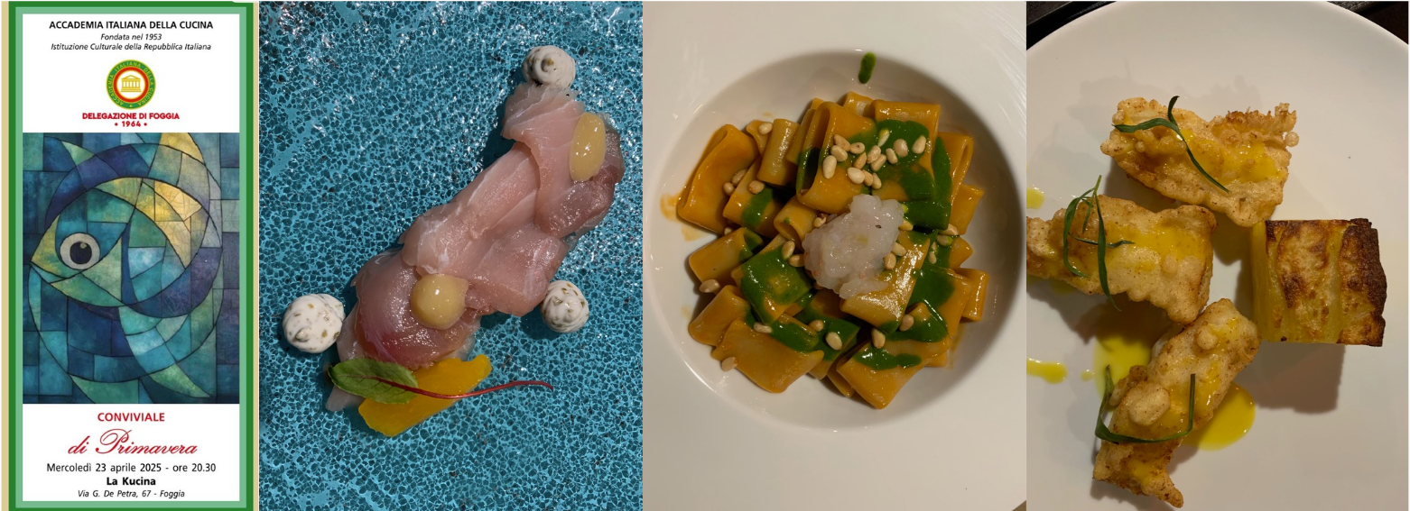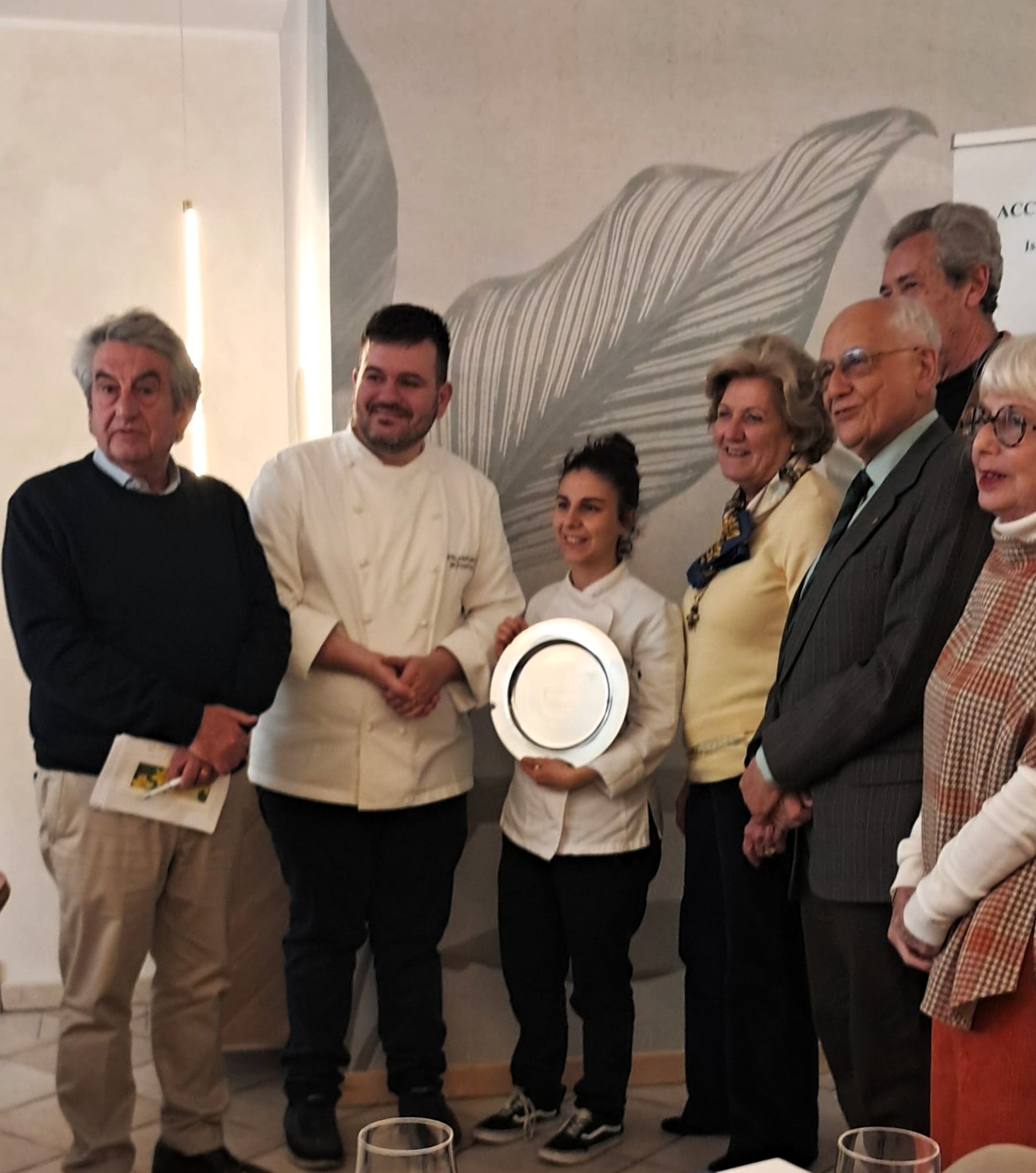 La riunione conviviale di primavera 2025, organizzata dalla Simposiarca Anna Maria Vasco, si è svolta presso il ristorante “La Kucina” dei fratelli Andrea, Roberto e Luca Barile, già titolari di un forno, più volte premiato anche a livello nazionale per panettoni e colombe artigianali, e del contiguo Bar “Terzo Millennio”. Il locale, progettato dall’architetto Cesare Corfone, dal design moderno a base di acciaio e legno chiaro, dispone di cucina completamente a vista, di forno-barbecue “Josper” e saletta riservata. Il menù, concordato con il gestore Luca Barile, chef e sommelier, è stato a base di pesce e prodotti della stagione primaverile: carpaccio di ricciola; calamarata con scampi e finocchietto selvatico; baccalà pastellato con salsa allo zafferano; colomba di “Andrea Barile”, con sorbetto all’arachide salata per dessert. Ad accompagnare le portate, il vino “Rosalia”, prodotto con uve Nero di Troia, delle Cantine Biancardi. Dopo la presentazione, da parte della Simposiarca, del locale, del menù e dello chef Matteo Prencipe, il Delegato Valerio Antonio Vinelli ha presentato ai convitati la nuova Accademica Renata Montini. A fine convivio ha donato il guidoncino della Delegazione e la vetrofania 2025 dell’Accademia Italiana della Cucina al gestore Luca Barile. Sempre nutrita la partecipazione di ospiti e aspiranti Accademici.