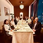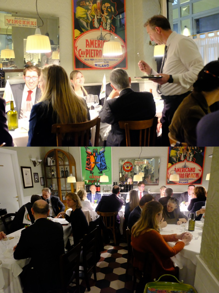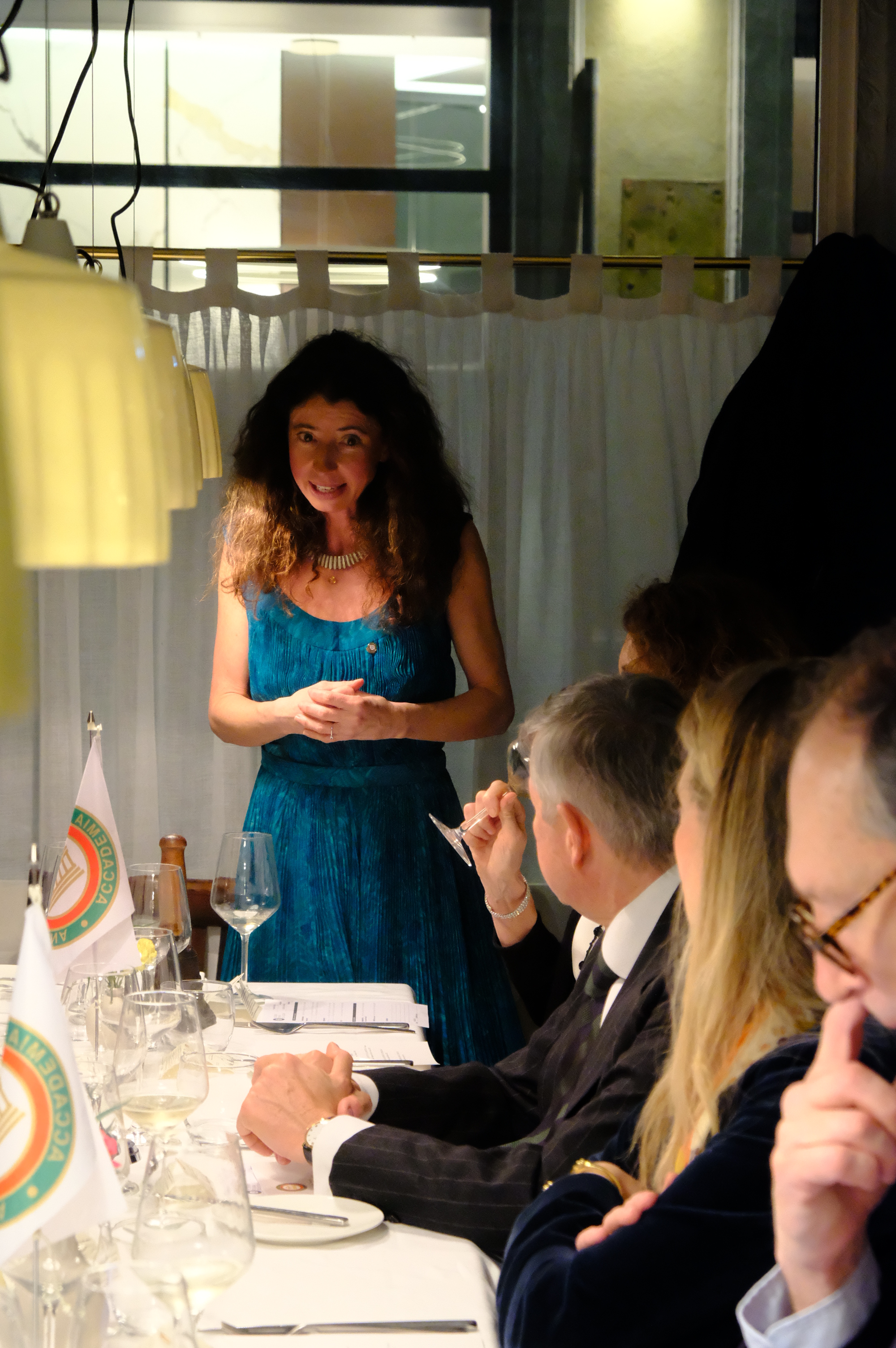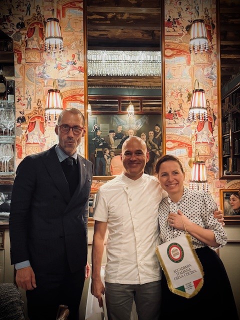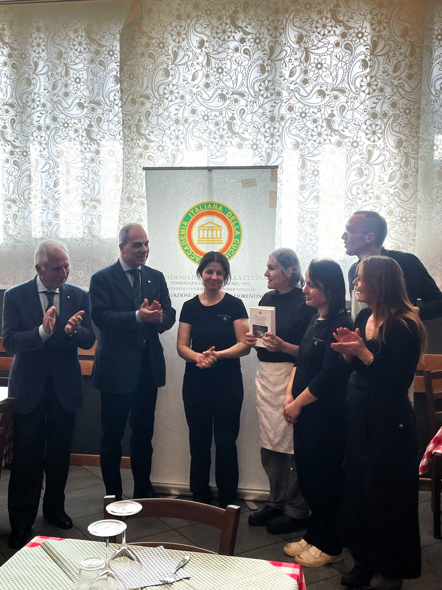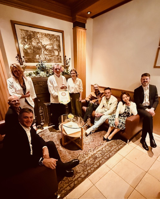 Stampe Alinari, mosaici di pregio e un caminetto del 1500 ricostruito al 36mo piano di una torre sopra la scenica Tokyo Station: così accoglie la Delegazione il ristorante Antica Osteria del Ponte. Dopo numerose segnalazioni dagli Accademici, la Delegazione di Tokyo ha organizzato qui una riunione conviviale. Il ristorante, presente da oltre 20 anni, è gemellato con l’omonimo di Cassinetta di Lugagnano, con cui mantiene una stretta collaborazione. Nella saletta privata riservata agli ospiti, splendida la vista su Tokyo e apprezzata la privacy per il discorso introduttivo sull’importanza della valutazione dei ristoranti, in particolare di quelli storici che rappresentano la stratificazione di gusti e richieste del pubblico giapponese. Il menù ha stupito con piatti raffinati e sorprendenti: molto apprezzati la lasagna di gorgonzola e verdure di stagione e il filetto di Wagyu. L’abbinamento dei vini ha sorpreso per l’alta qualità in rapporto al prezzo, possibile grazie all’importazione diretta da produttori italiani da parte del ristorante. A fine serata, la vice Delegata Marta Marmiroli ha consegnato allo chef Stefano Dal Moro il guidoncino dell’Accademia, con la promessa di un prossimo ritorno.