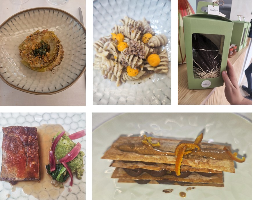 Domenica delle Palme, Simposiarca l’Accademica Adele Penna Verso, è stato visitato Demenna Luogo di Ristoro a San Marco d’Alunzio, un’eccellenza gastronomica del territorio affermatasi nel giro di pochi mesi grazie allo straordinario spessore degli chef, Martina Dodeci e Rushan Xhafaj. Dopo il benvenuto della cucina, sono stati serviti “fior fior di carciofo”, salsa di pane, lattuga di mare e liquirizia calabrese; fusilloni rigati "Metodo Massi", ragù bianco di agnello nostrano, crema di carote alle spezie e pepe Sancho; terrina di maialino Segovia - San Marco, patata al verde, scarola e cipolla rossa in agrodolce. Raffinato il dessert Ottofoglie di cioccolato fondente ecuadoriano, praline di mandorla e mandarino candito e il vino delle cantine Perripò di Caruso & Minini, un Perricone in purezza, potente e ricco di sfumature. Dopo il pranzo, si è espletato il sorteggio delle uova di cioccolato, opera dei due chef ai quali, in questa occasione particolarmente apprezzata, è stato consegnato il Piatto e la vetrofania dell’Accademia. L’appuntamento ha previsto la Santa Messa nella Chiesa Madre del millenario centro urbano, e una visita al Museo della cultura e delle arti Bizantine e Normanne, ospiti del Sindaco di San Marco d’Alunzio, Filippo Miracula.