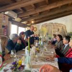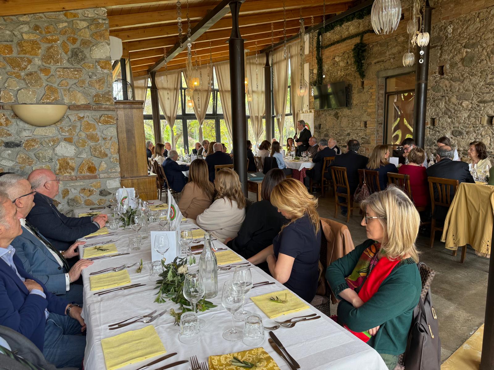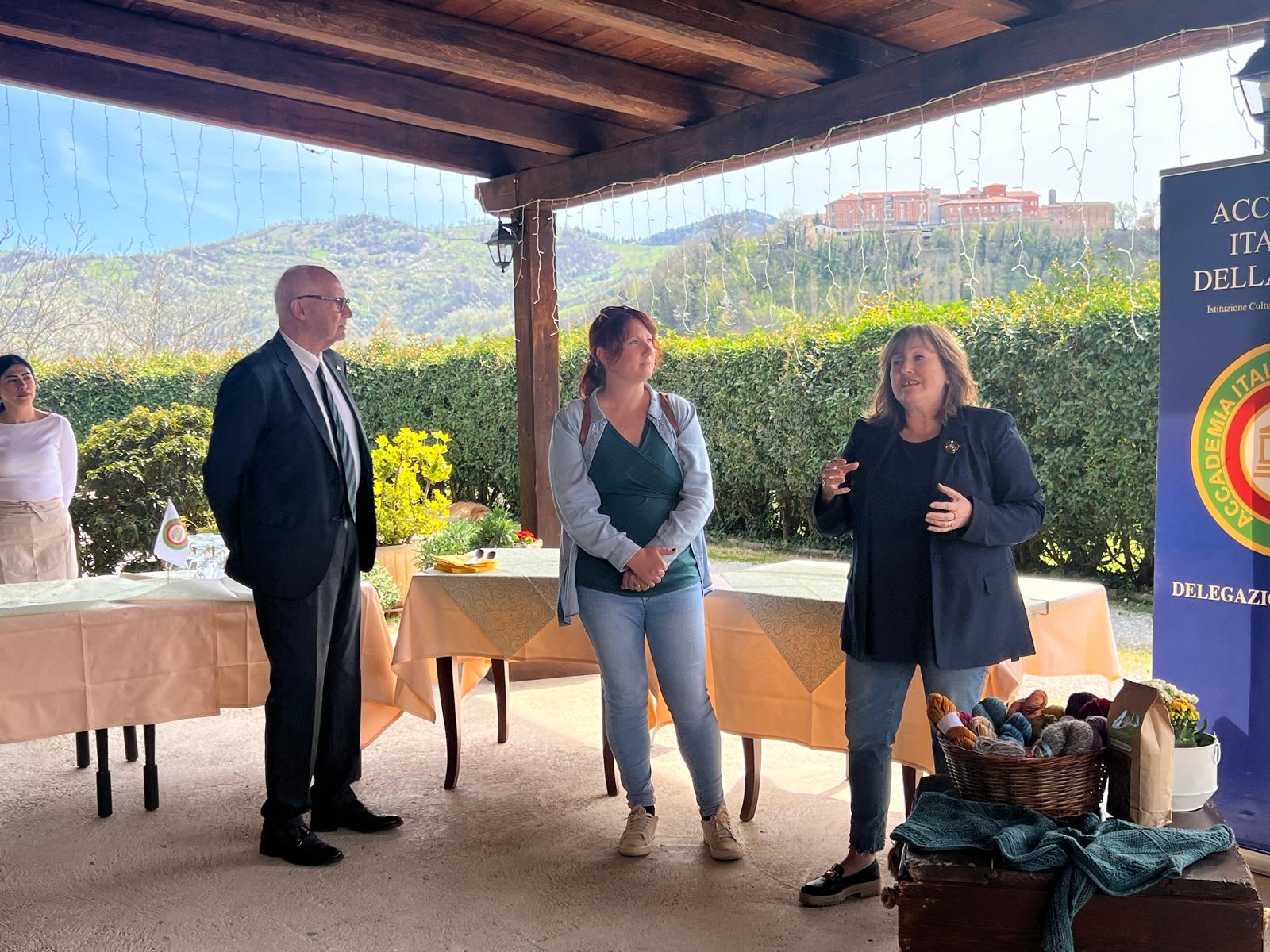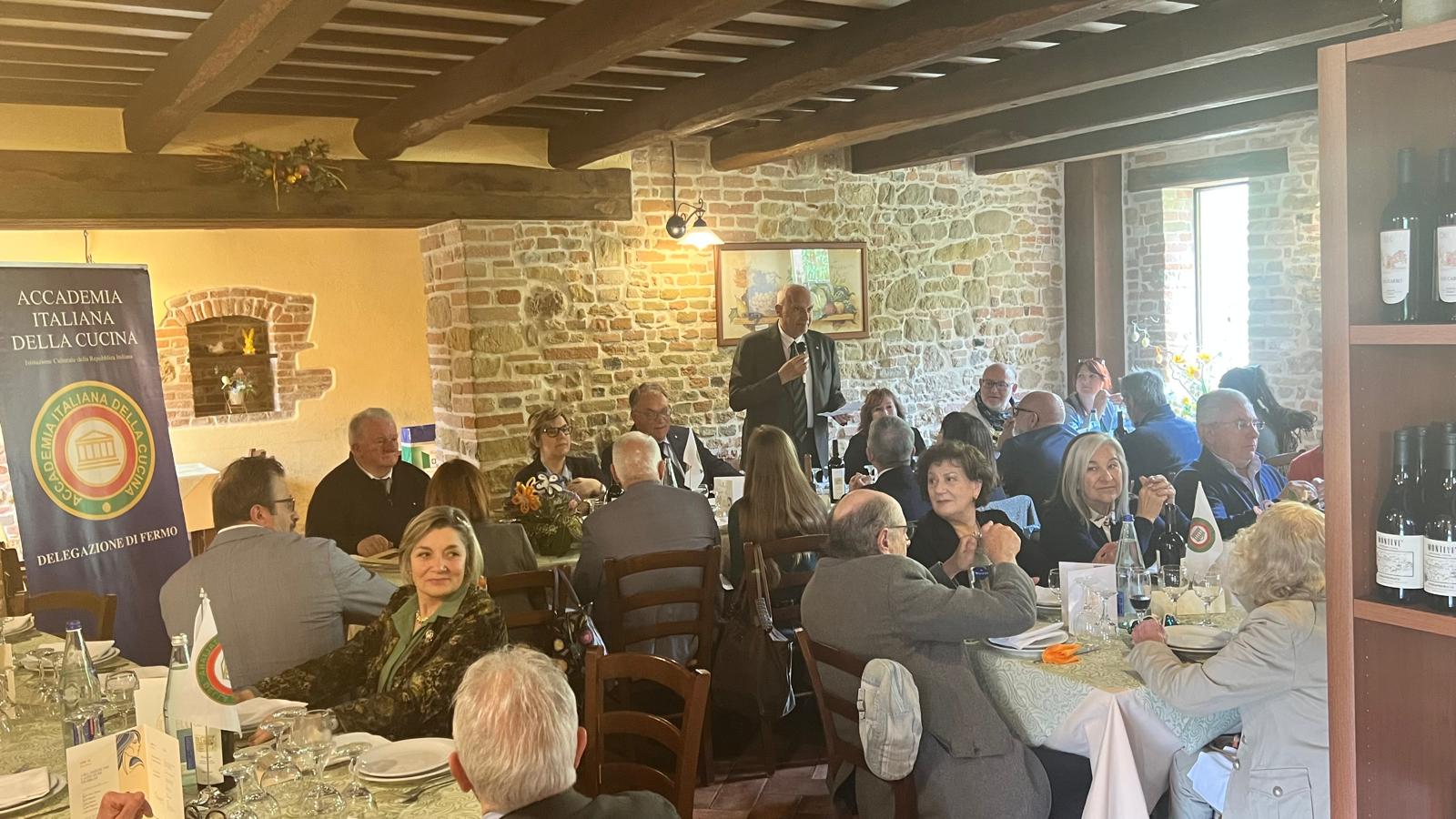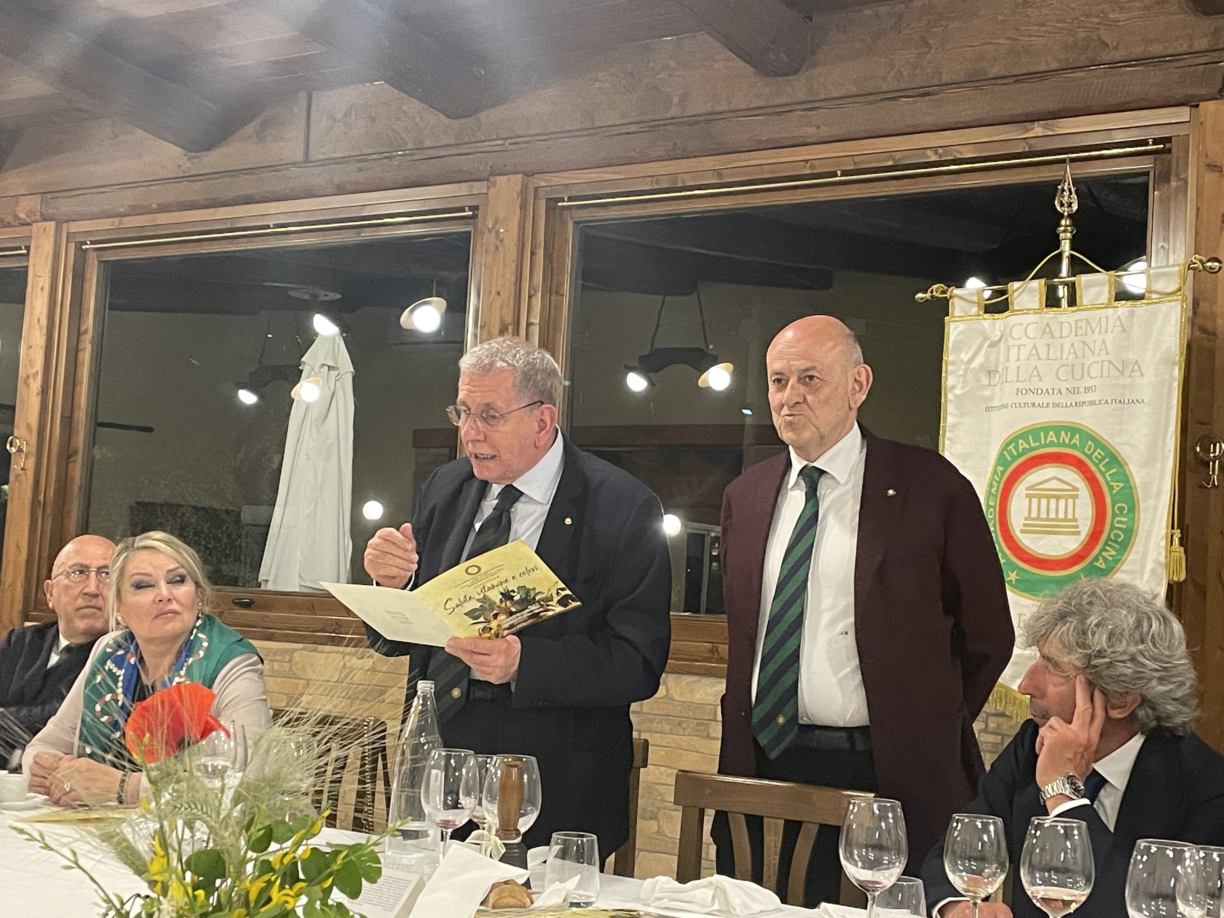 La Delegazione di Fermo si è riunita ad Amandola, una delle porte del Parco Nazionale dei Monti Sibillini, per una riunione conviviale dedicata agli auguri pasquali. Ad accogliere i partecipanti presso l’agriturismo “Madonna di Piana” della famiglia Masili è stata la Simposiarca Maria Laura Talamè, organizzatrice di un evento originale che ha messo in luce i prodotti tipici del territorio e il loro legame con la biodiversità dei Sibillini. Durante l’aperitivo servito nel portico, accompagnato da specialità locali come salumi, formaggi, ciambella strozzosa e olive fritte, sono stati condivisi racconti e leggende legati alle montagne, tra sibille, fate e pastori. Maria Laura ha presentato Giulia Alberti, produttrice di lane naturali, e Pietro Ripani, guida del Parco, che hanno arricchito la conversazione con curiosità e approfondimenti. Il contributo dell'Accademico Lando Siliquini con racconti e poesie ha completato l’atmosfera. Il pranzo, servito all’interno del casolare, ha proposto una fusione tra piatti locali e suggestioni sarde, come i ravioli ispirati ai culurgiones e il maialino tenerissimo e saporito, a svelare le origini della famiglia Masili. La passione e la competenza con cui Maria Laura ha condotto l’incontro hanno entusiasmato tutti i presenti. L’incontro si è concluso con l’investitura di tre nuovi Accademici e con il tradizionale scambio degli auguri pasquali, alla presenza di graditi ospiti come Pier Paolo Veroni, Coordinatore Territoriale Emila e Delegato Carpi-Coreggio, e Sauro Vittori, Consultore di Macerata.