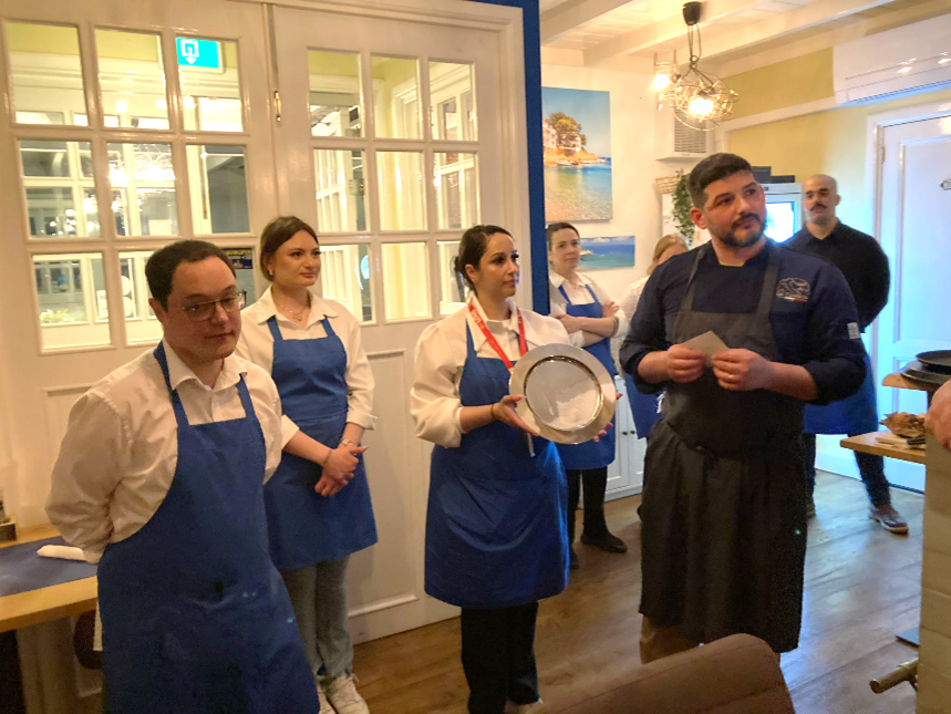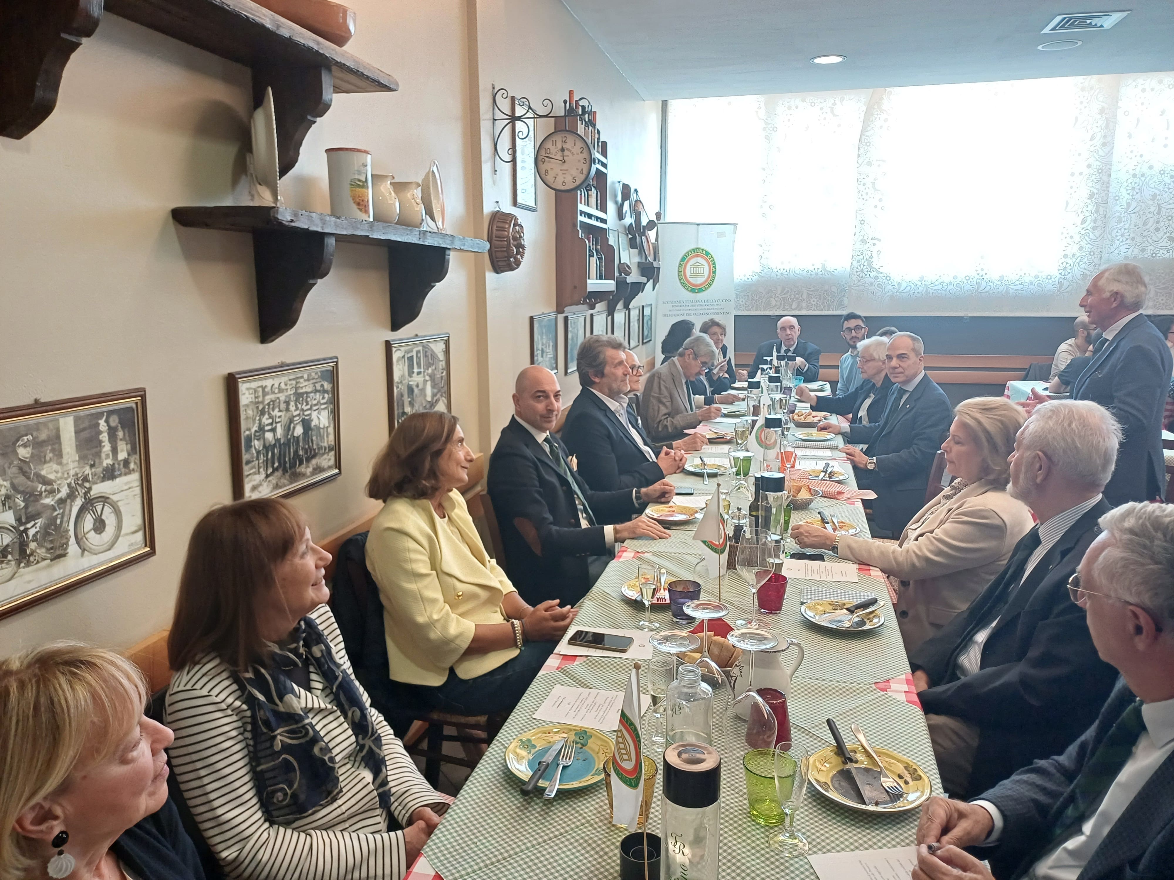 La Delegazione ha fatto visita per la seconda volta al ristorante La Viestana di Lathum, sotto la guida del simposiarca Rob Cozzi. Il menù proposto si conferma saldamente ancorato alla tradizione pugliese, con pomodorini e olive come filo conduttore in diverse portate. Degni di nota il pane fatto in casa e la curata presentazione dei piatti. L’abbondanza degli antipasti, seppur leggermente eccessiva, ha offerto un’ampia panoramica delle proposte della cucina. Primo e secondo piatto si sono distinti per buona esecuzione e gusto equilibrato. Il tiramisù al pistacchio rappresenta una piacevole variante dal sapore tipicamente meridionale. I vini serviti si sono rivelati tutti di ottima qualità, anche se non sono mancati spunti di discussione sugli abbinamenti con le singole portate. L’accoglienza calorosa e il servizio cordiale hanno contribuito in modo decisivo a rendere l’esperienza piacevole, compensando con entusiasmo alcune piccole imperfezioni.