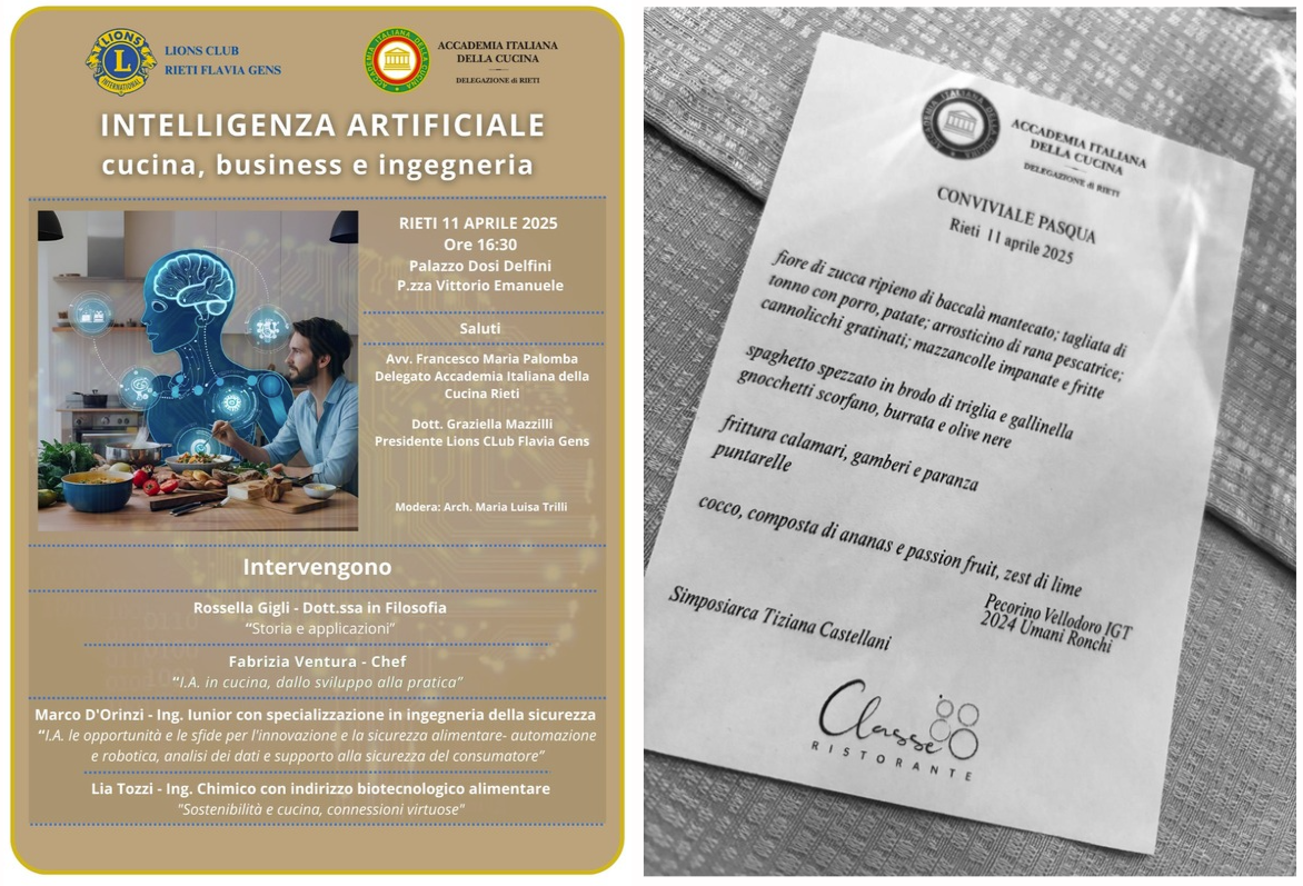 Si è tenuto a Palazzo Dosi il convegno “Intelligenza artificiale, cucina, business e ingegneria”, organizzato dalla Delegazione di Rieti dell’Accademia Italiana della Cucina e dal Lions Club Flavia Gens. Dopo i saluti della Presidente del Lions Club Flavia Gens, Graziella Mazzilli, e del Delegato di Rieti, Francesco Maria Palomba – che ha invitato alla cautela sull’uso dell’AI in cucina - sono intervenuti tre relatori. La filosofa Rossella Gigli ha ripercorso la storia dell’AI, dal test di Turing al moderno “Vitruvian”. La chef Fabrizia Ventura ha raccontato le sue esperienze con un’azienda giapponese: l’AI ha persino ideato pizzicotti al caffè, suscitando curiosità e qualche sorriso tra i presenti. L’ing. Lia Tozzi ha parlato di robotica e sicurezza alimentare, evidenziando come l’AI possa ridurre sprechi e migliorare la sostenibilità, ma anche i rischi legati ad allergeni e gestione delle scorte. Tutti i relatori hanno sottolineato la necessità di una guida umana ed evidenziato i limiti sensoriali delle macchine: sapori, emozioni e intuizioni restano prerogative umane. Al termine, cena pasquale presso il ristorante “Classe 88” di Alessio Patacchiola e Floriana Criscioni, realtà di eccellenza nel panorama reatino. Il menu, a base di pesce, ha incluso piatti come fiore di zucca ripieno di baccalà, tagliata di tonno, cannolicchi gratinati, spaghetto in brodo di triglia e gnocchetti con scorfano e burrata. Simposiarca della serata è stata Tiziana Castellani, che ha raccontato la storia del ristorante, nato dalla passione e professionalità di due giovani del 1988.