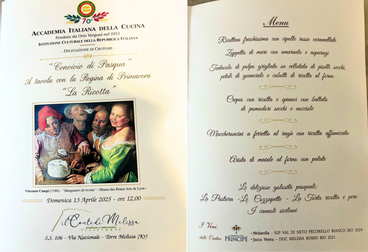 La Delegazione di Crotone, in occasione degli auguri pasquali, ha organizzato una riunione conviviale la Domenica delle Palme presso il ristorante “Il Conte di Melissa”. Prima del pranzo, gli Accademici si sono ritrovati nella sala convegni della Torre Aragonese (1550), dove il Delegato Sergio D’Ippolito ha tenuto una riflessione sull’ingresso di Gesù a Gerusalemme, introducendo poi il tema della conviviale: “A tavola con la regina di primavera: la ricotta”. L’evento è stato molto partecipato e a tavola sono stati serviti piatti a base di ricotta, dalla varietà di antipasti ai primi, fino ai dolci tipici della tradizione pasquale.