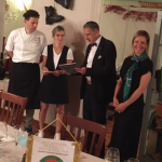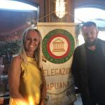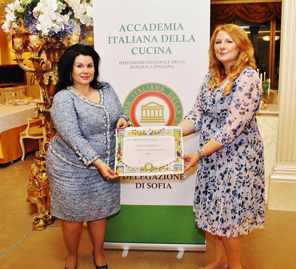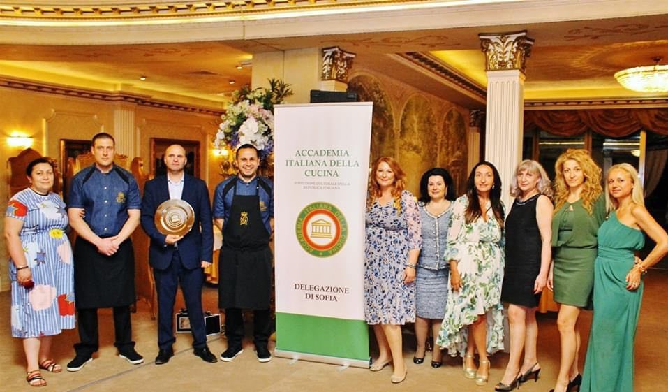La Delegazione di Sofia ha organizzato una riunione conviviale sul tema "Cucina umbra: storie e tradizioni" presso il ristorante Este. Gli chef Kamen Todorov ed Evtim Petkov hanno presentato agli Accademici e agli ospiti un menu d'autore, influenzato dalle tradizioni umbre. Simposiarca della serata l'Accademica Biliana Toncheva (in foto 1 con la Delegata Penka Nesheva) che per l'occasione ha invitato un'ospite speciale: Kamelia Voce (foto 2), chef e cantante soul e jazz vincitrice di tre festival internazionali. Si è voluto creare un legame con l'Umbria non solo attraverso il cibo ma anche attraverso la musica con brani jazz ispirati alla nota manifestazione "Umbria Jazz Festival". Alla fine della serata l'Accademica Toncheva ha omaggiato i presenti con dolci tradizionali, preparati personalmente dalla signora Voce. La Delegazione di Sofia ha celebrato due anni di attività. Foto 3. Academici e da sinistra a destra: chef Evtim Petkov, manager Hristo Georgiev e chef Kamen Todorov.