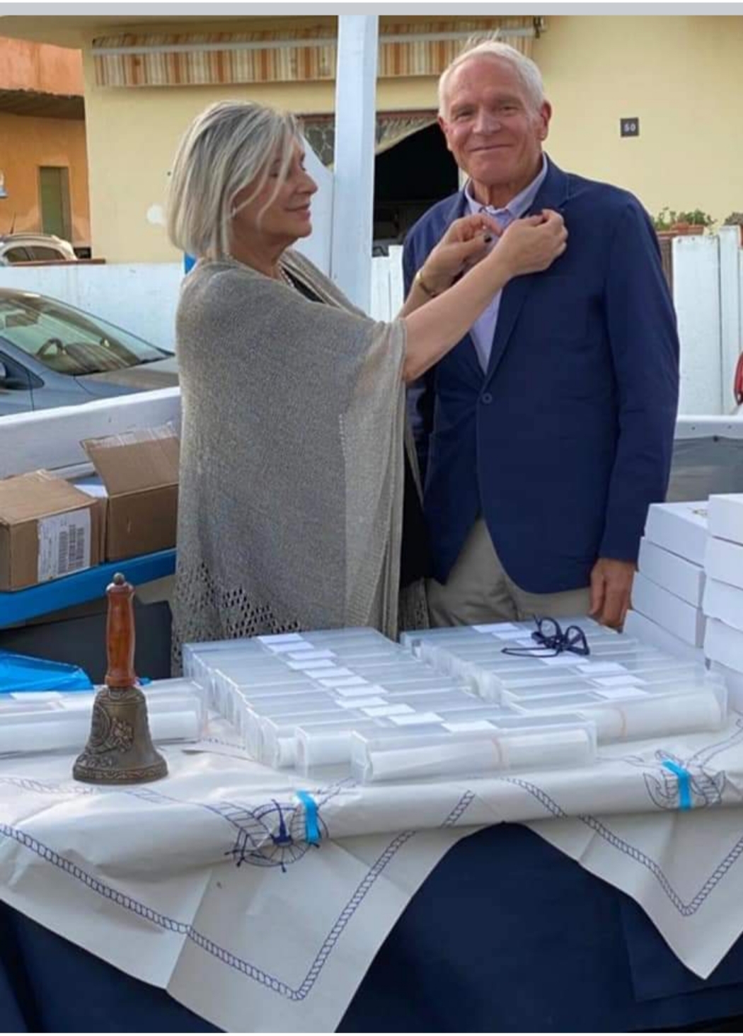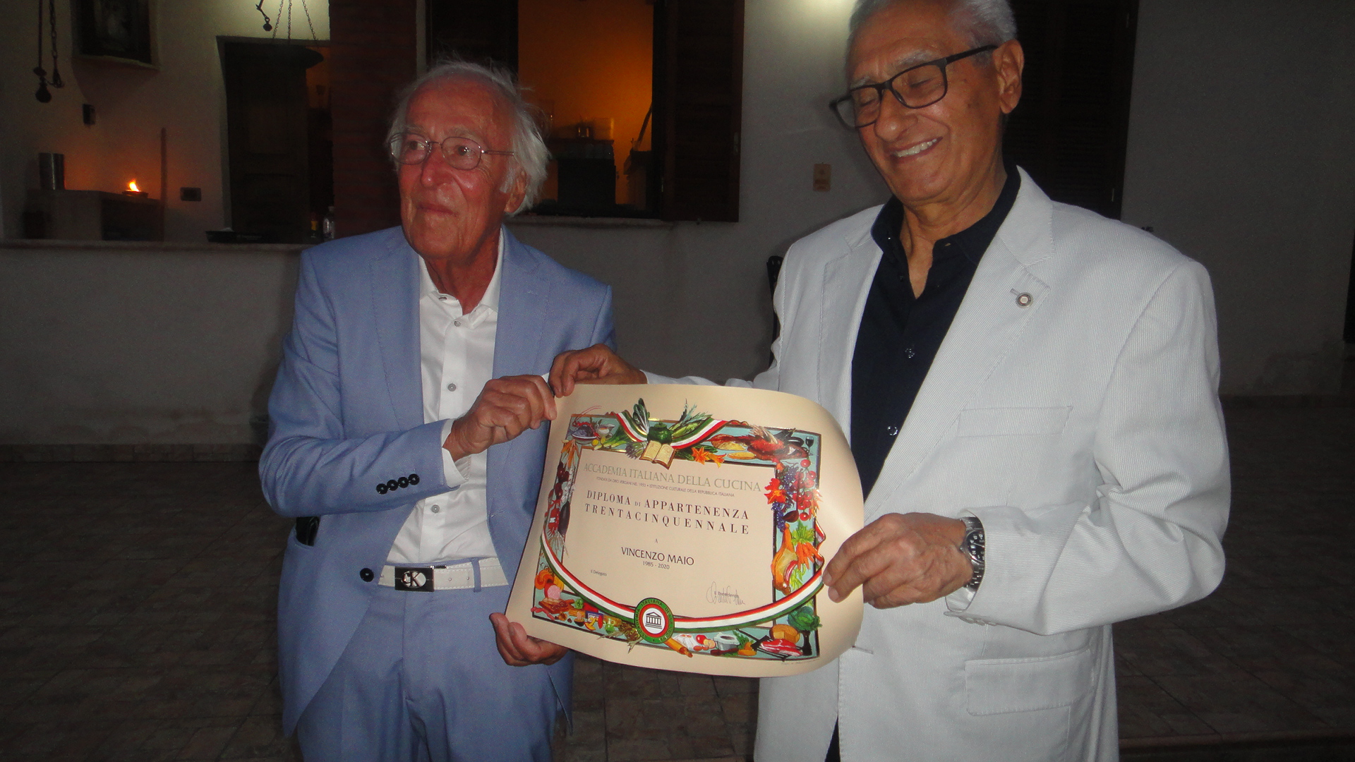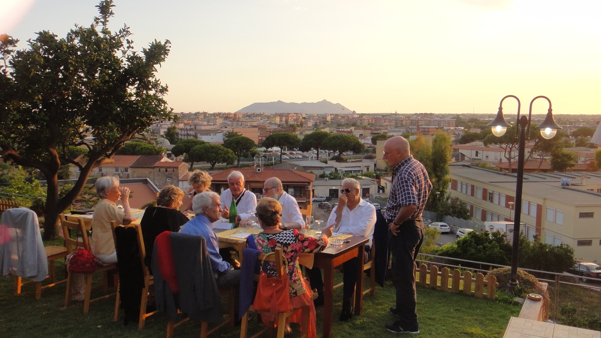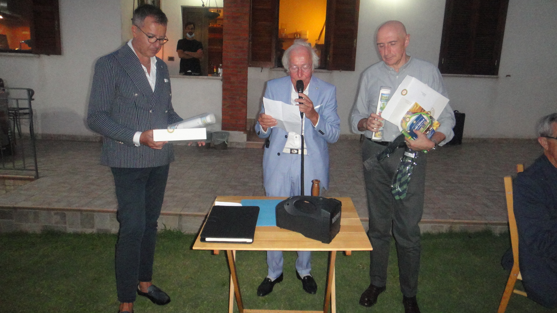 Dopo il periodo d’interruzione, gli Accademici pontini hanno scelto di riunirsi al ristorante “Al Giardino” con tavoli all’aperto e a loro riservato. Di recente inaugurazione, si trova sull’altura di Terracina antica ed è ambientato in un giardino d’aranci tra le rovine di edifici romani, in posizione panoramica sul litorale pontino e sul promontorio del Circeo con tramonto sul mare all’imbrunire. L’incontro si è svolto in un clima di calorosa amicizia per la ritrovata convivialità. Apprezzata la presentazione dell’aperitivo servito all'interno di una grotta sormontata da una volta di pietra che fungeva da fondazione per un palazzo romano. Durante il convivio sono stati consegnati i distintivi dorati e i diplomi di appartenenza trentacinquennale all'Accademia al Delegato Gian Luigi Chizzoni e all'Accademico Vincenzo Maio (foto 1-2, da sinistra Delegato e Accademico). Sono stati anche presentati due nuovi Accademici: Antonio Riggio e Massimo D’Ambrosio (in foto 3 con il Delegato). Foto 4. Un momento della Conviviale.