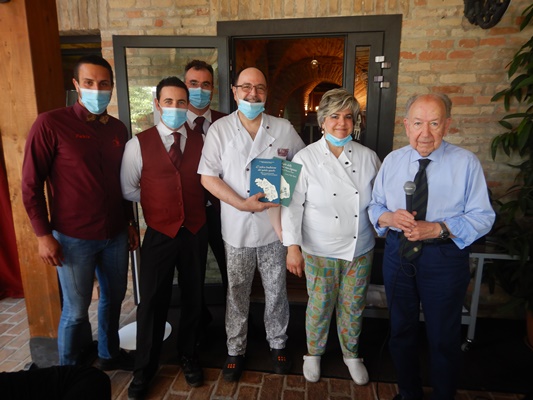 La prima seduta accademica della Delegazione di Macerata si è svolta sulla terrazza del ristorante "Antica Fornace" di Treia. L'arrivo del volume Le Festività religiose nella cucina della tradizione regionale ha motivato la decisione di realizzare il menu previsto nella settimana precedente la Pasqua e che poi si era dovuto annullare. C'è stato quindi il trionfo dell'agnello che tutti hanno apprezzato molto, pur essendo ormai "fuori stagione", perché quelli erano diventati i sapori dimenticati durante le lunghe giornate di "clausura". Come pure si era sentita la mancanza troppo prolungata della convivialità, ed è stato proprio questo l'elemento che ha costituito la maggiore attrattività dell'evento. Ha fatto gli onori di casa il vice Sindaco di Treia, dottor David Buschittari, che ha offerto, a ciascun commensale, un volumetto contenente le frasi più significative del romanzo Giù la piazza non c'è nessuno della scrittrice Dolores Prato. La parte culturale della seduta è stata affidata al professor Diego Poli dell'Università di Macerata (in foto 1), il quale, in un brillante intervento, ha concentrato tutte le eccellenze culturali della città di Treia. Foto 2. Accademici. Foto 3. Il Delegato Ugo Bellesi e il personale di cucina e di servizio.