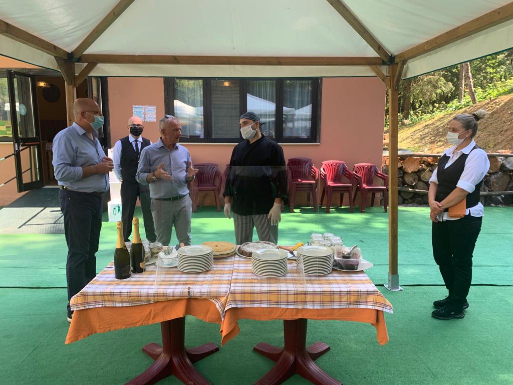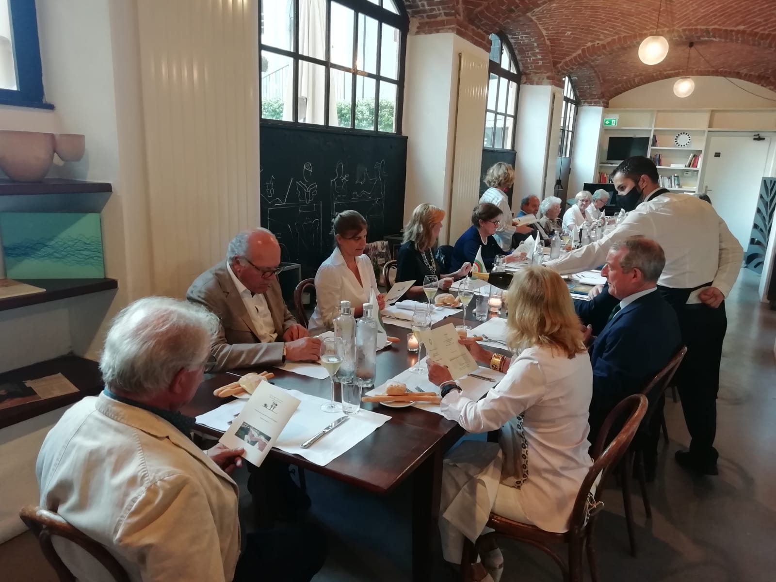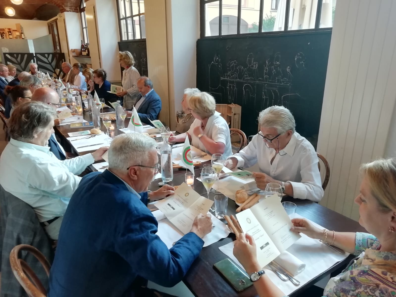 Il convivio di inizio estate si è svolto a Cittadellarte - Fondazione Pistoletto, istituita nel 1998 a Biella dall'artista Michelangelo Pistoletto, esponente principale dell'arte povera, con lo scopo di sviluppare e creare situazioni di coinvolgimento tra arte e società. Il punto ristoro è gestito dalla Famiglia Ramella di Oropa. Per la ripresa delle attività accademiche Ivan Ramella e la Delegata Bertotto hanno creato un menu spiritoso smembrando i piatti tematici quotidianamente proposti, facendoli diventare assaggi unici: carpaccio di tonno ricoperto da nocciole; tartare di fassone, sella di vitello tonnato, rosa di culatello con salsa al passito, piccola piadina con tortino di maccagno, polpettine di broccoli, frittelle di gianchetti, trota salmonata lardellata, funghi fritti, frittelle di acciughe al prezzemolo. La cena si è conclusa con un risotto ai funghi e una rivisitazione di cheesecake con salsa al classico ratafià di Andorno e ciliege flambate al momento da Franco Ramella ed accompagnate da un bicchiere del prezioso liquore. Il servizio è stato impeccabile ed attento. Serata divertente durante la quale è stato distribuito il volume sulle festività religiose e il piatto 2020 al gestore del locale.