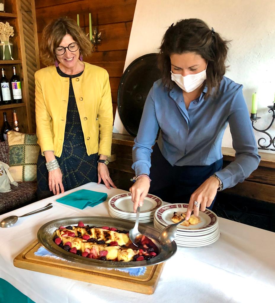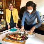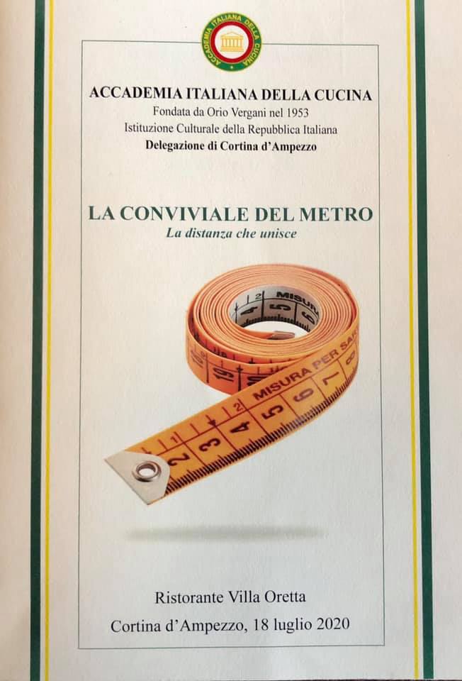 "La Conviviale del metro: la distanza che unisce", è stato questo il tema del primo incontro degli Accademici di Cortina dopo la lunga pausa imposta dalle necessità sanitarie. Il piacere di ritrovarsi, la voglia di ricominciare e l’ottima accoglienza riservata alla Delegazione dal ristorante "Villa Oretta" hanno contribuito a realizzare un gradevolissimo convivio all’insegna di serenità e sicurezza; gli Accademici, guidati dalla Delegata Monica De Mattia con allegria e spirito colloquiale, hanno potuto scegliere tra deliziosi menu di carne e di pesce, ben accompagnati dalla scelta dei vini, e hanno poi prolungato l’incontro sulla terrazza del ristorante, dove si è anche programmata la futura attività dell’associazione. Foto 1. Il menu. Foto 2. Un momento del pranzo. Foto 3. La Delegata Monica De Mattia al taglio del dolce. Foto 4. Risotto di scampi e fiori di zucca.