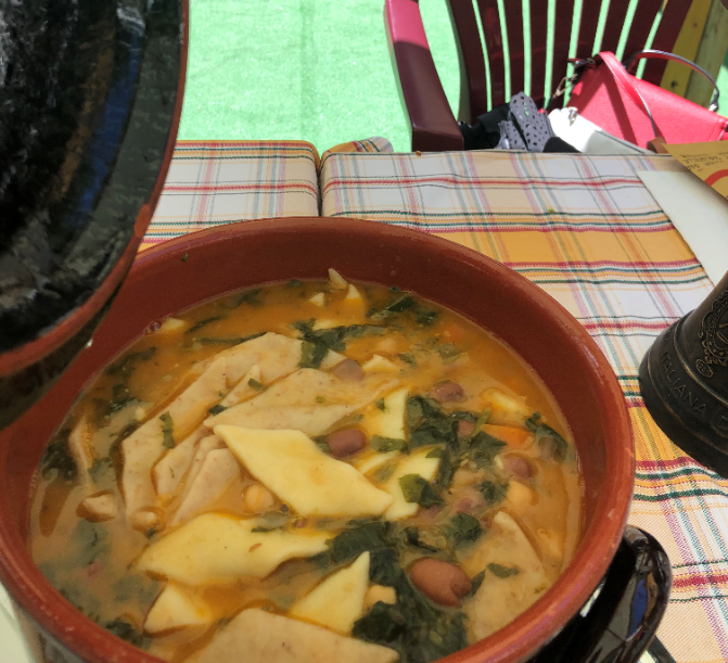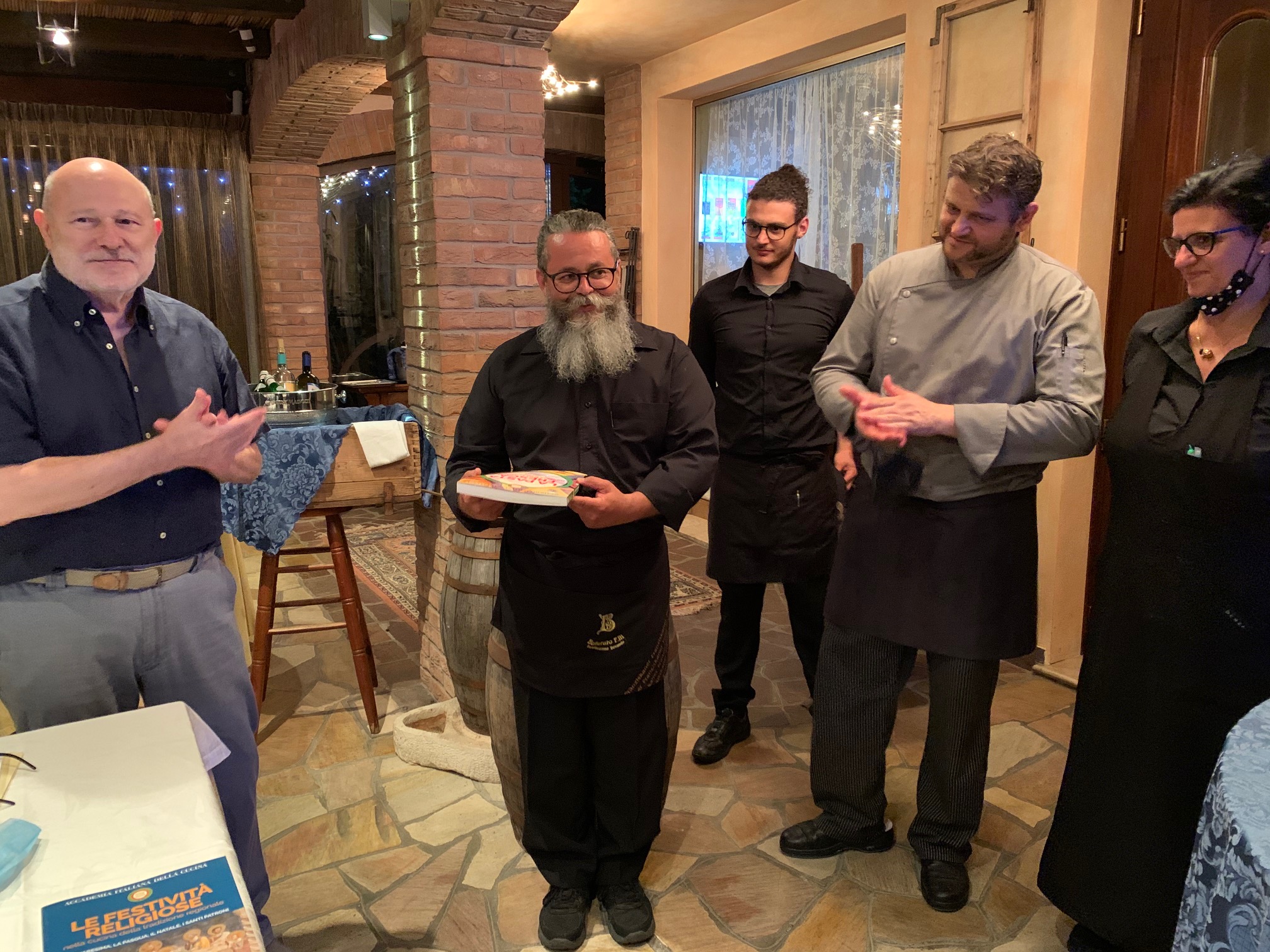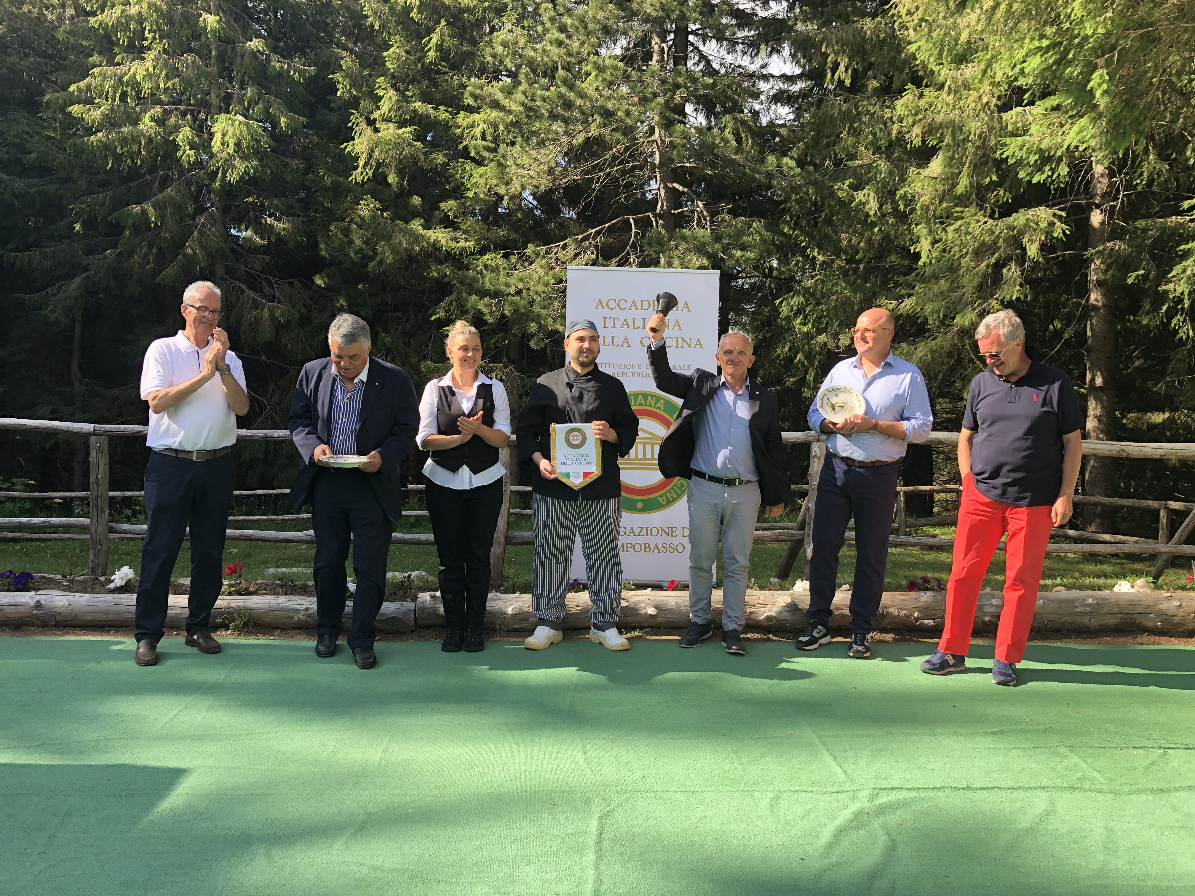 Per la riunione conviviale del ritorno la Delegazione di Campobasso si è ritrovata a Campitello Matese ai piedi del Monte Miletto (2086 m), presso il ristorante "La Pinetina" di Pierpaolo Muccilli. Bella performance del giovane chef Severino Serafino: ottimo l'antipasto di polenta grigliata al capriolo in salmì; sublime la "pentolaccia" zuppa di legumi e orapi, spinacio selvatico che nasce spontaneo e rigoglioso soltanto in quota al limite degli stazzi di bovini al pascolo. Accoppiamento riuscito con il rosso Tintilia, unico vitigno autoctono del Molise.