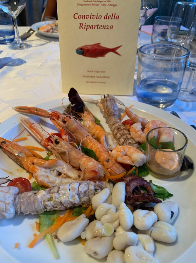 Si è tenuta presso la Trattoria "alla Busa" di San Martino di Venezze (RO) la riunione conviviale della ripartenza a cui ha partecipato un buon numero di Accademici accompagnati dalle proprie consorti. Durante la serata è stata presentata la nuova Accademica Anna Maria Pellegrino (in foto 1 con il Delegato Giorgio Golfetti). Il Delegato ha omaggiato i gestori del locale con alcune pubblicazioni della collana "Biblioteca di Cultura Gastronomica" dell'Accademia (foto 2). Foto 3 e 4. I due piatti che hanno riscosso il maggiore apprezzamento: il mare al vapore e il millefoglie alla crema con scagliette di cioccolato.