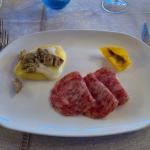 La riunione conviviale del ritorno della Delegazione dell'Alto Vicentino, dedicata ai sapori d'alpeggio, si è tenuta presso la Locanda Seggiovia di Recoaro Terme (VI). Foto 1. Il Delegato al centro con alla sua sinistra la Simposiarca e alla sua destra i titolari del locale. Foto 2. Tavolo con Accademici. Foto 3. Antipasto con polenta, funghi e fusa di formaggio, sopressa locale con peperone all'acciuga. Foto 4. Dolce sbrisolona alla ricotta e gelato alla fioreta.